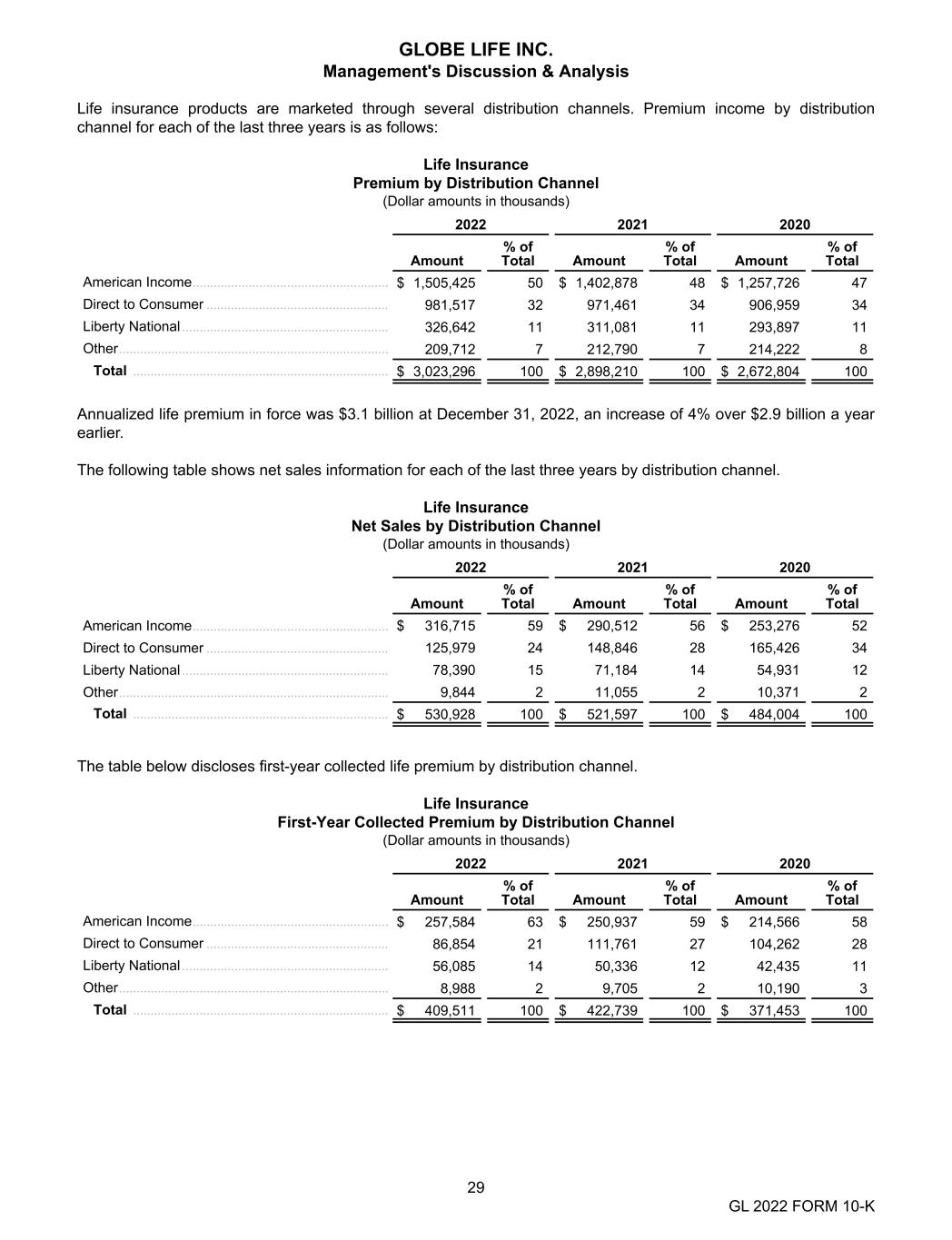 Life insurance products are marketed through several distribution channels. Premium income by distribution channel for each of the last three years is as follows: Life Insurance Premium by Distribution Channel (Dollar amounts in thousands) 2022 2021 2020 Amount % of Total Amount % of Total Amount % of Total American Income........................................................ $ 1,505,425 50 $ 1,402,878 48 $ 1,257,726 47 Direct to Consumer .................................................... 981,517 32 971,461 34 906,959 34 Liberty National ........................................................... 326,642 11 311,081 11 293,897 11 Other............................................................................. 209,712 7 212,790 7 214,222 8 Total ......................................................................... $ 3,023,296 100 $ 2,898,210 100 $ 2,672,804 100 Annualized life premium in force was $3.1 billion at December 31, 2022, an increase of 4% over $2.9 billion a year earlier. The following table shows net sales information for each of the last three years by distribution channel. Life Insurance Net Sales by Distribution Channel (Dollar amounts in thousands) 2022 2021 2020 Amount % of Total Amount % of Total Amount % of Total American Income........................................................ $ 316,715 59 $ 290,512 56 $ 253,276 52 Direct to Consumer .................................................... 125,979 24 148,846 28 165,426 34 Liberty National ........................................................... 78,390 15 71,184 14 54,931 12 Other............................................................................. 9,844 2 11,055 2 10,371 2 Total ......................................................................... $ 530,928 100 $ 521,597 100 $ 484,004 100 The table below discloses first-year collected life premium by distribution channel. Life Insurance First-Year Collected Premium by Distribution Channel (Dollar amounts in thousands) 2022 2021 2020 Amount % of Total Amount % of Total Amount % of Total American Income........................................................ $ 257,584 63 $ 250,937 59 $ 214,566 58 Direct to Consumer .................................................... 86,854 21 111,761 27 104,262 28 Liberty National ........................................................... 56,085 14 50,336 12 42,435 11 Other............................................................................. 8,988 2 9,705 2 10,190 3 Total ......................................................................... $ 409,511 100 $ 422,739 100 $ 371,453 100 GLOBE LIFE INC. Management's Discussion & Analysis 29 GL 2022 FORM 10-K