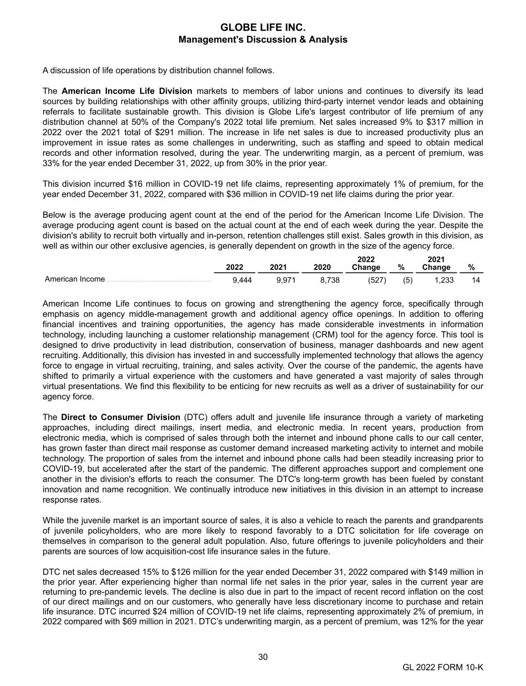 A discussion of life operations by distribution channel follows. The American Income Life Division markets to members of labor unions and continues to diversify its lead sources by building relationships with other affinity groups, utilizing third-party internet vendor leads and obtaining referrals to facilitate sustainable growth. This division is Globe Life's largest contributor of life premium of any distribution channel at 50% of the Company's 2022 total life premium. Net sales increased 9% to $317 million in 2022 over the 2021 total of $291 million. The increase in life net sales is due to increased productivity plus an improvement in issue rates as some challenges in underwriting, such as staffing and speed to obtain medical records and other information resolved, during the year. The underwriting margin, as a percent of premium, was 33% for the year ended December 31, 2022, up from 30% in the prior year. This division incurred $16 million in COVID-19 net life claims, representing approximately 1% of premium, for the year ended December 31, 2022, compared with $36 million in COVID-19 net life claims during the prior year. Below is the average producing agent count at the end of the period for the American Income Life Division. The average producing agent count is based on the actual count at the end of each week during the year. Despite the division's ability to recruit both virtually and in-person, retention challenges still exist. Sales growth in this division, as well as within our other exclusive agencies, is generally dependent on growth in the size of the agency force. 2022 2021 2020 2022 Change % 2021 Change % American Income....................................................... 9,444 9,971 8,738 (527) (5) 1,233 14 American Income Life continues to focus on growing and strengthening the agency force, specifically through emphasis on agency middle-management growth and additional agency office openings. In addition to offering financial incentives and training opportunities, the agency has made considerable investments in information technology, including launching a customer relationship management (CRM) tool for the agency force. This tool is designed to drive productivity in lead distribution, conservation of business, manager dashboards and new agent recruiting. Additionally, this division has invested in and successfully implemented technology that allows the agency force to engage in virtual recruiting, training, and sales activity. Over the course of the pandemic, the agents have shifted to primarily a virtual experience with the customers and have generated a vast majority of sales through virtual presentations. We find this flexibility to be enticing for new recruits as well as a driver of sustainability for our agency force. The Direct to Consumer Division (DTC) offers adult and juvenile life insurance through a variety of marketing approaches, including direct mailings, insert media, and electronic media. In recent years, production from electronic media, which is comprised of sales through both the internet and inbound phone calls to our call center, has grown faster than direct mail response as customer demand increased marketing activity to internet and mobile technology. The proportion of sales from the internet and inbound phone calls had been steadily increasing prior to COVID-19, but accelerated after the start of the pandemic. The different approaches support and complement one another in the division's efforts to reach the consumer. The DTC's long-term growth has been fueled by constant innovation and name recognition. We continually introduce new initiatives in this division in an attempt to increase response rates. While the juvenile market is an important source of sales, it is also a vehicle to reach the parents and grandparents of juvenile policyholders, who are more likely to respond favorably to a DTC solicitation for life coverage on themselves in comparison to the general adult population. Also, future offerings to juvenile policyholders and their parents are sources of low acquisition-cost life insurance sales in the future. DTC net sales decreased 15% to $126 million for the year ended December 31, 2022 compared with $149 million in the prior year. After experiencing higher than normal life net sales in the prior year, sales in the current year are returning to pre-pandemic levels. The decline is also due in part to the impact of recent record inflation on the cost of our direct mailings and on our customers, who generally have less discretionary income to purchase and retain life insurance. DTC incurred $24 million of COVID-19 net life claims, representing approximately 2% of premium, in 2022 compared with $69 million in 2021. DTC’s underwriting margin, as a percent of premium, was 12% for the year GLOBE LIFE INC. Management's Discussion & Analysis 30 GL 2022 FORM 10-K