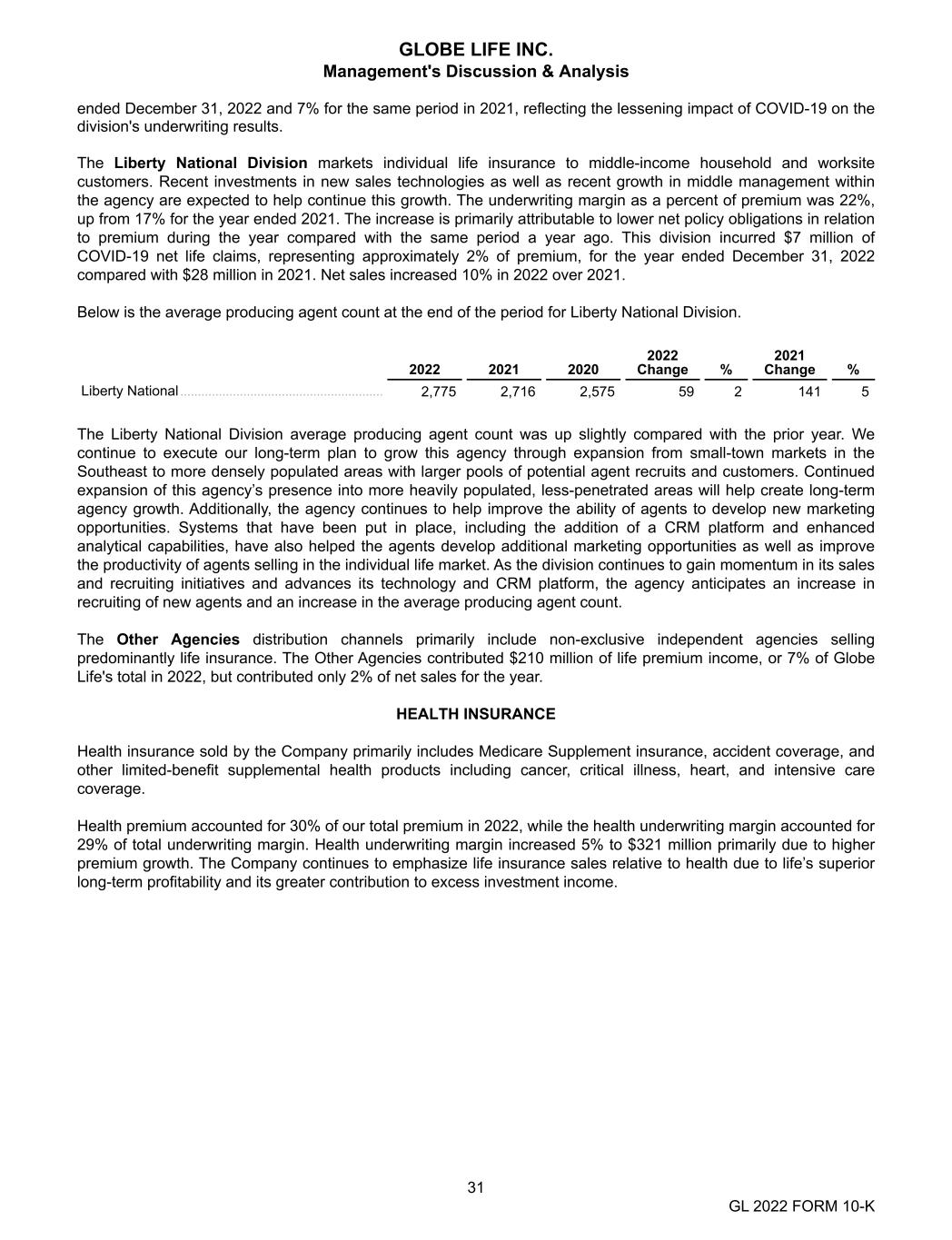 ended December 31, 2022 and 7% for the same period in 2021, reflecting the lessening impact of COVID-19 on the division's underwriting results. The Liberty National Division markets individual life insurance to middle-income household and worksite customers. Recent investments in new sales technologies as well as recent growth in middle management within the agency are expected to help continue this growth. The underwriting margin as a percent of premium was 22%, up from 17% for the year ended 2021. The increase is primarily attributable to lower net policy obligations in relation to premium during the year compared with the same period a year ago. This division incurred $7 million of COVID-19 net life claims, representing approximately 2% of premium, for the year ended December 31, 2022 compared with $28 million in 2021. Net sales increased 10% in 2022 over 2021. Below is the average producing agent count at the end of the period for Liberty National Division. 2022 2021 2020 2022 Change % 2021 Change % Liberty National .......................................................... 2,775 2,716 2,575 59 2 141 5 The Liberty National Division average producing agent count was up slightly compared with the prior year. We continue to execute our long-term plan to grow this agency through expansion from small-town markets in the Southeast to more densely populated areas with larger pools of potential agent recruits and customers. Continued expansion of this agency’s presence into more heavily populated, less-penetrated areas will help create long-term agency growth. Additionally, the agency continues to help improve the ability of agents to develop new marketing opportunities. Systems that have been put in place, including the addition of a CRM platform and enhanced analytical capabilities, have also helped the agents develop additional marketing opportunities as well as improve the productivity of agents selling in the individual life market. As the division continues to gain momentum in its sales and recruiting initiatives and advances its technology and CRM platform, the agency anticipates an increase in recruiting of new agents and an increase in the average producing agent count. The Other Agencies distribution channels primarily include non-exclusive independent agencies selling predominantly life insurance. The Other Agencies contributed $210 million of life premium income, or 7% of Globe Life's total in 2022, but contributed only 2% of net sales for the year. HEALTH INSURANCE Health insurance sold by the Company primarily includes Medicare Supplement insurance, accident coverage, and other limited-benefit supplemental health products including cancer, critical illness, heart, and intensive care coverage. Health premium accounted for 30% of our total premium in 2022, while the health underwriting margin accounted for 29% of total underwriting margin. Health underwriting margin increased 5% to $321 million primarily due to higher premium growth. The Company continues to emphasize life insurance sales relative to health due to life’s superior long-term profitability and its greater contribution to excess investment income. GLOBE LIFE INC. Management's Discussion & Analysis 31 GL 2022 FORM 10-K