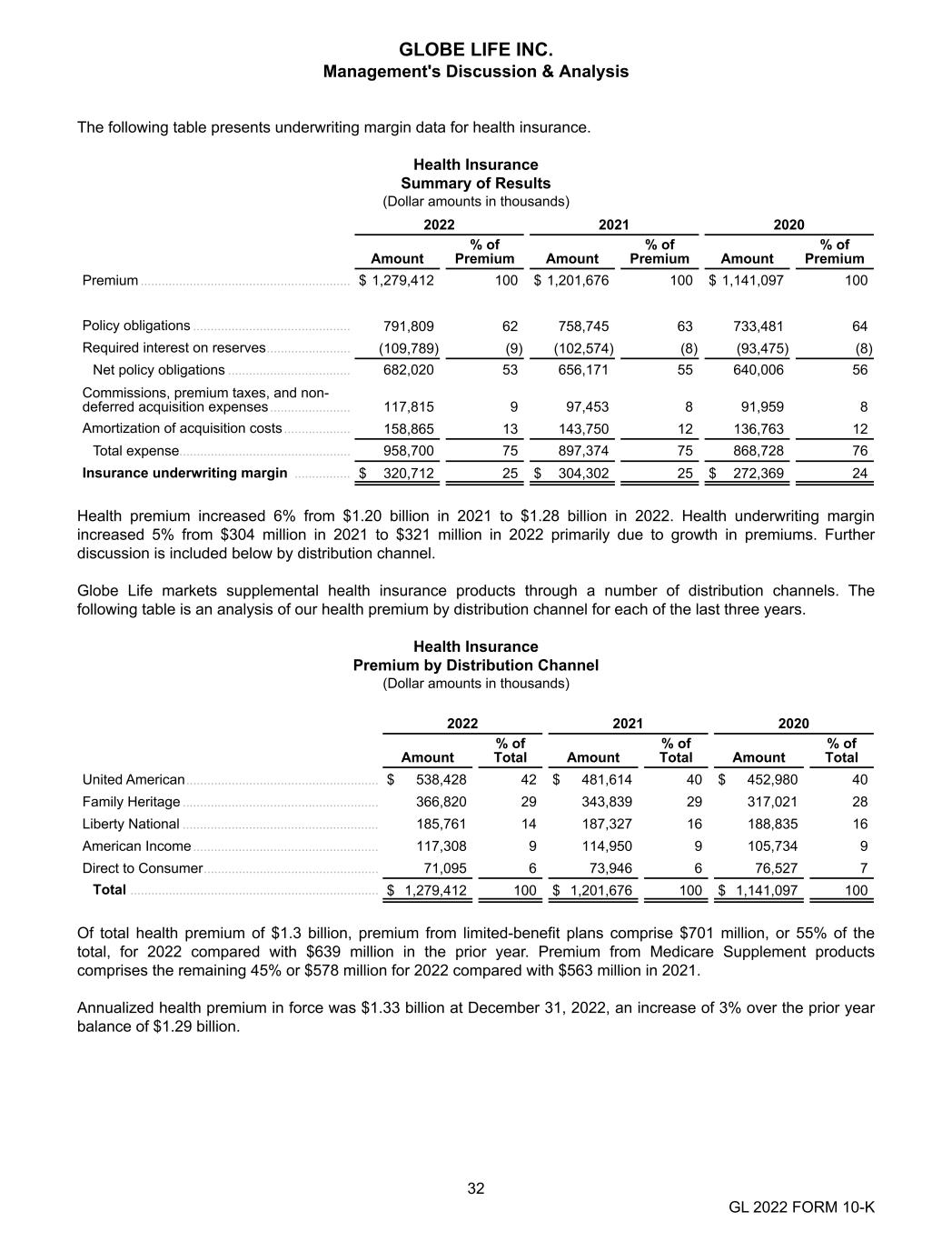 The following table presents underwriting margin data for health insurance. Health Insurance Summary of Results (Dollar amounts in thousands) 2022 2021 2020 Amount % of Premium Amount % of Premium Amount % of Premium Premium ............................................................ $ 1,279,412 100 $ 1,201,676 100 $ 1,141,097 100 Policy obligations ............................................. 791,809 62 758,745 63 733,481 64 Required interest on reserves........................ (109,789) (9) (102,574) (8) (93,475) (8) Net policy obligations ................................... 682,020 53 656,171 55 640,006 56 Commissions, premium taxes, and non- deferred acquisition expenses ....................... 117,815 9 97,453 8 91,959 8 Amortization of acquisition costs ................... 158,865 13 143,750 12 136,763 12 Total expense................................................. 958,700 75 897,374 75 868,728 76 Insurance underwriting margin ................ $ 320,712 25 $ 304,302 25 $ 272,369 24 Health premium increased 6% from $1.20 billion in 2021 to $1.28 billion in 2022. Health underwriting margin increased 5% from $304 million in 2021 to $321 million in 2022 primarily due to growth in premiums. Further discussion is included below by distribution channel. Globe Life markets supplemental health insurance products through a number of distribution channels. The following table is an analysis of our health premium by distribution channel for each of the last three years. Health Insurance Premium by Distribution Channel (Dollar amounts in thousands) 2022 2021 2020 Amount % of Total Amount % of Total Amount % of Total United American....................................................... $ 538,428 42 $ 481,614 40 $ 452,980 40 Family Heritage ........................................................ 366,820 29 343,839 29 317,021 28 Liberty National ........................................................ 185,761 14 187,327 16 188,835 16 American Income ..................................................... 117,308 9 114,950 9 105,734 9 Direct to Consumer.................................................. 71,095 6 73,946 6 76,527 7 Total ....................................................................... $ 1,279,412 100 $ 1,201,676 100 $ 1,141,097 100 Of total health premium of $1.3 billion, premium from limited-benefit plans comprise $701 million, or 55% of the total, for 2022 compared with $639 million in the prior year. Premium from Medicare Supplement products comprises the remaining 45% or $578 million for 2022 compared with $563 million in 2021. Annualized health premium in force was $1.33 billion at December 31, 2022, an increase of 3% over the prior year balance of $1.29 billion. GLOBE LIFE INC. Management's Discussion & Analysis 32 GL 2022 FORM 10-K