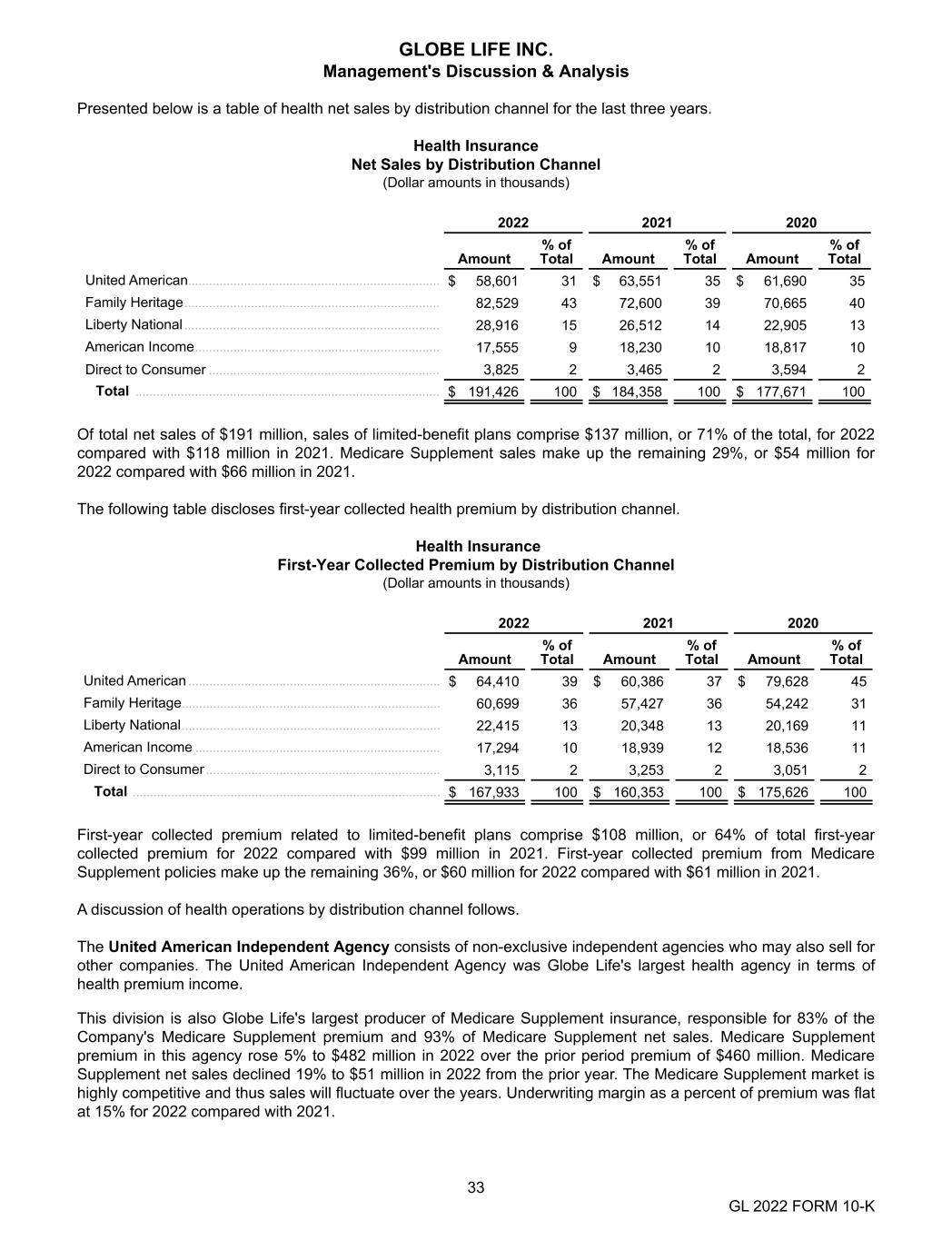 Presented below is a table of health net sales by distribution channel for the last three years. Health Insurance Net Sales by Distribution Channel (Dollar amounts in thousands) 2022 2021 2020 Amount % of Total Amount % of Total Amount % of Total United American........................................................................ $ 58,601 31 $ 63,551 35 $ 61,690 35 Family Heritage......................................................................... 82,529 43 72,600 39 70,665 40 Liberty National ......................................................................... 28,916 15 26,512 14 22,905 13 American Income...................................................................... 17,555 9 18,230 10 18,817 10 Direct to Consumer .................................................................. 3,825 2 3,465 2 3,594 2 Total ....................................................................................... $ 191,426 100 $ 184,358 100 $ 177,671 100 Of total net sales of $191 million, sales of limited-benefit plans comprise $137 million, or 71% of the total, for 2022 compared with $118 million in 2021. Medicare Supplement sales make up the remaining 29%, or $54 million for 2022 compared with $66 million in 2021. The following table discloses first-year collected health premium by distribution channel. Health Insurance First-Year Collected Premium by Distribution Channel (Dollar amounts in thousands) 2022 2021 2020 Amount % of Total Amount % of Total Amount % of Total United American ........................................................................ $ 64,410 39 $ 60,386 37 $ 79,628 45 Family Heritage.......................................................................... 60,699 36 57,427 36 54,242 31 Liberty National.......................................................................... 22,415 13 20,348 13 20,169 11 American Income ...................................................................... 17,294 10 18,939 12 18,536 11 Direct to Consumer ................................................................... 3,115 2 3,253 2 3,051 2 Total ........................................................................................ $ 167,933 100 $ 160,353 100 $ 175,626 100 First-year collected premium related to limited-benefit plans comprise $108 million, or 64% of total first-year collected premium for 2022 compared with $99 million in 2021. First-year collected premium from Medicare Supplement policies make up the remaining 36%, or $60 million for 2022 compared with $61 million in 2021. A discussion of health operations by distribution channel follows. The United American Independent Agency consists of non-exclusive independent agencies who may also sell for other companies. The United American Independent Agency was Globe Life's largest health agency in terms of health premium income. This division is also Globe Life's largest producer of Medicare Supplement insurance, responsible for 83% of the Company's Medicare Supplement premium and 93% of Medicare Supplement net sales. Medicare Supplement premium in this agency rose 5% to $482 million in 2022 over the prior period premium of $460 million. Medicare Supplement net sales declined 19% to $51 million in 2022 from the prior year. The Medicare Supplement market is highly competitive and thus sales will fluctuate over the years. Underwriting margin as a percent of premium was flat at 15% for 2022 compared with 2021. GLOBE LIFE INC. Management's Discussion & Analysis 33 GL 2022 FORM 10-K