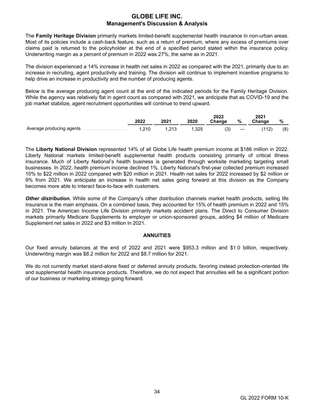 The Family Heritage Division primarily markets limited-benefit supplemental health insurance in non-urban areas. Most of its policies include a cash-back feature, such as a return of premium, where any excess of premiums over claims paid is returned to the policyholder at the end of a specified period stated within the insurance policy. Underwriting margin as a percent of premium in 2022 was 27%, the same as in 2021. The division experienced a 14% increase in health net sales in 2022 as compared with the 2021, primarily due to an increase in recruiting, agent productivity and training. The division will continue to implement incentive programs to help drive an increase in productivity and the number of producing agents. Below is the average producing agent count at the end of the indicated periods for the Family Heritage Division. While the agency was relatively flat in agent count as compared with 2021, we anticipate that as COVID-19 and the job market stabilize, agent recruitment opportunities will continue to trend upward. 2022 2021 2020 2022 Change % 2021 Change % Average producing agents ....................................... 1,210 1,213 1,325 (3) — (112) (8) The Liberty National Division represented 14% of all Globe Life health premium income at $186 million in 2022. Liberty National markets limited-benefit supplemental health products consisting primarily of critical illness insurance. Much of Liberty National’s health business is generated through worksite marketing targeting small businesses. In 2022, health premium income declined 1%. Liberty National's first-year collected premium increased 10% to $22 million in 2022 compared with $20 million in 2021. Health net sales for 2022 increased by $2 million or 9% from 2021. We anticipate an increase in health net sales going forward at this division as the Company becomes more able to interact face-to-face with customers. Other distribution. While some of the Company's other distribution channels market health products, selling life insurance is the main emphasis. On a combined basis, they accounted for 15% of health premium in 2022 and 15% in 2021. The American Income Life Division primarily markets accident plans. The Direct to Consumer Division markets primarily Medicare Supplements to employer or union-sponsored groups, adding $4 million of Medicare Supplement net sales in 2022 and $3 million in 2021. ANNUITIES Our fixed annuity balances at the end of 2022 and 2021 were $953.3 million and $1.0 billion, respectively. Underwriting margin was $8.2 million for 2022 and $8.7 million for 2021. We do not currently market stand-alone fixed or deferred annuity products, favoring instead protection-oriented life and supplemental health insurance products. Therefore, we do not expect that annuities will be a significant portion of our business or marketing strategy going forward. GLOBE LIFE INC. Management's Discussion & Analysis 34 GL 2022 FORM 10-K
