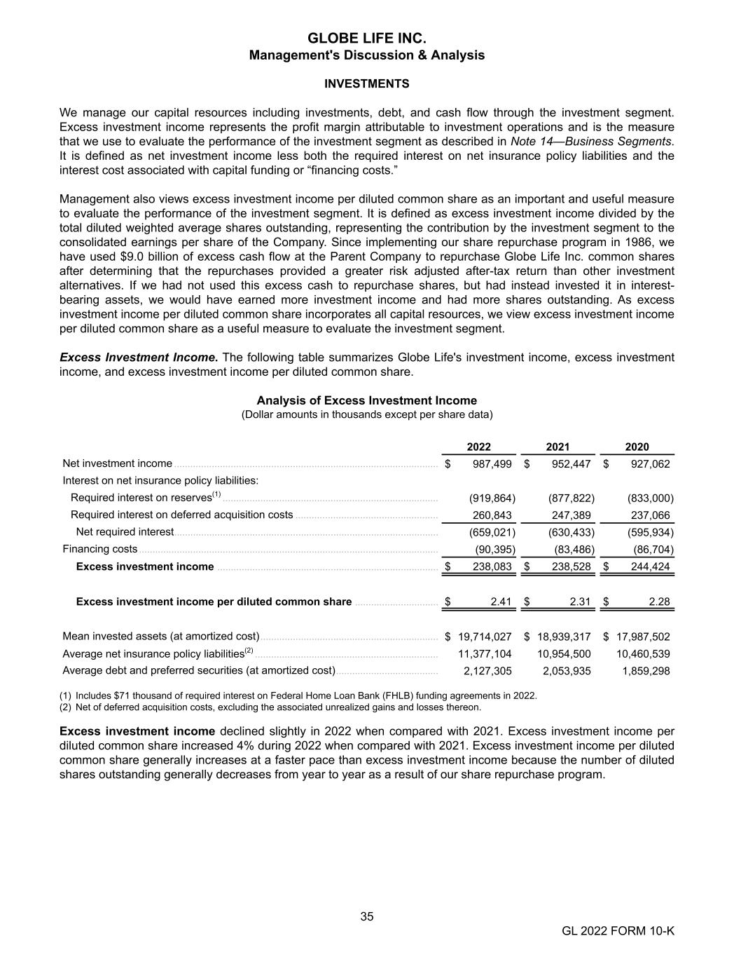 INVESTMENTS We manage our capital resources including investments, debt, and cash flow through the investment segment. Excess investment income represents the profit margin attributable to investment operations and is the measure that we use to evaluate the performance of the investment segment as described in Note 14—Business Segments. It is defined as net investment income less both the required interest on net insurance policy liabilities and the interest cost associated with capital funding or “financing costs.” Management also views excess investment income per diluted common share as an important and useful measure to evaluate the performance of the investment segment. It is defined as excess investment income divided by the total diluted weighted average shares outstanding, representing the contribution by the investment segment to the consolidated earnings per share of the Company. Since implementing our share repurchase program in 1986, we have used $9.0 billion of excess cash flow at the Parent Company to repurchase Globe Life Inc. common shares after determining that the repurchases provided a greater risk adjusted after-tax return than other investment alternatives. If we had not used this excess cash to repurchase shares, but had instead invested it in interest- bearing assets, we would have earned more investment income and had more shares outstanding. As excess investment income per diluted common share incorporates all capital resources, we view excess investment income per diluted common share as a useful measure to evaluate the investment segment. Excess Investment Income. The following table summarizes Globe Life's investment income, excess investment income, and excess investment income per diluted common share. Analysis of Excess Investment Income (Dollar amounts in thousands except per share data) 2022 2021 2020 Net investment income .................................................................................................. $ 987,499 $ 952,447 $ 927,062 Interest on net insurance policy liabilities: Required interest on reserves(1) ................................................................................ (919,864) (877,822) (833,000) Required interest on deferred acquisition costs ..................................................... 260,843 247,389 237,066 Net required interest.................................................................................................. (659,021) (630,433) (595,934) Financing costs ............................................................................................................... (90,395) (83,486) (86,704) Excess investment income .................................................................................. $ 238,083 $ 238,528 $ 244,424 Excess investment income per diluted common share ............................... $ 2.41 $ 2.31 $ 2.28 Mean invested assets (at amortized cost) .................................................................. $ 19,714,027 $ 18,939,317 $ 17,987,502 Average net insurance policy liabilities(2) .................................................................... 11,377,104 10,954,500 10,460,539 Average debt and preferred securities (at amortized cost)...................................... 2,127,305 2,053,935 1,859,298 (1) Includes $71 thousand of required interest on Federal Home Loan Bank (FHLB) funding agreements in 2022. (2) Net of deferred acquisition costs, excluding the associated unrealized gains and losses thereon. Excess investment income declined slightly in 2022 when compared with 2021. Excess investment income per diluted common share increased 4% during 2022 when compared with 2021. Excess investment income per diluted common share generally increases at a faster pace than excess investment income because the number of diluted shares outstanding generally decreases from year to year as a result of our share repurchase program. GLOBE LIFE INC. Management's Discussion & Analysis 35 GL 2022 FORM 10-K