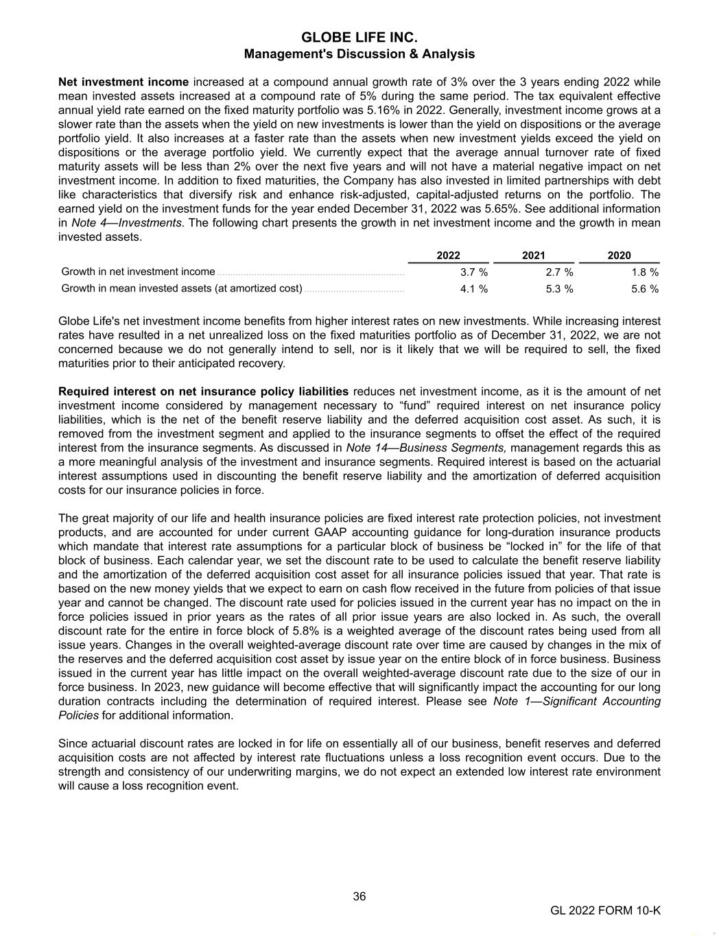 Net investment income increased at a compound annual growth rate of 3% over the 3 years ending 2022 while mean invested assets increased at a compound rate of 5% during the same period. The tax equivalent effective annual yield rate earned on the fixed maturity portfolio was 5.16% in 2022. Generally, investment income grows at a slower rate than the assets when the yield on new investments is lower than the yield on dispositions or the average portfolio yield. It also increases at a faster rate than the assets when new investment yields exceed the yield on dispositions or the average portfolio yield. We currently expect that the average annual turnover rate of fixed maturity assets will be less than 2% over the next five years and will not have a material negative impact on net investment income. In addition to fixed maturities, the Company has also invested in limited partnerships with debt like characteristics that diversify risk and enhance risk-adjusted, capital-adjusted returns on the portfolio. The earned yield on the investment funds for the year ended December 31, 2022 was 5.65%. See additional information in Note 4—Investments. The following chart presents the growth in net investment income and the growth in mean invested assets. 2022 2021 2020 Growth in net investment income ....................................................................... 3.7 % 2.7 % 1.8 % Growth in mean invested assets (at amortized cost) ...................................... 4.1 % 5.3 % 5.6 % Globe Life's net investment income benefits from higher interest rates on new investments. While increasing interest rates have resulted in a net unrealized loss on the fixed maturities portfolio as of December 31, 2022, we are not concerned because we do not generally intend to sell, nor is it likely that we will be required to sell, the fixed maturities prior to their anticipated recovery. Required interest on net insurance policy liabilities reduces net investment income, as it is the amount of net investment income considered by management necessary to “fund” required interest on net insurance policy liabilities, which is the net of the benefit reserve liability and the deferred acquisition cost asset. As such, it is removed from the investment segment and applied to the insurance segments to offset the effect of the required interest from the insurance segments. As discussed in Note 14—Business Segments, management regards this as a more meaningful analysis of the investment and insurance segments. Required interest is based on the actuarial interest assumptions used in discounting the benefit reserve liability and the amortization of deferred acquisition costs for our insurance policies in force. The great majority of our life and health insurance policies are fixed interest rate protection policies, not investment products, and are accounted for under current GAAP accounting guidance for long-duration insurance products which mandate that interest rate assumptions for a particular block of business be “locked in” for the life of that block of business. Each calendar year, we set the discount rate to be used to calculate the benefit reserve liability and the amortization of the deferred acquisition cost asset for all insurance policies issued that year. That rate is based on the new money yields that we expect to earn on cash flow received in the future from policies of that issue year and cannot be changed. The discount rate used for policies issued in the current year has no impact on the in force policies issued in prior years as the rates of all prior issue years are also locked in. As such, the overall discount rate for the entire in force block of 5.8% is a weighted average of the discount rates being used from all issue years. Changes in the overall weighted-average discount rate over time are caused by changes in the mix of the reserves and the deferred acquisition cost asset by issue year on the entire block of in force business. Business issued in the current year has little impact on the overall weighted-average discount rate due to the size of our in force business. In 2023, new guidance will become effective that will significantly impact the accounting for our long duration contracts including the determination of required interest. Please see Note 1—Significant Accounting Policies for additional information. Since actuarial discount rates are locked in for life on essentially all of our business, benefit reserves and deferred acquisition costs are not affected by interest rate fluctuations unless a loss recognition event occurs. Due to the strength and consistency of our underwriting margins, we do not expect an extended low interest rate environment will cause a loss recognition event. GLOBE LIFE INC. Management's Discussion & Analysis 36 GL 2022 FORM 10-K
