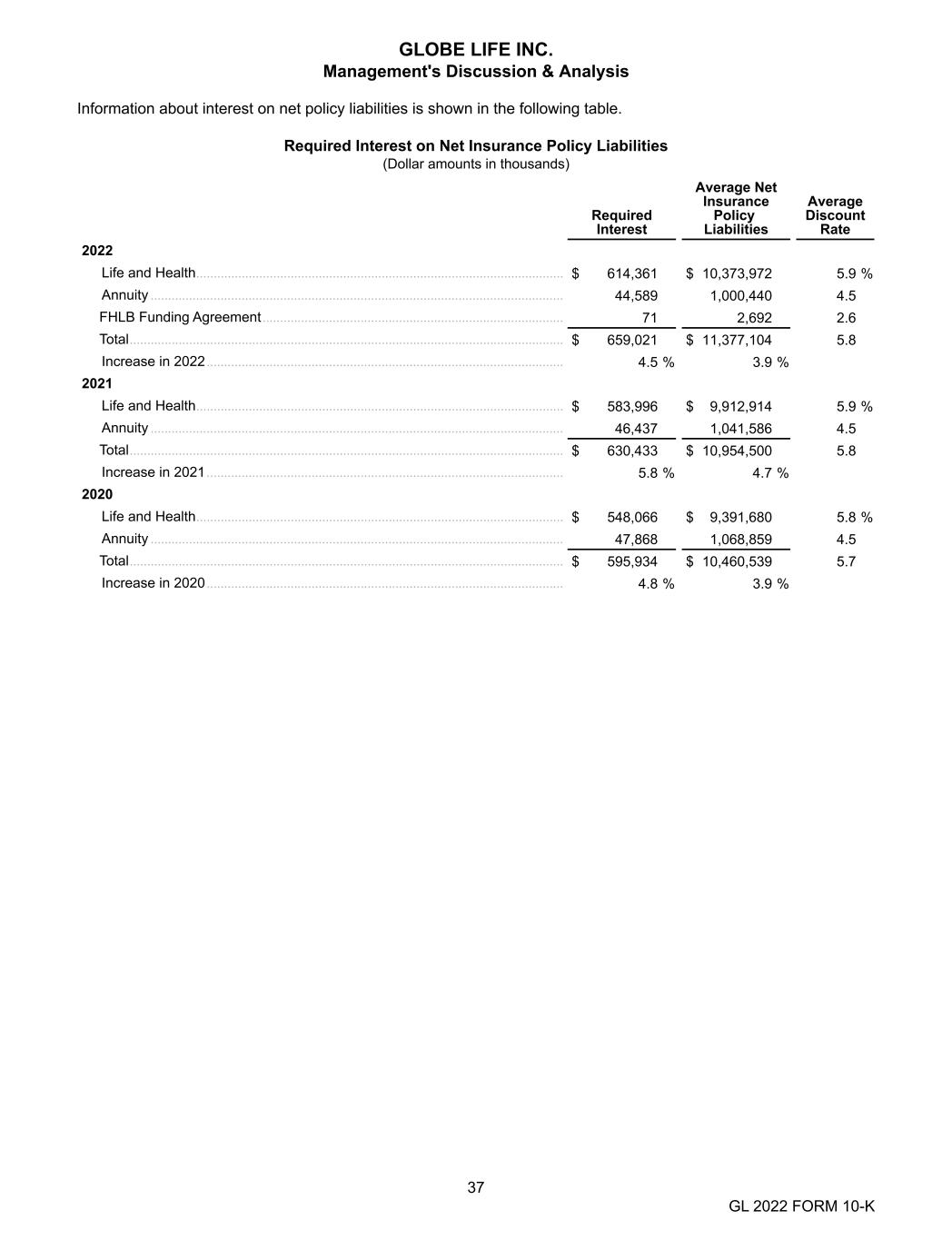 Information about interest on net policy liabilities is shown in the following table. Required Interest on Net Insurance Policy Liabilities (Dollar amounts in thousands) Required Interest Average Net Insurance Policy Liabilities Average Discount Rate 2022 Life and Health......................................................................................................... $ 614,361 $ 10,373,972 5.9 % Annuity ...................................................................................................................... 44,589 1,000,440 4.5 FHLB Funding Agreement ...................................................................................... 71 2,692 2.6 Total............................................................................................................................ $ 659,021 $ 11,377,104 5.8 Increase in 2022 ...................................................................................................... 4.5 % 3.9 % 2021 Life and Health......................................................................................................... $ 583,996 $ 9,912,914 5.9 % Annuity ...................................................................................................................... 46,437 1,041,586 4.5 Total............................................................................................................................ $ 630,433 $ 10,954,500 5.8 Increase in 2021 ...................................................................................................... 5.8 % 4.7 % 2020 Life and Health......................................................................................................... $ 548,066 $ 9,391,680 5.8 % Annuity ...................................................................................................................... 47,868 1,068,859 4.5 Total............................................................................................................................ $ 595,934 $ 10,460,539 5.7 Increase in 2020 ...................................................................................................... 4.8 % 3.9 % GLOBE LIFE INC. Management's Discussion & Analysis 37 GL 2022 FORM 10-K