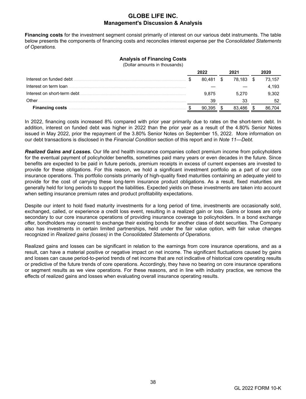 Financing costs for the investment segment consist primarily of interest on our various debt instruments. The table below presents the components of financing costs and reconciles interest expense per the Consolidated Statements of Operations. Analysis of Financing Costs (Dollar amounts in thousands) 2022 2021 2020 Interest on funded debt .................................................................................................... $ 80,481 $ 78,183 $ 73,157 Interest on term loan......................................................................................................... — — 4,193 Interest on short-term debt .............................................................................................. 9,875 5,270 9,302 Other.................................................................................................................................... 39 33 52 Financing costs ........................................................................................................ $ 90,395 $ 83,486 $ 86,704 In 2022, financing costs increased 8% compared with prior year primarily due to rates on the short-term debt. In addition, interest on funded debt was higher in 2022 than the prior year as a result of the 4.80% Senior Notes issued in May 2022, prior the repayment of the 3.80% Senior Notes on September 15, 2022. More information on our debt transactions is disclosed in the Financial Condition section of this report and in Note 11—Debt. Realized Gains and Losses. Our life and health insurance companies collect premium income from policyholders for the eventual payment of policyholder benefits, sometimes paid many years or even decades in the future. Since benefits are expected to be paid in future periods, premium receipts in excess of current expenses are invested to provide for these obligations. For this reason, we hold a significant investment portfolio as a part of our core insurance operations. This portfolio consists primarily of high-quality fixed maturities containing an adequate yield to provide for the cost of carrying these long-term insurance product obligations. As a result, fixed maturities are generally held for long periods to support the liabilities. Expected yields on these investments are taken into account when setting insurance premium rates and product profitability expectations. Despite our intent to hold fixed maturity investments for a long period of time, investments are occasionally sold, exchanged, called, or experience a credit loss event, resulting in a realized gain or loss. Gains or losses are only secondary to our core insurance operations of providing insurance coverage to policyholders. In a bond exchange offer, bondholders may consent to exchange their existing bonds for another class of debt securities. The Company also has investments in certain limited partnerships, held under the fair value option, with fair value changes recognized in Realized gains (losses) in the Consolidated Statements of Operations. Realized gains and losses can be significant in relation to the earnings from core insurance operations, and as a result, can have a material positive or negative impact on net income. The significant fluctuations caused by gains and losses can cause period-to-period trends of net income that are not indicative of historical core operating results or predictive of the future trends of core operations. Accordingly, they have no bearing on core insurance operations or segment results as we view operations. For these reasons, and in line with industry practice, we remove the effects of realized gains and losses when evaluating overall insurance operating results. GLOBE LIFE INC. Management's Discussion & Analysis 38 GL 2022 FORM 10-K