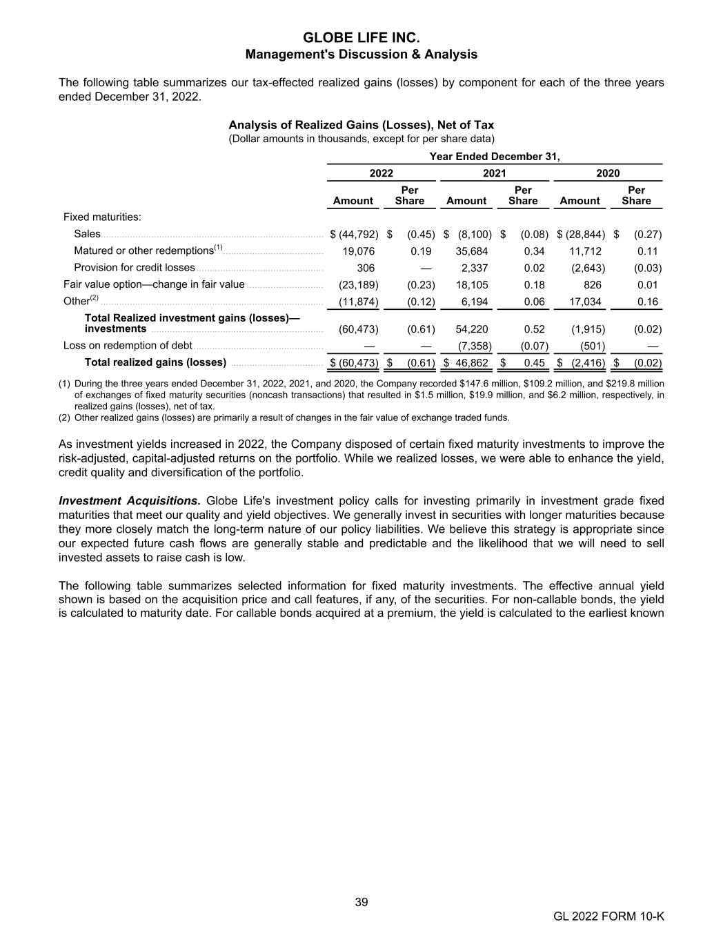 The following table summarizes our tax-effected realized gains (losses) by component for each of the three years ended December 31, 2022. Analysis of Realized Gains (Losses), Net of Tax (Dollar amounts in thousands, except for per share data) Year Ended December 31, 2022 2021 2020 Amount Per Share Amount Per Share Amount Per Share Fixed maturities: Sales.................................................................................... $ (44,792) $ (0.45) $ (8,100) $ (0.08) $ (28,844) $ (0.27) Matured or other redemptions(1)...................................... 19,076 0.19 35,684 0.34 11,712 0.11 Provision for credit losses ................................................ 306 — 2,337 0.02 (2,643) (0.03) Fair value option—change in fair value ............................. (23,189) (0.23) 18,105 0.18 826 0.01 Other(2) .................................................................................... (11,874) (0.12) 6,194 0.06 17,034 0.16 Total Realized investment gains (losses)— investments ................................................................. (60,473) (0.61) 54,220 0.52 (1,915) (0.02) Loss on redemption of debt ................................................. — — (7,358) (0.07) (501) — Total realized gains (losses) ................................... $ (60,473) $ (0.61) $ 46,862 $ 0.45 $ (2,416) $ (0.02) (1) During the three years ended December 31, 2022, 2021, and 2020, the Company recorded $147.6 million, $109.2 million, and $219.8 million of exchanges of fixed maturity securities (noncash transactions) that resulted in $1.5 million, $19.9 million, and $6.2 million, respectively, in realized gains (losses), net of tax. (2) Other realized gains (losses) are primarily a result of changes in the fair value of exchange traded funds. As investment yields increased in 2022, the Company disposed of certain fixed maturity investments to improve the risk-adjusted, capital-adjusted returns on the portfolio. While we realized losses, we were able to enhance the yield, credit quality and diversification of the portfolio. Investment Acquisitions. Globe Life's investment policy calls for investing primarily in investment grade fixed maturities that meet our quality and yield objectives. We generally invest in securities with longer maturities because they more closely match the long-term nature of our policy liabilities. We believe this strategy is appropriate since our expected future cash flows are generally stable and predictable and the likelihood that we will need to sell invested assets to raise cash is low. The following table summarizes selected information for fixed maturity investments. The effective annual yield shown is based on the acquisition price and call features, if any, of the securities. For non-callable bonds, the yield is calculated to maturity date. For callable bonds acquired at a premium, the yield is calculated to the earliest known GLOBE LIFE INC. Management's Discussion & Analysis 39 GL 2022 FORM 10-K