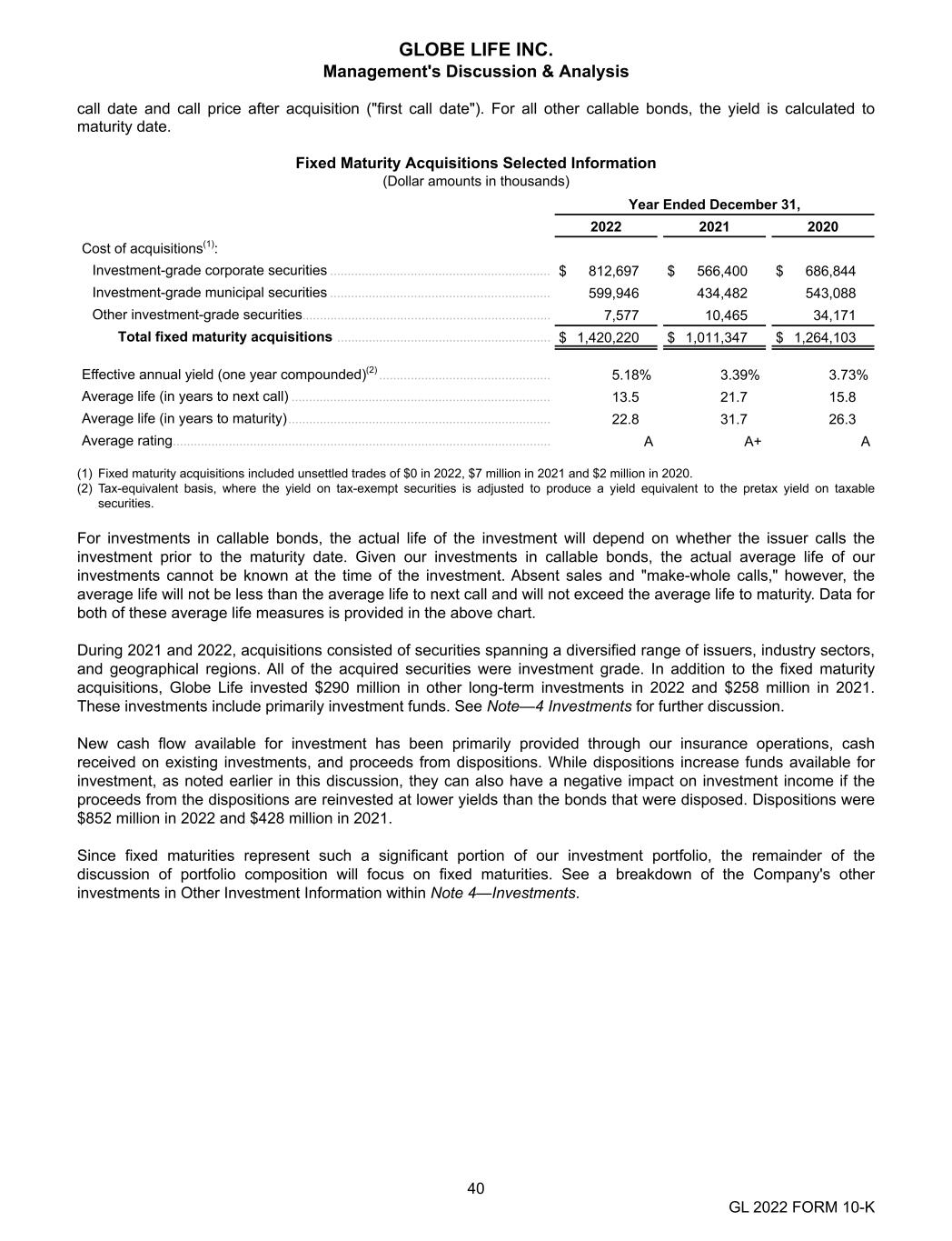 call date and call price after acquisition ("first call date"). For all other callable bonds, the yield is calculated to maturity date. Fixed Maturity Acquisitions Selected Information (Dollar amounts in thousands) Year Ended December 31, 2022 2021 2020 Cost of acquisitions(1): Investment-grade corporate securities ............................................................... $ 812,697 $ 566,400 $ 686,844 Investment-grade municipal securities ............................................................... 599,946 434,482 543,088 Other investment-grade securities....................................................................... 7,577 10,465 34,171 Total fixed maturity acquisitions ............................................................. $ 1,420,220 $ 1,011,347 $ 1,264,103 Effective annual yield (one year compounded)(2) ................................................. 5.18% 3.39% 3.73% Average life (in years to next call) .......................................................................... 13.5 21.7 15.8 Average life (in years to maturity) ........................................................................... 22.8 31.7 26.3 Average rating............................................................................................................ A A+ A (1) Fixed maturity acquisitions included unsettled trades of $0 in 2022, $7 million in 2021 and $2 million in 2020. (2) Tax-equivalent basis, where the yield on tax-exempt securities is adjusted to produce a yield equivalent to the pretax yield on taxable securities. For investments in callable bonds, the actual life of the investment will depend on whether the issuer calls the investment prior to the maturity date. Given our investments in callable bonds, the actual average life of our investments cannot be known at the time of the investment. Absent sales and "make-whole calls," however, the average life will not be less than the average life to next call and will not exceed the average life to maturity. Data for both of these average life measures is provided in the above chart. During 2021 and 2022, acquisitions consisted of securities spanning a diversified range of issuers, industry sectors, and geographical regions. All of the acquired securities were investment grade. In addition to the fixed maturity acquisitions, Globe Life invested $290 million in other long-term investments in 2022 and $258 million in 2021. These investments include primarily investment funds. See Note—4 Investments for further discussion. New cash flow available for investment has been primarily provided through our insurance operations, cash received on existing investments, and proceeds from dispositions. While dispositions increase funds available for investment, as noted earlier in this discussion, they can also have a negative impact on investment income if the proceeds from the dispositions are reinvested at lower yields than the bonds that were disposed. Dispositions were $852 million in 2022 and $428 million in 2021. Since fixed maturities represent such a significant portion of our investment portfolio, the remainder of the discussion of portfolio composition will focus on fixed maturities. See a breakdown of the Company's other investments in Other Investment Information within Note 4—Investments. GLOBE LIFE INC. Management's Discussion & Analysis 40 GL 2022 FORM 10-K