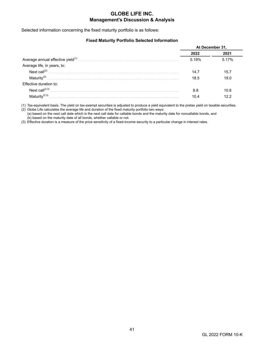 Selected information concerning the fixed maturity portfolio is as follows: Fixed Maturity Portfolio Selected Information At December 31, 2022 2021 Average annual effective yield(1) ........................................................................................................ 5.19% 5.17% Average life, in years, to: Next call(2) ....................................................................................................................................... 14.7 15.7 Maturity(2) ........................................................................................................................................ 18.5 19.0 Effective duration to: Next call(2,3) ..................................................................................................................................... 8.8 10.6 Maturity(2,3) ...................................................................................................................................... 10.4 12.2 (1) Tax-equivalent basis. The yield on tax-exempt securities is adjusted to produce a yield equivalent to the pretax yield on taxable securities. (2) Globe Life calculates the average life and duration of the fixed maturity portfolio two ways: (a) based on the next call date which is the next call date for callable bonds and the maturity date for noncallable bonds, and (b) based on the maturity date of all bonds, whether callable or not. (3) Effective duration is a measure of the price sensitivity of a fixed-income security to a particular change in interest rates. GLOBE LIFE INC. Management's Discussion & Analysis 41 GL 2022 FORM 10-K