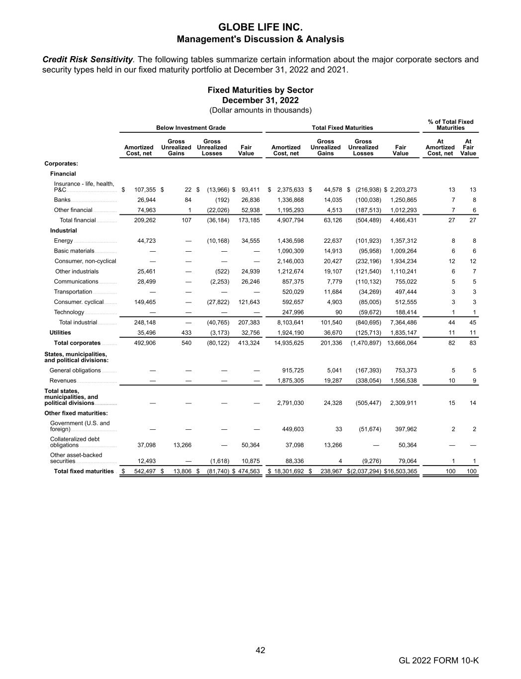 Credit Risk Sensitivity. The following tables summarize certain information about the major corporate sectors and security types held in our fixed maturity portfolio at December 31, 2022 and 2021. Fixed Maturities by Sector December 31, 2022 (Dollar amounts in thousands) Below Investment Grade Total Fixed Maturities % of Total Fixed Maturities Amortized Cost, net Gross Unrealized Gains Gross Unrealized Losses Fair Value Amortized Cost, net Gross Unrealized Gains Gross Unrealized Losses Fair Value At Amortized Cost, net At Fair Value Corporates: Financial Insurance - life, health, P&C.................................. $ 107,355 $ 22 $ (13,966) $ 93,411 $ 2,375,633 $ 44,578 $ (216,938) $ 2,203,273 13 13 Banks............................... 26,944 84 (192) 26,836 1,336,868 14,035 (100,038) 1,250,865 7 8 Other financial ................ 74,963 1 (22,026) 52,938 1,195,293 4,513 (187,513) 1,012,293 7 6 Total financial .............. 209,262 107 (36,184) 173,185 4,907,794 63,126 (504,489) 4,466,431 27 27 Industrial Energy ............................. 44,723 — (10,168) 34,555 1,436,598 22,637 (101,923) 1,357,312 8 8 Basic materials............... — — — — 1,090,309 14,913 (95,958) 1,009,264 6 6 Consumer, non-cyclical — — — — 2,146,003 20,427 (232,196) 1,934,234 12 12 Other industrials 25,461 — (522) 24,939 1,212,674 19,107 (121,540) 1,110,241 6 7 Communications ............ 28,499 — (2,253) 26,246 857,375 7,779 (110,132) 755,022 5 5 Transportation ................ — — — — 520,029 11,684 (34,269) 497,444 3 3 Consumer. cyclical......... 149,465 — (27,822) 121,643 592,657 4,903 (85,005) 512,555 3 3 Technology...................... — — — — 247,996 90 (59,672) 188,414 1 1 Total industrial ............. 248,148 — (40,765) 207,383 8,103,641 101,540 (840,695) 7,364,486 44 45 Utilities 35,496 433 (3,173) 32,756 1,924,190 36,670 (125,713) 1,835,147 11 11 Total corporates .......... 492,906 540 (80,122) 413,324 14,935,625 201,336 (1,470,897) 13,666,064 82 83 States, municipalities, and political divisions: General obligations .......... — — — — 915,725 5,041 (167,393) 753,373 5 5 Revenues ........................... — — — — 1,875,305 19,287 (338,054) 1,556,538 10 9 Total states, municipalities, and political divisions............... — — — — 2,791,030 24,328 (505,447) 2,309,911 15 14 Other fixed maturities: Government (U.S. and foreign) ............................... — — — — 449,603 33 (51,674) 397,962 2 2 Collateralized debt obligations ......................... 37,098 13,266 — 50,364 37,098 13,266 — 50,364 — — Other asset-backed securities............................ 12,493 — (1,618) 10,875 88,336 4 (9,276) 79,064 1 1 Total fixed maturities . $ 542,497 $ 13,806 $ (81,740) $ 474,563 $ 18,301,692 $ 238,967 $(2,037,294) $16,503,365 100 100 GLOBE LIFE INC. Management's Discussion & Analysis 42 GL 2022 FORM 10-K