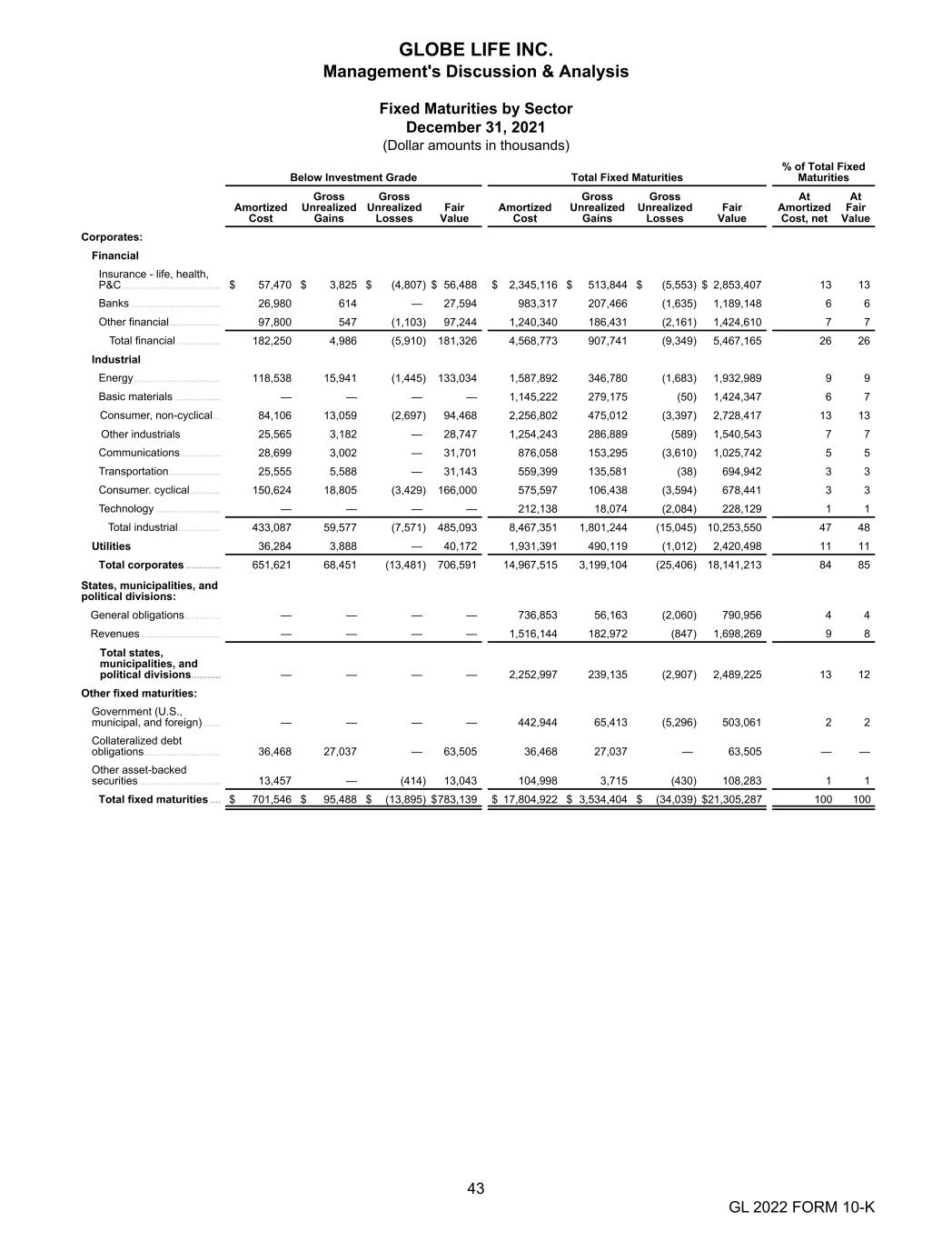 Fixed Maturities by Sector December 31, 2021 (Dollar amounts in thousands) Below Investment Grade Total Fixed Maturities % of Total Fixed Maturities Amortized Cost Gross Unrealized Gains Gross Unrealized Losses Fair Value Amortized Cost Gross Unrealized Gains Gross Unrealized Losses Fair Value At Amortized Cost, net At Fair Value Corporates: Financial Insurance - life, health, P&C .................................... $ 57,470 $ 3,825 $ (4,807) $ 56,488 $ 2,345,116 $ 513,844 $ (5,553) $ 2,853,407 13 13 Banks ................................. 26,980 614 — 27,594 983,317 207,466 (1,635) 1,189,148 6 6 Other financial................... 97,800 547 (1,103) 97,244 1,240,340 186,431 (2,161) 1,424,610 7 7 Total financial ................ 182,250 4,986 (5,910) 181,326 4,568,773 907,741 (9,349) 5,467,165 26 26 Industrial Energy ................................ 118,538 15,941 (1,445) 133,034 1,587,892 346,780 (1,683) 1,932,989 9 9 Basic materials ................. — — — — 1,145,222 279,175 (50) 1,424,347 6 7 Consumer, non-cyclical... 84,106 13,059 (2,697) 94,468 2,256,802 475,012 (3,397) 2,728,417 13 13 Other industrials 25,565 3,182 — 28,747 1,254,243 286,889 (589) 1,540,543 7 7 Communications............... 28,699 3,002 — 31,701 876,058 153,295 (3,610) 1,025,742 5 5 Transportation ................... 25,555 5,588 — 31,143 559,399 135,581 (38) 694,942 3 3 Consumer. cyclical ........... 150,624 18,805 (3,429) 166,000 575,597 106,438 (3,594) 678,441 3 3 Technology ........................ — — — — 212,138 18,074 (2,084) 228,129 1 1 Total industrial................ 433,087 59,577 (7,571) 485,093 8,467,351 1,801,244 (15,045) 10,253,550 47 48 Utilities 36,284 3,888 — 40,172 1,931,391 490,119 (1,012) 2,420,498 11 11 Total corporates ............. 651,621 68,451 (13,481) 706,591 14,967,515 3,199,104 (25,406) 18,141,213 84 85 States, municipalities, and political divisions: General obligations ............. — — — — 736,853 56,163 (2,060) 790,956 4 4 Revenues ............................. — — — — 1,516,144 182,972 (847) 1,698,269 9 8 Total states, municipalities, and political divisions........... — — — — 2,252,997 239,135 (2,907) 2,489,225 13 12 Other fixed maturities: Government (U.S., municipal, and foreign)....... — — — — 442,944 65,413 (5,296) 503,061 2 2 Collateralized debt obligations ............................ 36,468 27,037 — 63,505 36,468 27,037 — 63,505 — — Other asset-backed securities .............................. 13,457 — (414) 13,043 104,998 3,715 (430) 108,283 1 1 Total fixed maturities .... $ 701,546 $ 95,488 $ (13,895) $783,139 $ 17,804,922 $ 3,534,404 $ (34,039) $21,305,287 100 100 GLOBE LIFE INC. Management's Discussion & Analysis 43 GL 2022 FORM 10-K