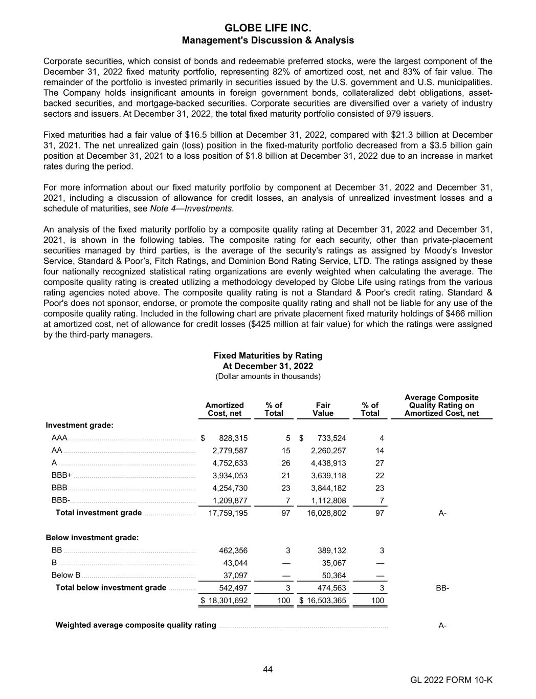 Corporate securities, which consist of bonds and redeemable preferred stocks, were the largest component of the December 31, 2022 fixed maturity portfolio, representing 82% of amortized cost, net and 83% of fair value. The remainder of the portfolio is invested primarily in securities issued by the U.S. government and U.S. municipalities. The Company holds insignificant amounts in foreign government bonds, collateralized debt obligations, asset- backed securities, and mortgage-backed securities. Corporate securities are diversified over a variety of industry sectors and issuers. At December 31, 2022, the total fixed maturity portfolio consisted of 979 issuers. Fixed maturities had a fair value of $16.5 billion at December 31, 2022, compared with $21.3 billion at December 31, 2021. The net unrealized gain (loss) position in the fixed-maturity portfolio decreased from a $3.5 billion gain position at December 31, 2021 to a loss position of $1.8 billion at December 31, 2022 due to an increase in market rates during the period. For more information about our fixed maturity portfolio by component at December 31, 2022 and December 31, 2021, including a discussion of allowance for credit losses, an analysis of unrealized investment losses and a schedule of maturities, see Note 4—Investments. An analysis of the fixed maturity portfolio by a composite quality rating at December 31, 2022 and December 31, 2021, is shown in the following tables. The composite rating for each security, other than private-placement securities managed by third parties, is the average of the security’s ratings as assigned by Moody’s Investor Service, Standard & Poor’s, Fitch Ratings, and Dominion Bond Rating Service, LTD. The ratings assigned by these four nationally recognized statistical rating organizations are evenly weighted when calculating the average. The composite quality rating is created utilizing a methodology developed by Globe Life using ratings from the various rating agencies noted above. The composite quality rating is not a Standard & Poor's credit rating. Standard & Poor's does not sponsor, endorse, or promote the composite quality rating and shall not be liable for any use of the composite quality rating. Included in the following chart are private placement fixed maturity holdings of $466 million at amortized cost, net of allowance for credit losses ($425 million at fair value) for which the ratings were assigned by the third-party managers. Fixed Maturities by Rating At December 31, 2022 (Dollar amounts in thousands) Amortized Cost, net % of Total Fair Value % of Total Average Composite Quality Rating on Amortized Cost, net Investment grade: AAA................................................................. $ 828,315 5 $ 733,524 4 AA ................................................................... 2,779,587 15 2,260,257 14 A ...................................................................... 4,752,633 26 4,438,913 27 BBB+ .............................................................. 3,934,053 21 3,639,118 22 BBB................................................................. 4,254,730 23 3,844,182 23 BBB-................................................................ 1,209,877 7 1,112,808 7 Total investment grade .......................... 17,759,195 97 16,028,802 97 A- Below investment grade: BB ................................................................... 462,356 3 389,132 3 B ...................................................................... 43,044 — 35,067 — Below B .......................................................... 37,097 — 50,364 — Total below investment grade .............. 542,497 3 474,563 3 BB- $ 18,301,692 100 $ 16,503,365 100 Weighted average composite quality rating ...................................................................................... A- GLOBE LIFE INC. Management's Discussion & Analysis 44 GL 2022 FORM 10-K