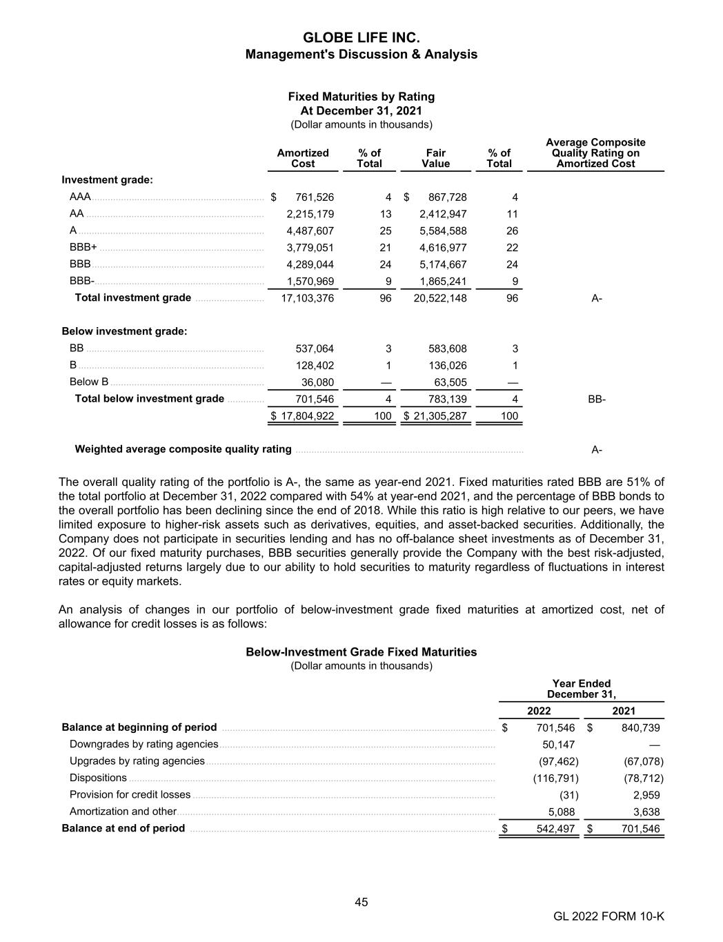 Fixed Maturities by Rating At December 31, 2021 (Dollar amounts in thousands) Amortized Cost % of Total Fair Value % of Total Average Composite Quality Rating on Amortized Cost Investment grade: AAA................................................................. $ 761,526 4 $ 867,728 4 AA ................................................................... 2,215,179 13 2,412,947 11 A ...................................................................... 4,487,607 25 5,584,588 26 BBB+ .............................................................. 3,779,051 21 4,616,977 22 BBB................................................................. 4,289,044 24 5,174,667 24 BBB-................................................................ 1,570,969 9 1,865,241 9 Total investment grade .......................... 17,103,376 96 20,522,148 96 A- Below investment grade: BB ................................................................... 537,064 3 583,608 3 B ...................................................................... 128,402 1 136,026 1 Below B .......................................................... 36,080 — 63,505 — Total below investment grade .............. 701,546 4 783,139 4 BB- $ 17,804,922 100 $ 21,305,287 100 Weighted average composite quality rating ...................................................................................... A- The overall quality rating of the portfolio is A-, the same as year-end 2021. Fixed maturities rated BBB are 51% of the total portfolio at December 31, 2022 compared with 54% at year-end 2021, and the percentage of BBB bonds to the overall portfolio has been declining since the end of 2018. While this ratio is high relative to our peers, we have limited exposure to higher-risk assets such as derivatives, equities, and asset-backed securities. Additionally, the Company does not participate in securities lending and has no off-balance sheet investments as of December 31, 2022. Of our fixed maturity purchases, BBB securities generally provide the Company with the best risk-adjusted, capital-adjusted returns largely due to our ability to hold securities to maturity regardless of fluctuations in interest rates or equity markets. An analysis of changes in our portfolio of below-investment grade fixed maturities at amortized cost, net of allowance for credit losses is as follows: Below-Investment Grade Fixed Maturities (Dollar amounts in thousands) Year Ended December 31, 2022 2021 Balance at beginning of period ....................................................................................................... $ 701,546 $ 840,739 Downgrades by rating agencies........................................................................................................ 50,147 — Upgrades by rating agencies ............................................................................................................. (97,462) (67,078) Dispositions .......................................................................................................................................... (116,791) (78,712) Provision for credit losses .................................................................................................................. (31) 2,959 Amortization and other........................................................................................................................ 5,088 3,638 Balance at end of period ................................................................................................................... $ 542,497 $ 701,546 GLOBE LIFE INC. Management's Discussion & Analysis 45 GL 2022 FORM 10-K