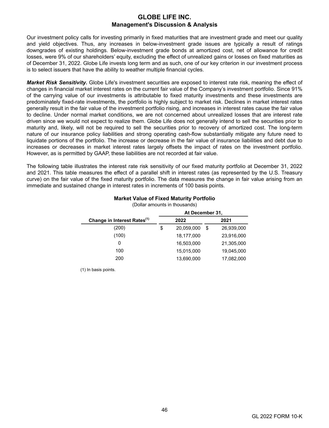 Our investment policy calls for investing primarily in fixed maturities that are investment grade and meet our quality and yield objectives. Thus, any increases in below-investment grade issues are typically a result of ratings downgrades of existing holdings. Below-investment grade bonds at amortized cost, net of allowance for credit losses, were 9% of our shareholders’ equity, excluding the effect of unrealized gains or losses on fixed maturities as of December 31, 2022. Globe Life invests long term and as such, one of our key criterion in our investment process is to select issuers that have the ability to weather multiple financial cycles. Market Risk Sensitivity. Globe Life's investment securities are exposed to interest rate risk, meaning the effect of changes in financial market interest rates on the current fair value of the Company’s investment portfolio. Since 91% of the carrying value of our investments is attributable to fixed maturity investments and these investments are predominately fixed-rate investments, the portfolio is highly subject to market risk. Declines in market interest rates generally result in the fair value of the investment portfolio rising, and increases in interest rates cause the fair value to decline. Under normal market conditions, we are not concerned about unrealized losses that are interest rate driven since we would not expect to realize them. Globe Life does not generally intend to sell the securities prior to maturity and, likely, will not be required to sell the securities prior to recovery of amortized cost. The long-term nature of our insurance policy liabilities and strong operating cash-flow substantially mitigate any future need to liquidate portions of the portfolio. The increase or decrease in the fair value of insurance liabilities and debt due to increases or decreases in market interest rates largely offsets the impact of rates on the investment portfolio. However, as is permitted by GAAP, these liabilities are not recorded at fair value. The following table illustrates the interest rate risk sensitivity of our fixed maturity portfolio at December 31, 2022 and 2021. This table measures the effect of a parallel shift in interest rates (as represented by the U.S. Treasury curve) on the fair value of the fixed maturity portfolio. The data measures the change in fair value arising from an immediate and sustained change in interest rates in increments of 100 basis points. Market Value of Fixed Maturity Portfolio (Dollar amounts in thousands) At December 31, Change in Interest Rates(1) 2022 2021 (200) $ 20,059,000 $ 26,939,000 (100) 18,177,000 23,916,000 0 16,503,000 21,305,000 100 15,015,000 19,045,000 200 13,690,000 17,082,000 (1) In basis points. GLOBE LIFE INC. Management's Discussion & Analysis 46 GL 2022 FORM 10-K
