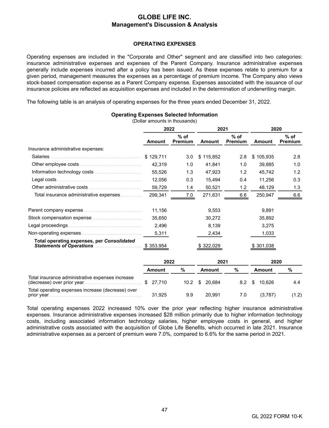 OPERATING EXPENSES Operating expenses are included in the "Corporate and Other" segment and are classified into two categories: insurance administrative expenses and expenses of the Parent Company. Insurance administrative expenses generally include expenses incurred after a policy has been issued. As these expenses relate to premium for a given period, management measures the expenses as a percentage of premium income. The Company also views stock-based compensation expense as a Parent Company expense. Expenses associated with the issuance of our insurance policies are reflected as acquisition expenses and included in the determination of underwriting margin. The following table is an analysis of operating expenses for the three years ended December 31, 2022. Operating Expenses Selected Information (Dollar amounts in thousands) 2022 2021 2020 Amount % of Premium Amount % of Premium Amount % of Premium Insurance administrative expenses: Salaries ............................................................................ $ 129,711 3.0 $ 115,852 2.8 $ 105,935 2.8 Other employee costs.................................................... 42,319 1.0 41,841 1.0 39,885 1.0 Information technology costs........................................ 55,526 1.3 47,923 1.2 45,742 1.2 Legal costs ...................................................................... 12,056 0.3 15,494 0.4 11,256 0.3 Other administrative costs ............................................ 59,729 1.4 50,521 1.2 48,129 1.3 Total insurance administrative expenses.................. 299,341 7.0 271,631 6.6 250,947 6.6 Parent company expense ................................................ 11,156 9,553 9,891 Stock compensation expense ......................................... 35,650 30,272 35,892 Legal proceedings............................................................. 2,496 8,139 3,275 Non-operating expenses .................................................. 5,311 2,434 1,033 Total operating expenses, per Consolidated Statements of Operations ....................................... $ 353,954 $ 322,029 $ 301,038 2022 2021 2020 Amount % Amount % Amount % Total insurance administrative expenses increase (decrease) over prior year................................................ $ 27,710 10.2 $ 20,684 8.2 $ 10,626 4.4 Total operating expenses increase (decrease) over prior year............................................................................. 31,925 9.9 20,991 7.0 (3,787) (1.2) Total operating expenses 2022 increased 10% over the prior year reflecting higher insurance administrative expenses. Insurance administrative expenses increased $28 million primarily due to higher information technology costs, including associated information technology salaries, higher employee costs in general, and higher administrative costs associated with the acquisition of Globe Life Benefits, which occurred in late 2021. Insurance administrative expenses as a percent of premium were 7.0%, compared to 6.6% for the same period in 2021. GLOBE LIFE INC. Management's Discussion & Analysis 47 GL 2022 FORM 10-K