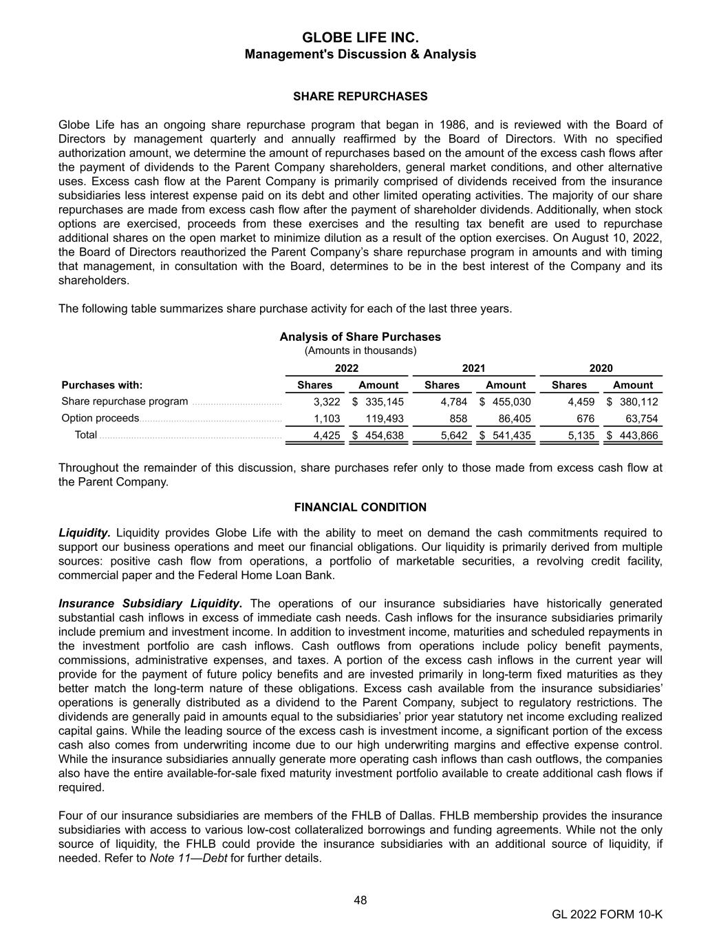 SHARE REPURCHASES Globe Life has an ongoing share repurchase program that began in 1986, and is reviewed with the Board of Directors by management quarterly and annually reaffirmed by the Board of Directors. With no specified authorization amount, we determine the amount of repurchases based on the amount of the excess cash flows after the payment of dividends to the Parent Company shareholders, general market conditions, and other alternative uses. Excess cash flow at the Parent Company is primarily comprised of dividends received from the insurance subsidiaries less interest expense paid on its debt and other limited operating activities. The majority of our share repurchases are made from excess cash flow after the payment of shareholder dividends. Additionally, when stock options are exercised, proceeds from these exercises and the resulting tax benefit are used to repurchase additional shares on the open market to minimize dilution as a result of the option exercises. On August 10, 2022, the Board of Directors reauthorized the Parent Company’s share repurchase program in amounts and with timing that management, in consultation with the Board, determines to be in the best interest of the Company and its shareholders. The following table summarizes share purchase activity for each of the last three years. Analysis of Share Purchases (Amounts in thousands) 2022 2021 2020 Purchases with: Shares Amount Shares Amount Shares Amount Share repurchase program .................................. 3,322 $ 335,145 4,784 $ 455,030 4,459 $ 380,112 Option proceeds...................................................... 1,103 119,493 858 86,405 676 63,754 Total ..................................................................... 4,425 $ 454,638 5,642 $ 541,435 5,135 $ 443,866 Throughout the remainder of this discussion, share purchases refer only to those made from excess cash flow at the Parent Company. FINANCIAL CONDITION Liquidity. Liquidity provides Globe Life with the ability to meet on demand the cash commitments required to support our business operations and meet our financial obligations. Our liquidity is primarily derived from multiple sources: positive cash flow from operations, a portfolio of marketable securities, a revolving credit facility, commercial paper and the Federal Home Loan Bank. Insurance Subsidiary Liquidity. The operations of our insurance subsidiaries have historically generated substantial cash inflows in excess of immediate cash needs. Cash inflows for the insurance subsidiaries primarily include premium and investment income. In addition to investment income, maturities and scheduled repayments in the investment portfolio are cash inflows. Cash outflows from operations include policy benefit payments, commissions, administrative expenses, and taxes. A portion of the excess cash inflows in the current year will provide for the payment of future policy benefits and are invested primarily in long-term fixed maturities as they better match the long-term nature of these obligations. Excess cash available from the insurance subsidiaries’ operations is generally distributed as a dividend to the Parent Company, subject to regulatory restrictions. The dividends are generally paid in amounts equal to the subsidiaries’ prior year statutory net income excluding realized capital gains. While the leading source of the excess cash is investment income, a significant portion of the excess cash also comes from underwriting income due to our high underwriting margins and effective expense control. While the insurance subsidiaries annually generate more operating cash inflows than cash outflows, the companies also have the entire available-for-sale fixed maturity investment portfolio available to create additional cash flows if required. Four of our insurance subsidiaries are members of the FHLB of Dallas. FHLB membership provides the insurance subsidiaries with access to various low-cost collateralized borrowings and funding agreements. While not the only source of liquidity, the FHLB could provide the insurance subsidiaries with an additional source of liquidity, if needed. Refer to Note 11—Debt for further details. GLOBE LIFE INC. Management's Discussion & Analysis 48 GL 2022 FORM 10-K