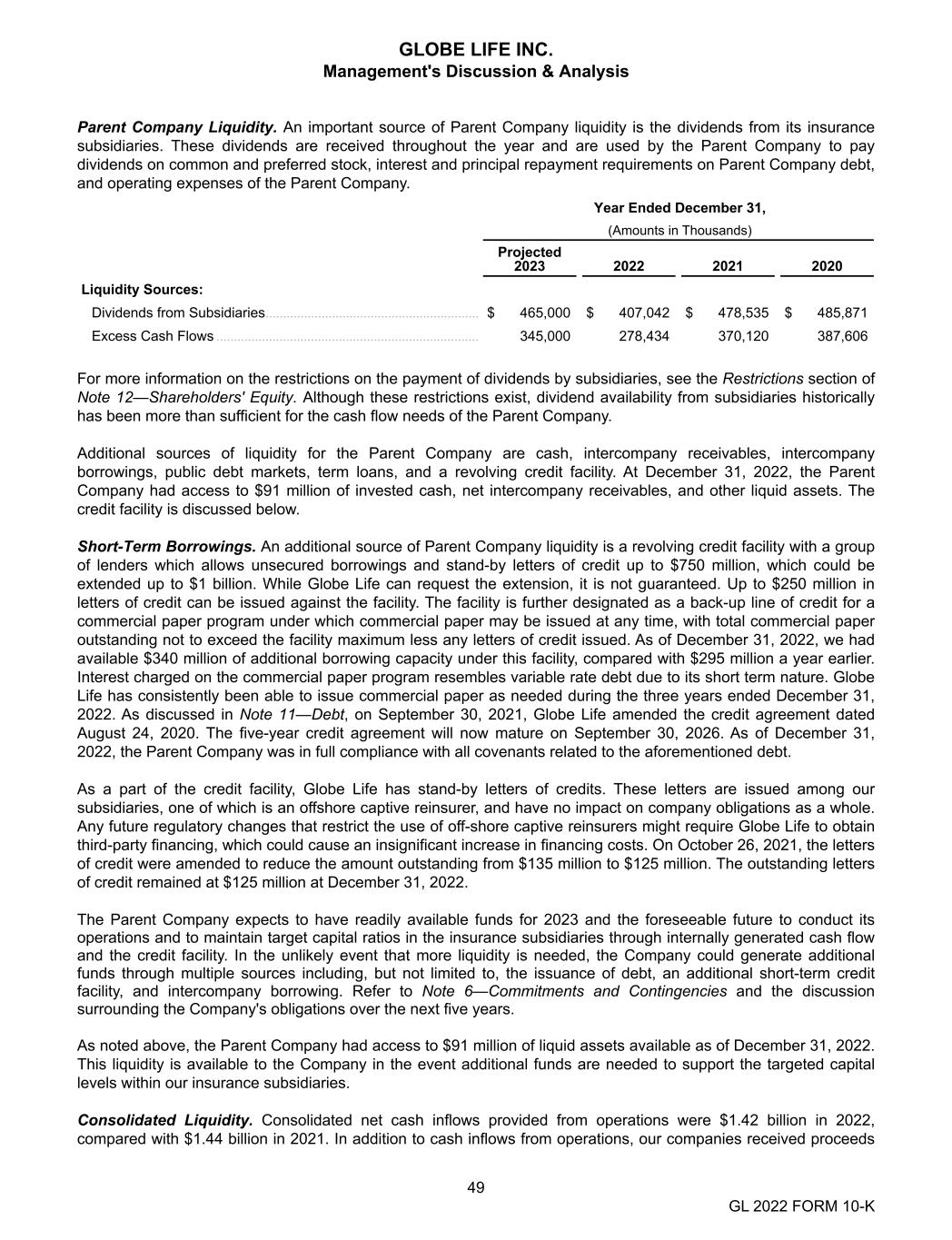 Parent Company Liquidity. An important source of Parent Company liquidity is the dividends from its insurance subsidiaries. These dividends are received throughout the year and are used by the Parent Company to pay dividends on common and preferred stock, interest and principal repayment requirements on Parent Company debt, and operating expenses of the Parent Company. Year Ended December 31, (Amounts in Thousands) Projected 2023 2022 2021 2020 Liquidity Sources: Dividends from Subsidiaries............................................................. $ 465,000 $ 407,042 $ 478,535 $ 485,871 Excess Cash Flows ........................................................................... 345,000 278,434 370,120 387,606 For more information on the restrictions on the payment of dividends by subsidiaries, see the Restrictions section of Note 12—Shareholders' Equity. Although these restrictions exist, dividend availability from subsidiaries historically has been more than sufficient for the cash flow needs of the Parent Company. Additional sources of liquidity for the Parent Company are cash, intercompany receivables, intercompany borrowings, public debt markets, term loans, and a revolving credit facility. At December 31, 2022, the Parent Company had access to $91 million of invested cash, net intercompany receivables, and other liquid assets. The credit facility is discussed below. Short-Term Borrowings. An additional source of Parent Company liquidity is a revolving credit facility with a group of lenders which allows unsecured borrowings and stand-by letters of credit up to $750 million, which could be extended up to $1 billion. While Globe Life can request the extension, it is not guaranteed. Up to $250 million in letters of credit can be issued against the facility. The facility is further designated as a back-up line of credit for a commercial paper program under which commercial paper may be issued at any time, with total commercial paper outstanding not to exceed the facility maximum less any letters of credit issued. As of December 31, 2022, we had available $340 million of additional borrowing capacity under this facility, compared with $295 million a year earlier. Interest charged on the commercial paper program resembles variable rate debt due to its short term nature. Globe Life has consistently been able to issue commercial paper as needed during the three years ended December 31, 2022. As discussed in Note 11—Debt, on September 30, 2021, Globe Life amended the credit agreement dated August 24, 2020. The five-year credit agreement will now mature on September 30, 2026. As of December 31, 2022, the Parent Company was in full compliance with all covenants related to the aforementioned debt. As a part of the credit facility, Globe Life has stand-by letters of credits. These letters are issued among our subsidiaries, one of which is an offshore captive reinsurer, and have no impact on company obligations as a whole. Any future regulatory changes that restrict the use of off-shore captive reinsurers might require Globe Life to obtain third-party financing, which could cause an insignificant increase in financing costs. On October 26, 2021, the letters of credit were amended to reduce the amount outstanding from $135 million to $125 million. The outstanding letters of credit remained at $125 million at December 31, 2022. The Parent Company expects to have readily available funds for 2023 and the foreseeable future to conduct its operations and to maintain target capital ratios in the insurance subsidiaries through internally generated cash flow and the credit facility. In the unlikely event that more liquidity is needed, the Company could generate additional funds through multiple sources including, but not limited to, the issuance of debt, an additional short-term credit facility, and intercompany borrowing. Refer to Note 6—Commitments and Contingencies and the discussion surrounding the Company's obligations over the next five years. As noted above, the Parent Company had access to $91 million of liquid assets available as of December 31, 2022. This liquidity is available to the Company in the event additional funds are needed to support the targeted capital levels within our insurance subsidiaries. Consolidated Liquidity. Consolidated net cash inflows provided from operations were $1.42 billion in 2022, compared with $1.44 billion in 2021. In addition to cash inflows from operations, our companies received proceeds GLOBE LIFE INC. Management's Discussion & Analysis 49 GL 2022 FORM 10-K