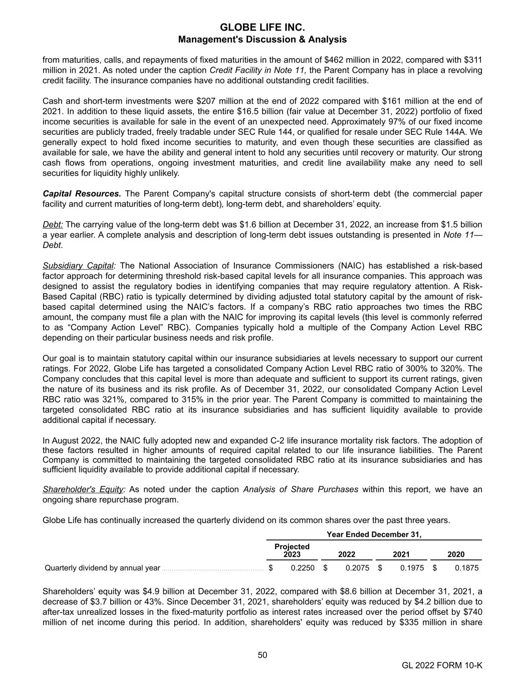 from maturities, calls, and repayments of fixed maturities in the amount of $462 million in 2022, compared with $311 million in 2021. As noted under the caption Credit Facility in Note 11, the Parent Company has in place a revolving credit facility. The insurance companies have no additional outstanding credit facilities. Cash and short-term investments were $207 million at the end of 2022 compared with $161 million at the end of 2021. In addition to these liquid assets, the entire $16.5 billion (fair value at December 31, 2022) portfolio of fixed income securities is available for sale in the event of an unexpected need. Approximately 97% of our fixed income securities are publicly traded, freely tradable under SEC Rule 144, or qualified for resale under SEC Rule 144A. We generally expect to hold fixed income securities to maturity, and even though these securities are classified as available for sale, we have the ability and general intent to hold any securities until recovery or maturity. Our strong cash flows from operations, ongoing investment maturities, and credit line availability make any need to sell securities for liquidity highly unlikely. Capital Resources. The Parent Company's capital structure consists of short-term debt (the commercial paper facility and current maturities of long-term debt), long-term debt, and shareholders’ equity. Debt: The carrying value of the long-term debt was $1.6 billion at December 31, 2022, an increase from $1.5 billion a year earlier. A complete analysis and description of long-term debt issues outstanding is presented in Note 11— Debt. Subsidiary Capital: The National Association of Insurance Commissioners (NAIC) has established a risk-based factor approach for determining threshold risk-based capital levels for all insurance companies. This approach was designed to assist the regulatory bodies in identifying companies that may require regulatory attention. A Risk- Based Capital (RBC) ratio is typically determined by dividing adjusted total statutory capital by the amount of risk- based capital determined using the NAIC’s factors. If a company’s RBC ratio approaches two times the RBC amount, the company must file a plan with the NAIC for improving its capital levels (this level is commonly referred to as “Company Action Level” RBC). Companies typically hold a multiple of the Company Action Level RBC depending on their particular business needs and risk profile. Our goal is to maintain statutory capital within our insurance subsidiaries at levels necessary to support our current ratings. For 2022, Globe Life has targeted a consolidated Company Action Level RBC ratio of 300% to 320%. The Company concludes that this capital level is more than adequate and sufficient to support its current ratings, given the nature of its business and its risk profile. As of December 31, 2022, our consolidated Company Action Level RBC ratio was 321%, compared to 315% in the prior year. The Parent Company is committed to maintaining the targeted consolidated RBC ratio at its insurance subsidiaries and has sufficient liquidity available to provide additional capital if necessary. In August 2022, the NAIC fully adopted new and expanded C-2 life insurance mortality risk factors. The adoption of these factors resulted in higher amounts of required capital related to our life insurance liabilities. The Parent Company is committed to maintaining the targeted consolidated RBC ratio at its insurance subsidiaries and has sufficient liquidity available to provide additional capital if necessary. Shareholder's Equity: As noted under the caption Analysis of Share Purchases within this report, we have an ongoing share repurchase program. Globe Life has continually increased the quarterly dividend on its common shares over the past three years. Year Ended December 31, Projected 2023 2022 2021 2020 Quarterly dividend by annual year ..................................................... $ 0.2250 $ 0.2075 $ 0.1975 $ 0.1875 Shareholders’ equity was $4.9 billion at December 31, 2022, compared with $8.6 billion at December 31, 2021, a decrease of $3.7 billion or 43%. Since December 31, 2021, shareholders’ equity was reduced by $4.2 billion due to after-tax unrealized losses in the fixed-maturity portfolio as interest rates increased over the period offset by $740 million of net income during this period. In addition, shareholders' equity was reduced by $335 million in share GLOBE LIFE INC. Management's Discussion & Analysis 50 GL 2022 FORM 10-K