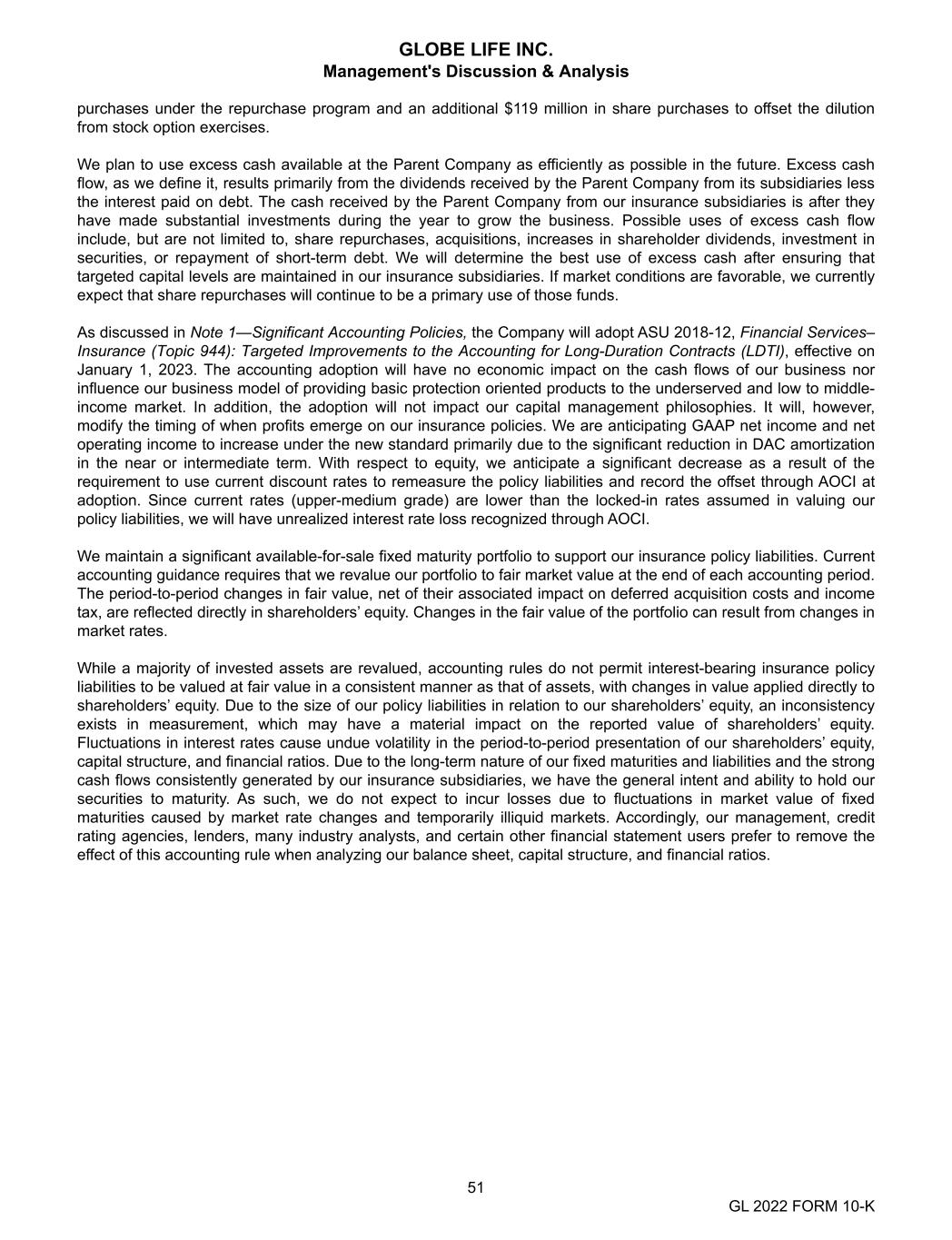 purchases under the repurchase program and an additional $119 million in share purchases to offset the dilution from stock option exercises. We plan to use excess cash available at the Parent Company as efficiently as possible in the future. Excess cash flow, as we define it, results primarily from the dividends received by the Parent Company from its subsidiaries less the interest paid on debt. The cash received by the Parent Company from our insurance subsidiaries is after they have made substantial investments during the year to grow the business. Possible uses of excess cash flow include, but are not limited to, share repurchases, acquisitions, increases in shareholder dividends, investment in securities, or repayment of short-term debt. We will determine the best use of excess cash after ensuring that targeted capital levels are maintained in our insurance subsidiaries. If market conditions are favorable, we currently expect that share repurchases will continue to be a primary use of those funds. As discussed in Note 1—Significant Accounting Policies, the Company will adopt ASU 2018-12, Financial Services– Insurance (Topic 944): Targeted Improvements to the Accounting for Long-Duration Contracts (LDTI), effective on January 1, 2023. The accounting adoption will have no economic impact on the cash flows of our business nor influence our business model of providing basic protection oriented products to the underserved and low to middle- income market. In addition, the adoption will not impact our capital management philosophies. It will, however, modify the timing of when profits emerge on our insurance policies. We are anticipating GAAP net income and net operating income to increase under the new standard primarily due to the significant reduction in DAC amortization in the near or intermediate term. With respect to equity, we anticipate a significant decrease as a result of the requirement to use current discount rates to remeasure the policy liabilities and record the offset through AOCI at adoption. Since current rates (upper-medium grade) are lower than the locked-in rates assumed in valuing our policy liabilities, we will have unrealized interest rate loss recognized through AOCI. We maintain a significant available-for-sale fixed maturity portfolio to support our insurance policy liabilities. Current accounting guidance requires that we revalue our portfolio to fair market value at the end of each accounting period. The period-to-period changes in fair value, net of their associated impact on deferred acquisition costs and income tax, are reflected directly in shareholders’ equity. Changes in the fair value of the portfolio can result from changes in market rates. While a majority of invested assets are revalued, accounting rules do not permit interest-bearing insurance policy liabilities to be valued at fair value in a consistent manner as that of assets, with changes in value applied directly to shareholders’ equity. Due to the size of our policy liabilities in relation to our shareholders’ equity, an inconsistency exists in measurement, which may have a material impact on the reported value of shareholders’ equity. Fluctuations in interest rates cause undue volatility in the period-to-period presentation of our shareholders’ equity, capital structure, and financial ratios. Due to the long-term nature of our fixed maturities and liabilities and the strong cash flows consistently generated by our insurance subsidiaries, we have the general intent and ability to hold our securities to maturity. As such, we do not expect to incur losses due to fluctuations in market value of fixed maturities caused by market rate changes and temporarily illiquid markets. Accordingly, our management, credit rating agencies, lenders, many industry analysts, and certain other financial statement users prefer to remove the effect of this accounting rule when analyzing our balance sheet, capital structure, and financial ratios. GLOBE LIFE INC. Management's Discussion & Analysis 51 GL 2022 FORM 10-K