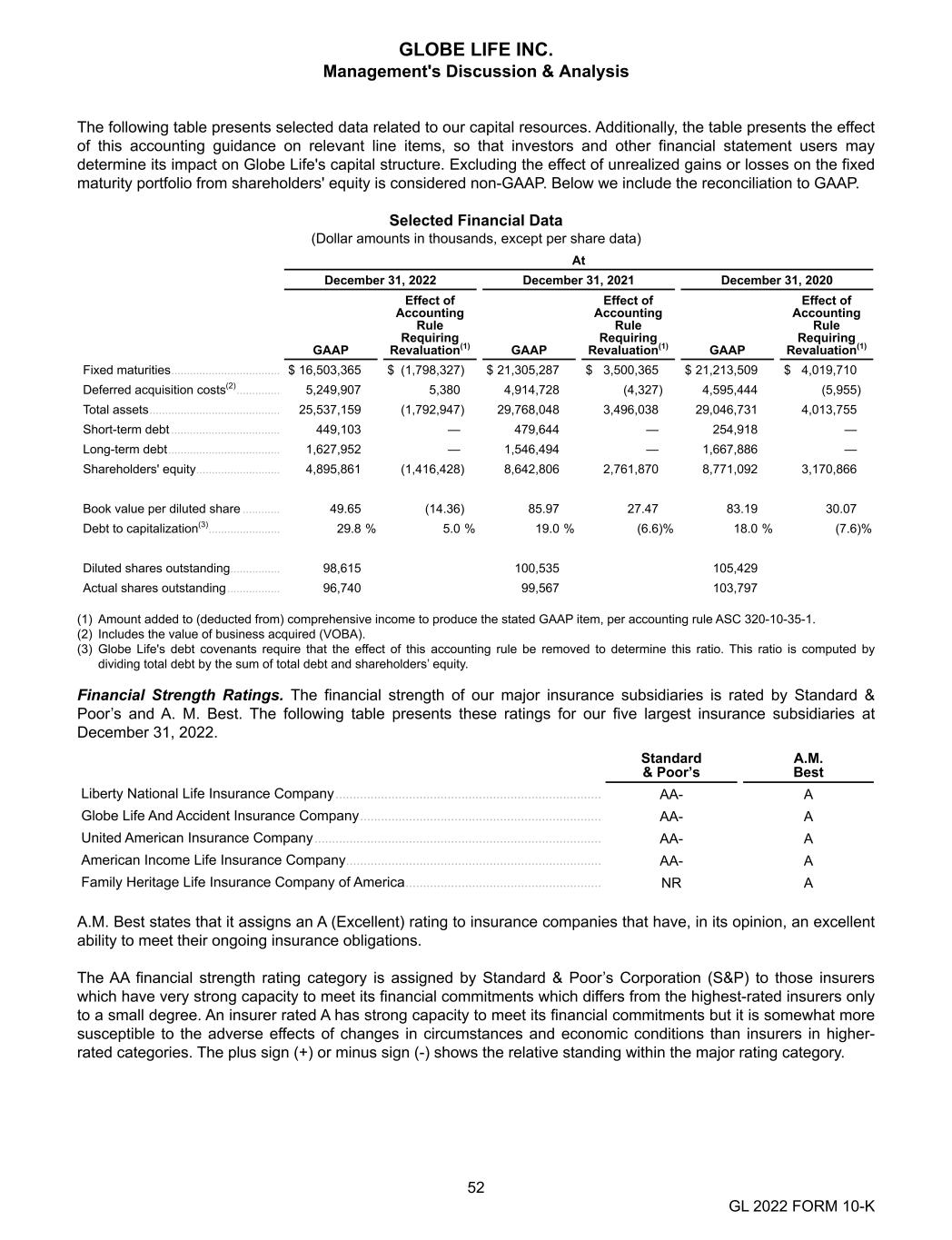 The following table presents selected data related to our capital resources. Additionally, the table presents the effect of this accounting guidance on relevant line items, so that investors and other financial statement users may determine its impact on Globe Life's capital structure. Excluding the effect of unrealized gains or losses on the fixed maturity portfolio from shareholders' equity is considered non-GAAP. Below we include the reconciliation to GAAP. Selected Financial Data (Dollar amounts in thousands, except per share data) At December 31, 2022 December 31, 2021 December 31, 2020 GAAP Effect of Accounting Rule Requiring Revaluation(1) GAAP Effect of Accounting Rule Requiring Revaluation(1) GAAP Effect of Accounting Rule Requiring Revaluation(1) Fixed maturities................................... $ 16,503,365 $ (1,798,327) $ 21,305,287 $ 3,500,365 $ 21,213,509 $ 4,019,710 Deferred acquisition costs(2).............. 5,249,907 5,380 4,914,728 (4,327) 4,595,444 (5,955) Total assets.......................................... 25,537,159 (1,792,947) 29,768,048 3,496,038 29,046,731 4,013,755 Short-term debt ................................... 449,103 — 479,644 — 254,918 — Long-term debt.................................... 1,627,952 — 1,546,494 — 1,667,886 — Shareholders' equity........................... 4,895,861 (1,416,428) 8,642,806 2,761,870 8,771,092 3,170,866 Book value per diluted share ............ 49.65 (14.36) 85.97 27.47 83.19 30.07 Debt to capitalization(3)....................... 29.8 % 5.0 % 19.0 % (6.6)% 18.0 % (7.6)% Diluted shares outstanding................ 98,615 100,535 105,429 Actual shares outstanding ................. 96,740 99,567 103,797 (1) Amount added to (deducted from) comprehensive income to produce the stated GAAP item, per accounting rule ASC 320-10-35-1. (2) Includes the value of business acquired (VOBA). (3) Globe Life's debt covenants require that the effect of this accounting rule be removed to determine this ratio. This ratio is computed by dividing total debt by the sum of total debt and shareholders’ equity. Financial Strength Ratings. The financial strength of our major insurance subsidiaries is rated by Standard & Poor’s and A. M. Best. The following table presents these ratings for our five largest insurance subsidiaries at December 31, 2022. Standard & Poor’s A.M. Best Liberty National Life Insurance Company ............................................................................ AA- A Globe Life And Accident Insurance Company..................................................................... AA- A United American Insurance Company .................................................................................. AA- A American Income Life Insurance Company......................................................................... AA- A Family Heritage Life Insurance Company of America........................................................ NR A A.M. Best states that it assigns an A (Excellent) rating to insurance companies that have, in its opinion, an excellent ability to meet their ongoing insurance obligations. The AA financial strength rating category is assigned by Standard & Poor’s Corporation (S&P) to those insurers which have very strong capacity to meet its financial commitments which differs from the highest-rated insurers only to a small degree. An insurer rated A has strong capacity to meet its financial commitments but it is somewhat more susceptible to the adverse effects of changes in circumstances and economic conditions than insurers in higher- rated categories. The plus sign (+) or minus sign (-) shows the relative standing within the major rating category. GLOBE LIFE INC. Management's Discussion & Analysis 52 GL 2022 FORM 10-K