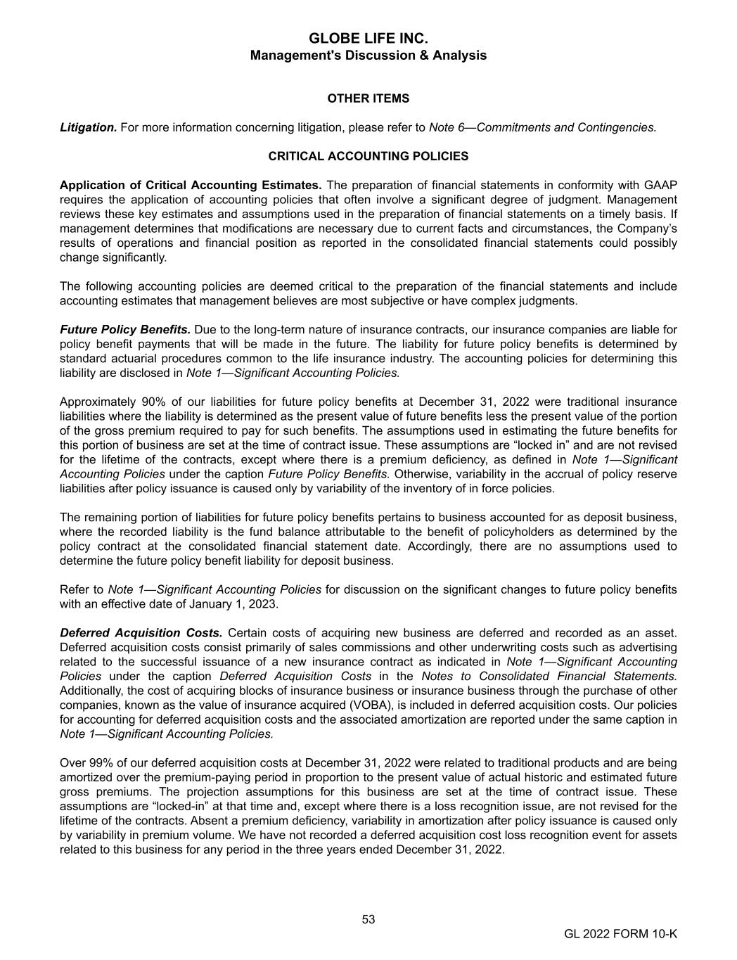 OTHER ITEMS Litigation. For more information concerning litigation, please refer to Note 6—Commitments and Contingencies. CRITICAL ACCOUNTING POLICIES Application of Critical Accounting Estimates. The preparation of financial statements in conformity with GAAP requires the application of accounting policies that often involve a significant degree of judgment. Management reviews these key estimates and assumptions used in the preparation of financial statements on a timely basis. If management determines that modifications are necessary due to current facts and circumstances, the Company’s results of operations and financial position as reported in the consolidated financial statements could possibly change significantly. The following accounting policies are deemed critical to the preparation of the financial statements and include accounting estimates that management believes are most subjective or have complex judgments. Future Policy Benefits. Due to the long-term nature of insurance contracts, our insurance companies are liable for policy benefit payments that will be made in the future. The liability for future policy benefits is determined by standard actuarial procedures common to the life insurance industry. The accounting policies for determining this liability are disclosed in Note 1—Significant Accounting Policies. Approximately 90% of our liabilities for future policy benefits at December 31, 2022 were traditional insurance liabilities where the liability is determined as the present value of future benefits less the present value of the portion of the gross premium required to pay for such benefits. The assumptions used in estimating the future benefits for this portion of business are set at the time of contract issue. These assumptions are “locked in” and are not revised for the lifetime of the contracts, except where there is a premium deficiency, as defined in Note 1—Significant Accounting Policies under the caption Future Policy Benefits. Otherwise, variability in the accrual of policy reserve liabilities after policy issuance is caused only by variability of the inventory of in force policies. The remaining portion of liabilities for future policy benefits pertains to business accounted for as deposit business, where the recorded liability is the fund balance attributable to the benefit of policyholders as determined by the policy contract at the consolidated financial statement date. Accordingly, there are no assumptions used to determine the future policy benefit liability for deposit business. Refer to Note 1—Significant Accounting Policies for discussion on the significant changes to future policy benefits with an effective date of January 1, 2023. Deferred Acquisition Costs. Certain costs of acquiring new business are deferred and recorded as an asset. Deferred acquisition costs consist primarily of sales commissions and other underwriting costs such as advertising related to the successful issuance of a new insurance contract as indicated in Note 1—Significant Accounting Policies under the caption Deferred Acquisition Costs in the Notes to Consolidated Financial Statements. Additionally, the cost of acquiring blocks of insurance business or insurance business through the purchase of other companies, known as the value of insurance acquired (VOBA), is included in deferred acquisition costs. Our policies for accounting for deferred acquisition costs and the associated amortization are reported under the same caption in Note 1—Significant Accounting Policies. Over 99% of our deferred acquisition costs at December 31, 2022 were related to traditional products and are being amortized over the premium-paying period in proportion to the present value of actual historic and estimated future gross premiums. The projection assumptions for this business are set at the time of contract issue. These assumptions are “locked-in” at that time and, except where there is a loss recognition issue, are not revised for the lifetime of the contracts. Absent a premium deficiency, variability in amortization after policy issuance is caused only by variability in premium volume. We have not recorded a deferred acquisition cost loss recognition event for assets related to this business for any period in the three years ended December 31, 2022. GLOBE LIFE INC. Management's Discussion & Analysis 53 GL 2022 FORM 10-K