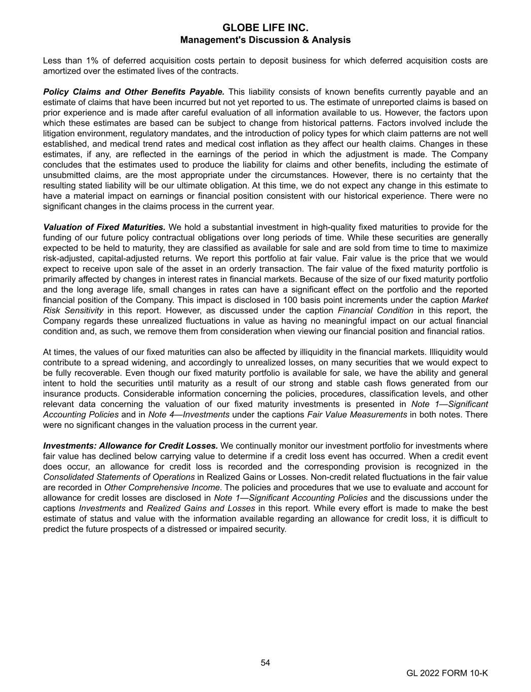 Less than 1% of deferred acquisition costs pertain to deposit business for which deferred acquisition costs are amortized over the estimated lives of the contracts. Policy Claims and Other Benefits Payable. This liability consists of known benefits currently payable and an estimate of claims that have been incurred but not yet reported to us. The estimate of unreported claims is based on prior experience and is made after careful evaluation of all information available to us. However, the factors upon which these estimates are based can be subject to change from historical patterns. Factors involved include the litigation environment, regulatory mandates, and the introduction of policy types for which claim patterns are not well established, and medical trend rates and medical cost inflation as they affect our health claims. Changes in these estimates, if any, are reflected in the earnings of the period in which the adjustment is made. The Company concludes that the estimates used to produce the liability for claims and other benefits, including the estimate of unsubmitted claims, are the most appropriate under the circumstances. However, there is no certainty that the resulting stated liability will be our ultimate obligation. At this time, we do not expect any change in this estimate to have a material impact on earnings or financial position consistent with our historical experience. There were no significant changes in the claims process in the current year. Valuation of Fixed Maturities. We hold a substantial investment in high-quality fixed maturities to provide for the funding of our future policy contractual obligations over long periods of time. While these securities are generally expected to be held to maturity, they are classified as available for sale and are sold from time to time to maximize risk-adjusted, capital-adjusted returns. We report this portfolio at fair value. Fair value is the price that we would expect to receive upon sale of the asset in an orderly transaction. The fair value of the fixed maturity portfolio is primarily affected by changes in interest rates in financial markets. Because of the size of our fixed maturity portfolio and the long average life, small changes in rates can have a significant effect on the portfolio and the reported financial position of the Company. This impact is disclosed in 100 basis point increments under the caption Market Risk Sensitivity in this report. However, as discussed under the caption Financial Condition in this report, the Company regards these unrealized fluctuations in value as having no meaningful impact on our actual financial condition and, as such, we remove them from consideration when viewing our financial position and financial ratios. At times, the values of our fixed maturities can also be affected by illiquidity in the financial markets. Illiquidity would contribute to a spread widening, and accordingly to unrealized losses, on many securities that we would expect to be fully recoverable. Even though our fixed maturity portfolio is available for sale, we have the ability and general intent to hold the securities until maturity as a result of our strong and stable cash flows generated from our insurance products. Considerable information concerning the policies, procedures, classification levels, and other relevant data concerning the valuation of our fixed maturity investments is presented in Note 1—Significant Accounting Policies and in Note 4—Investments under the captions Fair Value Measurements in both notes. There were no significant changes in the valuation process in the current year. Investments: Allowance for Credit Losses. We continually monitor our investment portfolio for investments where fair value has declined below carrying value to determine if a credit loss event has occurred. When a credit event does occur, an allowance for credit loss is recorded and the corresponding provision is recognized in the Consolidated Statements of Operations in Realized Gains or Losses. Non-credit related fluctuations in the fair value are recorded in Other Comprehensive Income. The policies and procedures that we use to evaluate and account for allowance for credit losses are disclosed in Note 1—Significant Accounting Policies and the discussions under the captions Investments and Realized Gains and Losses in this report. While every effort is made to make the best estimate of status and value with the information available regarding an allowance for credit loss, it is difficult to predict the future prospects of a distressed or impaired security. GLOBE LIFE INC. Management's Discussion & Analysis 54 GL 2022 FORM 10-K