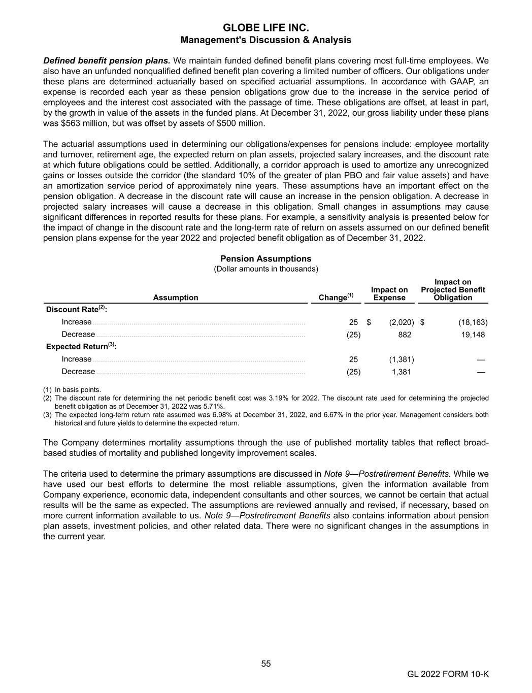 Defined benefit pension plans. We maintain funded defined benefit plans covering most full-time employees. We also have an unfunded nonqualified defined benefit plan covering a limited number of officers. Our obligations under these plans are determined actuarially based on specified actuarial assumptions. In accordance with GAAP, an expense is recorded each year as these pension obligations grow due to the increase in the service period of employees and the interest cost associated with the passage of time. These obligations are offset, at least in part, by the growth in value of the assets in the funded plans. At December 31, 2022, our gross liability under these plans was $563 million, but was offset by assets of $500 million. The actuarial assumptions used in determining our obligations/expenses for pensions include: employee mortality and turnover, retirement age, the expected return on plan assets, projected salary increases, and the discount rate at which future obligations could be settled. Additionally, a corridor approach is used to amortize any unrecognized gains or losses outside the corridor (the standard 10% of the greater of plan PBO and fair value assets) and have an amortization service period of approximately nine years. These assumptions have an important effect on the pension obligation. A decrease in the discount rate will cause an increase in the pension obligation. A decrease in projected salary increases will cause a decrease in this obligation. Small changes in assumptions may cause significant differences in reported results for these plans. For example, a sensitivity analysis is presented below for the impact of change in the discount rate and the long-term rate of return on assets assumed on our defined benefit pension plans expense for the year 2022 and projected benefit obligation as of December 31, 2022. Pension Assumptions (Dollar amounts in thousands) Assumption Change(1) Impact on Expense Impact on Projected Benefit Obligation Discount Rate(2): Increase............................................................................................................. 25 $ (2,020) $ (18,163) Decrease ........................................................................................................... (25) 882 19,148 Expected Return(3): Increase............................................................................................................. 25 (1,381) — Decrease ........................................................................................................... (25) 1,381 — (1) In basis points. (2) The discount rate for determining the net periodic benefit cost was 3.19% for 2022. The discount rate used for determining the projected benefit obligation as of December 31, 2022 was 5.71%. (3) The expected long-term return rate assumed was 6.98% at December 31, 2022, and 6.67% in the prior year. Management considers both historical and future yields to determine the expected return. The Company determines mortality assumptions through the use of published mortality tables that reflect broad- based studies of mortality and published longevity improvement scales. The criteria used to determine the primary assumptions are discussed in Note 9—Postretirement Benefits. While we have used our best efforts to determine the most reliable assumptions, given the information available from Company experience, economic data, independent consultants and other sources, we cannot be certain that actual results will be the same as expected. The assumptions are reviewed annually and revised, if necessary, based on more current information available to us. Note 9—Postretirement Benefits also contains information about pension plan assets, investment policies, and other related data. There were no significant changes in the assumptions in the current year. GLOBE LIFE INC. Management's Discussion & Analysis 55 GL 2022 FORM 10-K