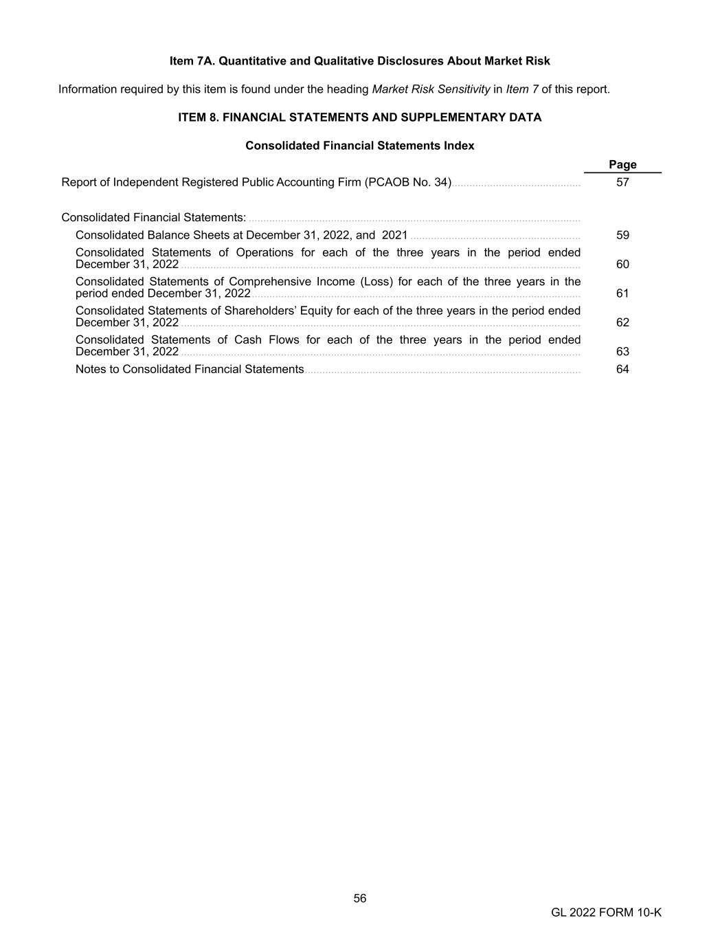 Item 7A. Quantitative and Qualitative Disclosures About Market Risk Information required by this item is found under the heading Market Risk Sensitivity in Item 7 of this report. ITEM 8. FINANCIAL STATEMENTS AND SUPPLEMENTARY DATA Consolidated Financial Statements Index Page Report of Independent Registered Public Accounting Firm (PCAOB No. 34)............................................ 57 Consolidated Financial Statements: ................................................................................................................. Consolidated Balance Sheets at December 31, 2022, and 2021 .......................................................... 59 Consolidated Statements of Operations for each of the three years in the period ended December 31, 2022 ........................................................................................................................................ 60 Consolidated Statements of Comprehensive Income (Loss) for each of the three years in the period ended December 31, 2022................................................................................................................ 61 Consolidated Statements of Shareholders’ Equity for each of the three years in the period ended December 31, 2022 ........................................................................................................................................ 62 Consolidated Statements of Cash Flows for each of the three years in the period ended December 31, 2022 ........................................................................................................................................ 63 Notes to Consolidated Financial Statements.............................................................................................. 64 56 GL 2022 FORM 10-K