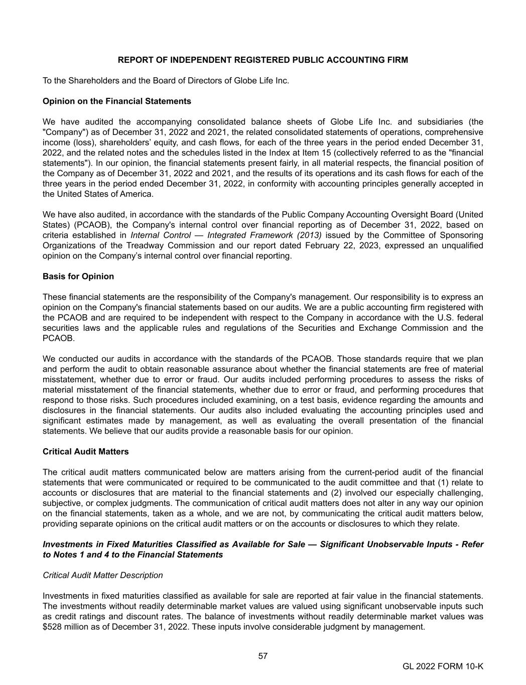 REPORT OF INDEPENDENT REGISTERED PUBLIC ACCOUNTING FIRM To the Shareholders and the Board of Directors of Globe Life Inc. Opinion on the Financial Statements We have audited the accompanying consolidated balance sheets of Globe Life Inc. and subsidiaries (the "Company") as of December 31, 2022 and 2021, the related consolidated statements of operations, comprehensive income (loss), shareholders’ equity, and cash flows, for each of the three years in the period ended December 31, 2022, and the related notes and the schedules listed in the Index at Item 15 (collectively referred to as the "financial statements"). In our opinion, the financial statements present fairly, in all material respects, the financial position of the Company as of December 31, 2022 and 2021, and the results of its operations and its cash flows for each of the three years in the period ended December 31, 2022, in conformity with accounting principles generally accepted in the United States of America. We have also audited, in accordance with the standards of the Public Company Accounting Oversight Board (United States) (PCAOB), the Company's internal control over financial reporting as of December 31, 2022, based on criteria established in Internal Control — Integrated Framework (2013) issued by the Committee of Sponsoring Organizations of the Treadway Commission and our report dated February 22, 2023, expressed an unqualified opinion on the Company’s internal control over financial reporting. Basis for Opinion These financial statements are the responsibility of the Company's management. Our responsibility is to express an opinion on the Company's financial statements based on our audits. We are a public accounting firm registered with the PCAOB and are required to be independent with respect to the Company in accordance with the U.S. federal securities laws and the applicable rules and regulations of the Securities and Exchange Commission and the PCAOB. We conducted our audits in accordance with the standards of the PCAOB. Those standards require that we plan and perform the audit to obtain reasonable assurance about whether the financial statements are free of material misstatement, whether due to error or fraud. Our audits included performing procedures to assess the risks of material misstatement of the financial statements, whether due to error or fraud, and performing procedures that respond to those risks. Such procedures included examining, on a test basis, evidence regarding the amounts and disclosures in the financial statements. Our audits also included evaluating the accounting principles used and significant estimates made by management, as well as evaluating the overall presentation of the financial statements. We believe that our audits provide a reasonable basis for our opinion. Critical Audit Matters The critical audit matters communicated below are matters arising from the current-period audit of the financial statements that were communicated or required to be communicated to the audit committee and that (1) relate to accounts or disclosures that are material to the financial statements and (2) involved our especially challenging, subjective, or complex judgments. The communication of critical audit matters does not alter in any way our opinion on the financial statements, taken as a whole, and we are not, by communicating the critical audit matters below, providing separate opinions on the critical audit matters or on the accounts or disclosures to which they relate. Investments in Fixed Maturities Classified as Available for Sale — Significant Unobservable Inputs - Refer to Notes 1 and 4 to the Financial Statements Critical Audit Matter Description Investments in fixed maturities classified as available for sale are reported at fair value in the financial statements. The investments without readily determinable market values are valued using significant unobservable inputs such as credit ratings and discount rates. The balance of investments without readily determinable market values was $528 million as of December 31, 2022. These inputs involve considerable judgment by management. 57 GL 2022 FORM 10-K