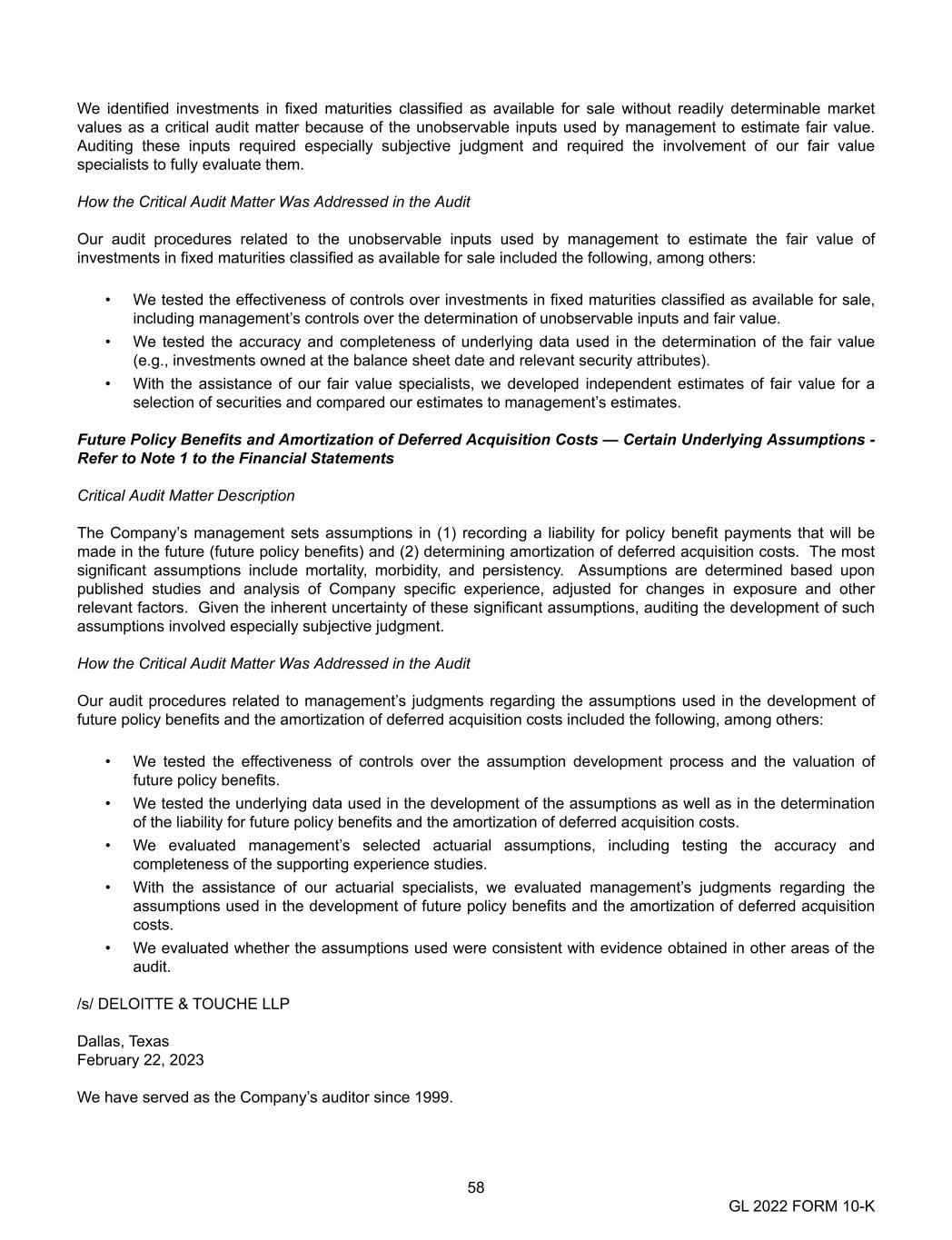 We identified investments in fixed maturities classified as available for sale without readily determinable market values as a critical audit matter because of the unobservable inputs used by management to estimate fair value. Auditing these inputs required especially subjective judgment and required the involvement of our fair value specialists to fully evaluate them. How the Critical Audit Matter Was Addressed in the Audit Our audit procedures related to the unobservable inputs used by management to estimate the fair value of investments in fixed maturities classified as available for sale included the following, among others: • We tested the effectiveness of controls over investments in fixed maturities classified as available for sale, including management’s controls over the determination of unobservable inputs and fair value. • We tested the accuracy and completeness of underlying data used in the determination of the fair value (e.g., investments owned at the balance sheet date and relevant security attributes). • With the assistance of our fair value specialists, we developed independent estimates of fair value for a selection of securities and compared our estimates to management’s estimates. Future Policy Benefits and Amortization of Deferred Acquisition Costs — Certain Underlying Assumptions - Refer to Note 1 to the Financial Statements Critical Audit Matter Description The Company’s management sets assumptions in (1) recording a liability for policy benefit payments that will be made in the future (future policy benefits) and (2) determining amortization of deferred acquisition costs. The most significant assumptions include mortality, morbidity, and persistency. Assumptions are determined based upon published studies and analysis of Company specific experience, adjusted for changes in exposure and other relevant factors. Given the inherent uncertainty of these significant assumptions, auditing the development of such assumptions involved especially subjective judgment. How the Critical Audit Matter Was Addressed in the Audit Our audit procedures related to management’s judgments regarding the assumptions used in the development of future policy benefits and the amortization of deferred acquisition costs included the following, among others: • We tested the effectiveness of controls over the assumption development process and the valuation of future policy benefits. • We tested the underlying data used in the development of the assumptions as well as in the determination of the liability for future policy benefits and the amortization of deferred acquisition costs. • We evaluated management’s selected actuarial assumptions, including testing the accuracy and completeness of the supporting experience studies. • With the assistance of our actuarial specialists, we evaluated management’s judgments regarding the assumptions used in the development of future policy benefits and the amortization of deferred acquisition costs. • We evaluated whether the assumptions used were consistent with evidence obtained in other areas of the audit. /s/ DELOITTE & TOUCHE LLP Dallas, Texas February 22, 2023 We have served as the Company’s auditor since 1999. 58 GL 2022 FORM 10-K
