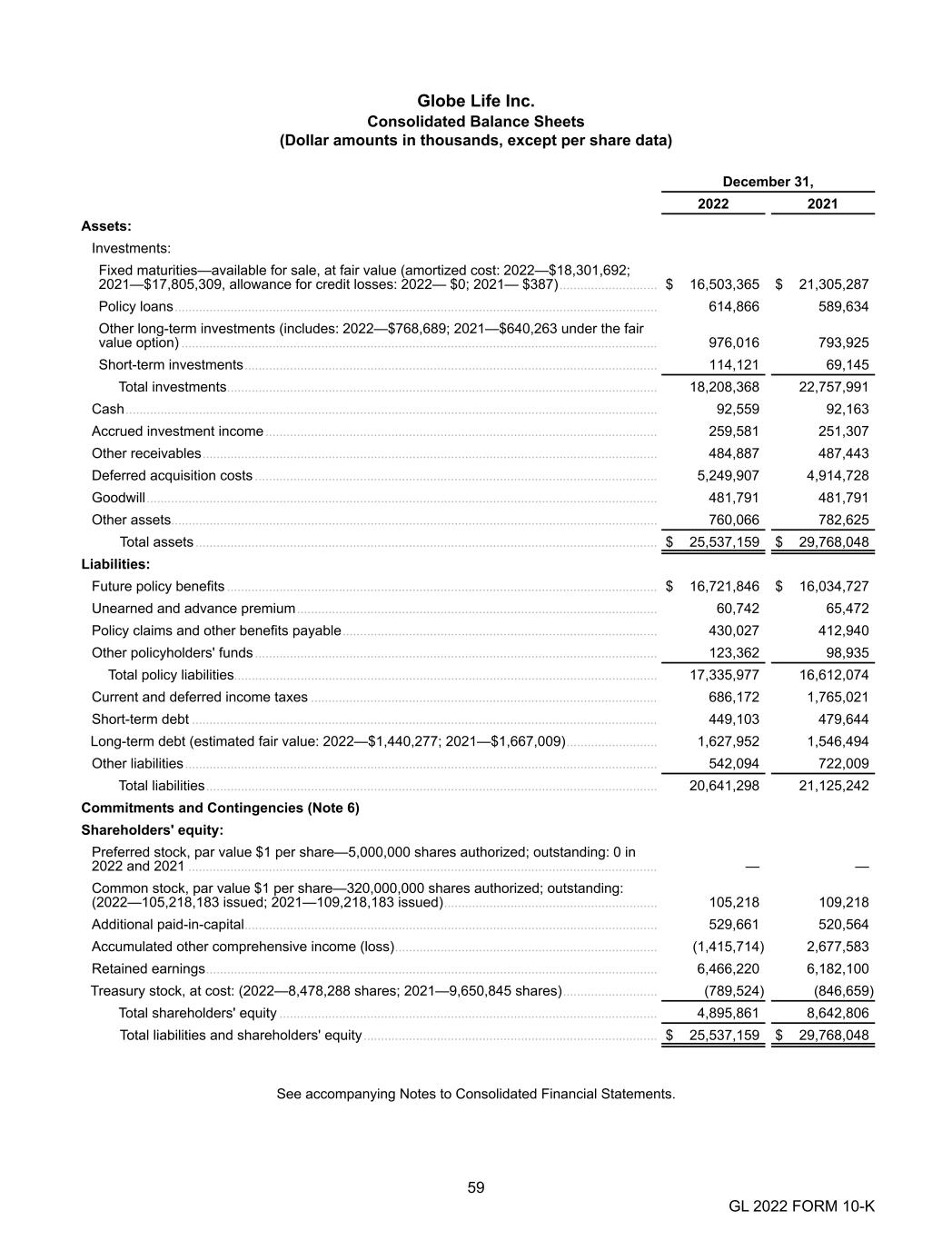Globe Life Inc. Consolidated Balance Sheets (Dollar amounts in thousands, except per share data) December 31, 2022 2021 Assets: Investments: Fixed maturities—available for sale, at fair value (amortized cost: 2022—$18,301,692; 2021—$17,805,309, allowance for credit losses: 2022— $0; 2021— $387) ............................ $ 16,503,365 $ 21,305,287 Policy loans.......................................................................................................................................... 614,866 589,634 Other long-term investments (includes: 2022—$768,689; 2021—$640,263 under the fair value option) ........................................................................................................................................ 976,016 793,925 Short-term investments...................................................................................................................... 114,121 69,145 Total investments........................................................................................................................... 18,208,368 22,757,991 Cash........................................................................................................................................................ 92,559 92,163 Accrued investment income ................................................................................................................ 259,581 251,307 Other receivables.................................................................................................................................. 484,887 487,443 Deferred acquisition costs ................................................................................................................... 5,249,907 4,914,728 Goodwill.................................................................................................................................................. 481,791 481,791 Other assets........................................................................................................................................... 760,066 782,625 Total assets .................................................................................................................................... $ 25,537,159 $ 29,768,048 Liabilities: Future policy benefits ........................................................................................................................... $ 16,721,846 $ 16,034,727 Unearned and advance premium ....................................................................................................... 60,742 65,472 Policy claims and other benefits payable.......................................................................................... 430,027 412,940 Other policyholders' funds ................................................................................................................... 123,362 98,935 Total policy liabilities......................................................................................................................... 17,335,977 16,612,074 Current and deferred income taxes ................................................................................................... 686,172 1,765,021 Short-term debt ..................................................................................................................................... 449,103 479,644 Long-term debt (estimated fair value: 2022—$1,440,277; 2021—$1,667,009).......................... 1,627,952 1,546,494 Other liabilities ....................................................................................................................................... 542,094 722,009 Total liabilities................................................................................................................................. 20,641,298 21,125,242 Commitments and Contingencies (Note 6) Shareholders' equity: Preferred stock, par value $1 per share—5,000,000 shares authorized; outstanding: 0 in 2022 and 2021 ...................................................................................................................................... — — Common stock, par value $1 per share—320,000,000 shares authorized; outstanding: (2022—105,218,183 issued; 2021—109,218,183 issued)............................................................. 105,218 109,218 Additional paid-in-capital...................................................................................................................... 529,661 520,564 Accumulated other comprehensive income (loss)........................................................................... (1,415,714) 2,677,583 Retained earnings................................................................................................................................. 6,466,220 6,182,100 Treasury stock, at cost: (2022—8,478,288 shares; 2021—9,650,845 shares)........................... (789,524) (846,659) Total shareholders' equity ............................................................................................................ 4,895,861 8,642,806 Total liabilities and shareholders' equity .................................................................................... $ 25,537,159 $ 29,768,048 See accompanying Notes to Consolidated Financial Statements. 59 GL 2022 FORM 10-K