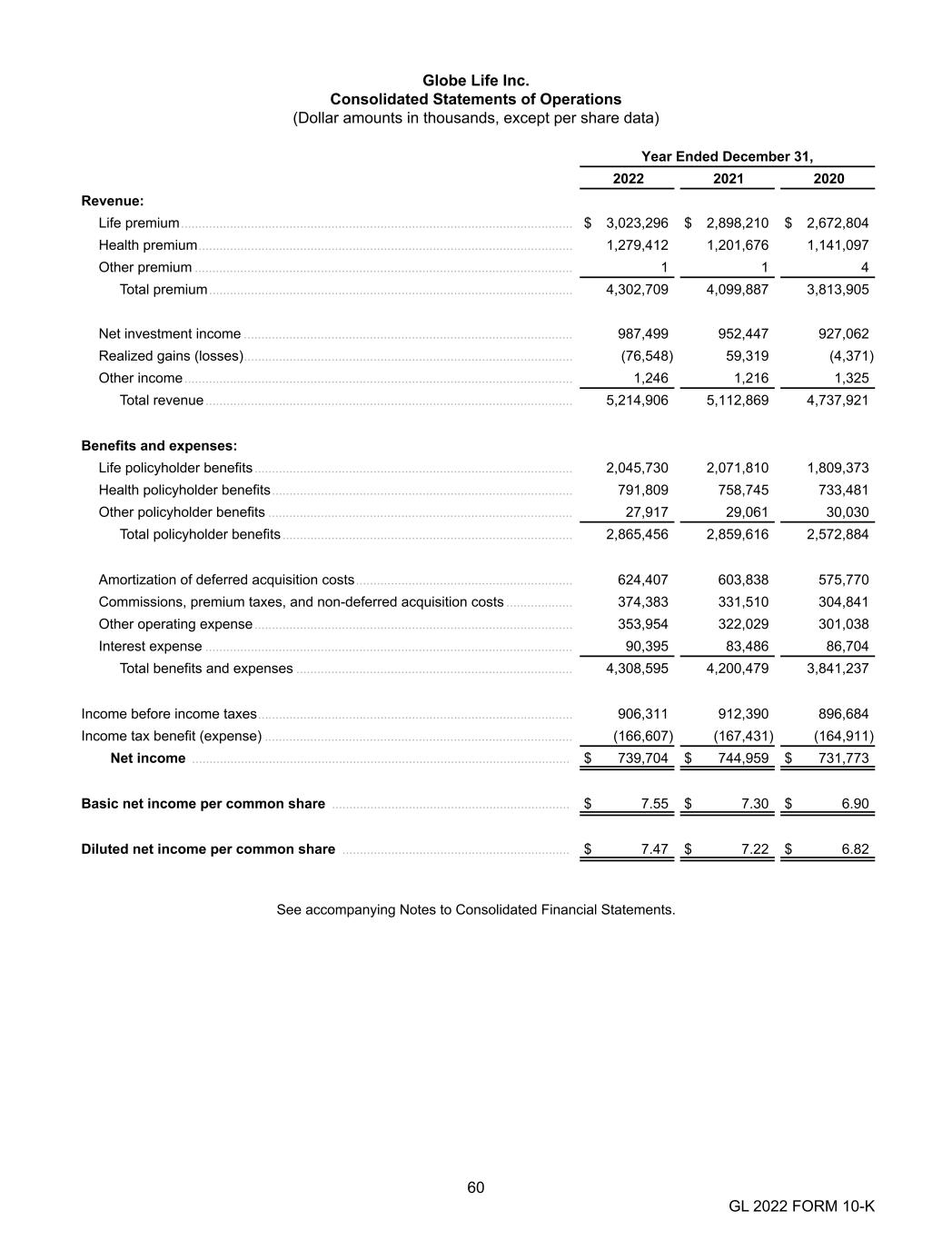 Globe Life Inc. Consolidated Statements of Operations (Dollar amounts in thousands, except per share data) Year Ended December 31, 2022 2021 2020 Revenue: Life premium ................................................................................................................ $ 3,023,296 $ 2,898,210 $ 2,672,804 Health premium........................................................................................................... 1,279,412 1,201,676 1,141,097 Other premium ............................................................................................................ 1 1 4 Total premium ........................................................................................................ 4,302,709 4,099,887 3,813,905 Net investment income .............................................................................................. 987,499 952,447 927,062 Realized gains (losses).............................................................................................. (76,548) 59,319 (4,371) Other income ............................................................................................................... 1,246 1,216 1,325 Total revenue ......................................................................................................... 5,214,906 5,112,869 4,737,921 Benefits and expenses: Life policyholder benefits ........................................................................................... 2,045,730 2,071,810 1,809,373 Health policyholder benefits ...................................................................................... 791,809 758,745 733,481 Other policyholder benefits ....................................................................................... 27,917 29,061 30,030 Total policyholder benefits ................................................................................... 2,865,456 2,859,616 2,572,884 Amortization of deferred acquisition costs .............................................................. 624,407 603,838 575,770 Commissions, premium taxes, and non-deferred acquisition costs ................... 374,383 331,510 304,841 Other operating expense ........................................................................................... 353,954 322,029 301,038 Interest expense ......................................................................................................... 90,395 83,486 86,704 Total benefits and expenses ............................................................................... 4,308,595 4,200,479 3,841,237 Income before income taxes.......................................................................................... 906,311 912,390 896,684 Income tax benefit (expense) ........................................................................................ (166,607) (167,431) (164,911) Net income ............................................................................................................ $ 739,704 $ 744,959 $ 731,773 Basic net income per common share .................................................................... $ 7.55 $ 7.30 $ 6.90 Diluted net income per common share ................................................................. $ 7.47 $ 7.22 $ 6.82 See accompanying Notes to Consolidated Financial Statements. 60 GL 2022 FORM 10-K