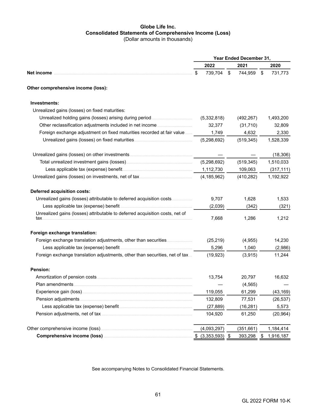 Globe Life Inc. Consolidated Statements of Comprehensive Income (Loss) (Dollar amounts in thousands) Year Ended December 31, 2022 2021 2020 Net income ....................................................................................................................... $ 739,704 $ 744,959 $ 731,773 Other comprehensive income (loss): Investments: Unrealized gains (losses) on fixed maturities: Unrealized holding gains (losses) arising during period ................................... (5,332,818) (492,267) 1,493,200 Other reclassification adjustments included in net income .............................. 32,377 (31,710) 32,809 Foreign exchange adjustment on fixed maturities recorded at fair value ...... 1,749 4,632 2,330 Unrealized gains (losses) on fixed maturities.................................................. (5,298,692) (519,345) 1,528,339 Unrealized gains (losses) on other investments...................................................... — — (18,306) Total unrealized investment gains (losses)......................................................... (5,298,692) (519,345) 1,510,033 Less applicable tax (expense) benefit............................................................ 1,112,730 109,063 (317,111) Unrealized gains (losses) on investments, net of tax ............................................. (4,185,962) (410,282) 1,192,922 Deferred acquisition costs: Unrealized gains (losses) attributable to deferred acquisition costs.................. 9,707 1,628 1,533 Less applicable tax (expense) benefit .............................................................. (2,039) (342) (321) Unrealized gains (losses) attributable to deferred acquisition costs, net of tax................................................................................................................................. 7,668 1,286 1,212 Foreign exchange translation: Foreign exchange translation adjustments, other than securities...................... (25,219) (4,955) 14,230 Less applicable tax (expense) benefit .............................................................. 5,296 1,040 (2,986) Foreign exchange translation adjustments, other than securities, net of tax ... (19,923) (3,915) 11,244 Pension: Amortization of pension costs .................................................................................. 13,754 20,797 16,632 Plan amendments ...................................................................................................... — (4,565) — Experience gain (loss)............................................................................................... 119,055 61,299 (43,169) Pension adjustments................................................................................................. 132,809 77,531 (26,537) Less applicable tax (expense) benefit............................................................... (27,889) (16,281) 5,573 Pension adjustments, net of tax .............................................................................. 104,920 61,250 (20,964) Other comprehensive income (loss)............................................................................... (4,093,297) (351,661) 1,184,414 Comprehensive income (loss) ............................................................................ $ (3,353,593) $ 393,298 $ 1,916,187 See accompanying Notes to Consolidated Financial Statements. 61 GL 2022 FORM 10-K