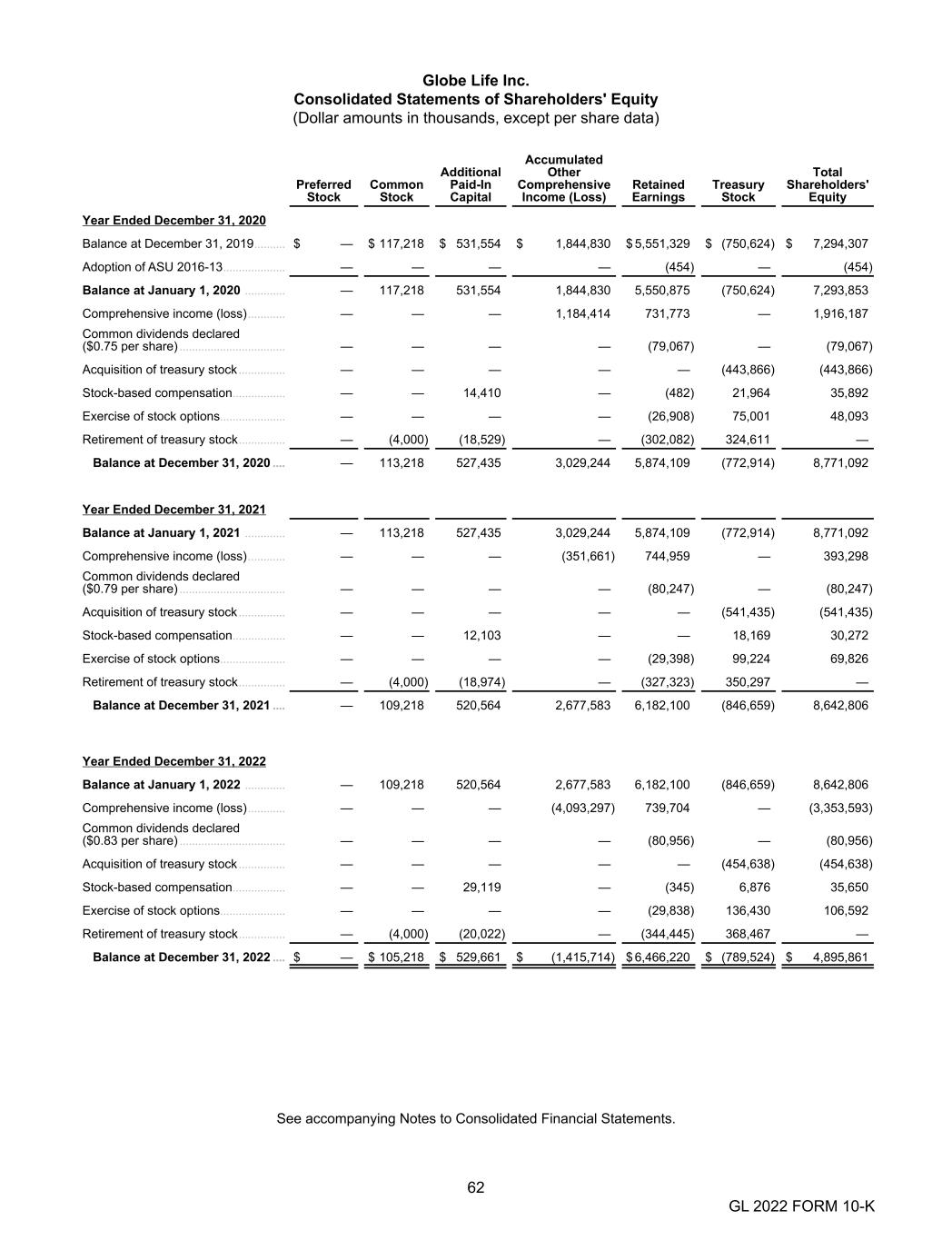 Globe Life Inc. Consolidated Statements of Shareholders' Equity (Dollar amounts in thousands, except per share data) Preferred Stock Common Stock Additional Paid-In Capital Accumulated Other Comprehensive Income (Loss) Retained Earnings Treasury Stock Total Shareholders' Equity Year Ended December 31, 2020 Balance at December 31, 2019.......... $ — $ 117,218 $ 531,554 $ 1,844,830 $ 5,551,329 $ (750,624) $ 7,294,307 Adoption of ASU 2016-13.................... — — — — (454) — (454) Balance at January 1, 2020 ............. — 117,218 531,554 1,844,830 5,550,875 (750,624) 7,293,853 Comprehensive income (loss) ............ — — — 1,184,414 731,773 — 1,916,187 Common dividends declared ($0.75 per share) .................................. — — — — (79,067) — (79,067) Acquisition of treasury stock ............... — — — — — (443,866) (443,866) Stock-based compensation................. — — 14,410 — (482) 21,964 35,892 Exercise of stock options..................... — — — — (26,908) 75,001 48,093 Retirement of treasury stock............... — (4,000) (18,529) — (302,082) 324,611 — Balance at December 31, 2020 .... — 113,218 527,435 3,029,244 5,874,109 (772,914) 8,771,092 Year Ended December 31, 2021 Balance at January 1, 2021 ............. — 113,218 527,435 3,029,244 5,874,109 (772,914) 8,771,092 Comprehensive income (loss) ............ — — — (351,661) 744,959 — 393,298 Common dividends declared ($0.79 per share) .................................. — — — — (80,247) — (80,247) Acquisition of treasury stock ............... — — — — — (541,435) (541,435) Stock-based compensation................. — — 12,103 — — 18,169 30,272 Exercise of stock options..................... — — — — (29,398) 99,224 69,826 Retirement of treasury stock............... — (4,000) (18,974) — (327,323) 350,297 — Balance at December 31, 2021 .... — 109,218 520,564 2,677,583 6,182,100 (846,659) 8,642,806 Year Ended December 31, 2022 Balance at January 1, 2022 ............. — 109,218 520,564 2,677,583 6,182,100 (846,659) 8,642,806 Comprehensive income (loss) ............ — — — (4,093,297) 739,704 — (3,353,593) Common dividends declared ($0.83 per share) .................................. — — — — (80,956) — (80,956) Acquisition of treasury stock ............... — — — — — (454,638) (454,638) Stock-based compensation................. — — 29,119 — (345) 6,876 35,650 Exercise of stock options..................... — — — — (29,838) 136,430 106,592 Retirement of treasury stock............... — (4,000) (20,022) — (344,445) 368,467 — Balance at December 31, 2022 .... $ — $ 105,218 $ 529,661 $ (1,415,714) $ 6,466,220 $ (789,524) $ 4,895,861 See accompanying Notes to Consolidated Financial Statements. 62 GL 2022 FORM 10-K