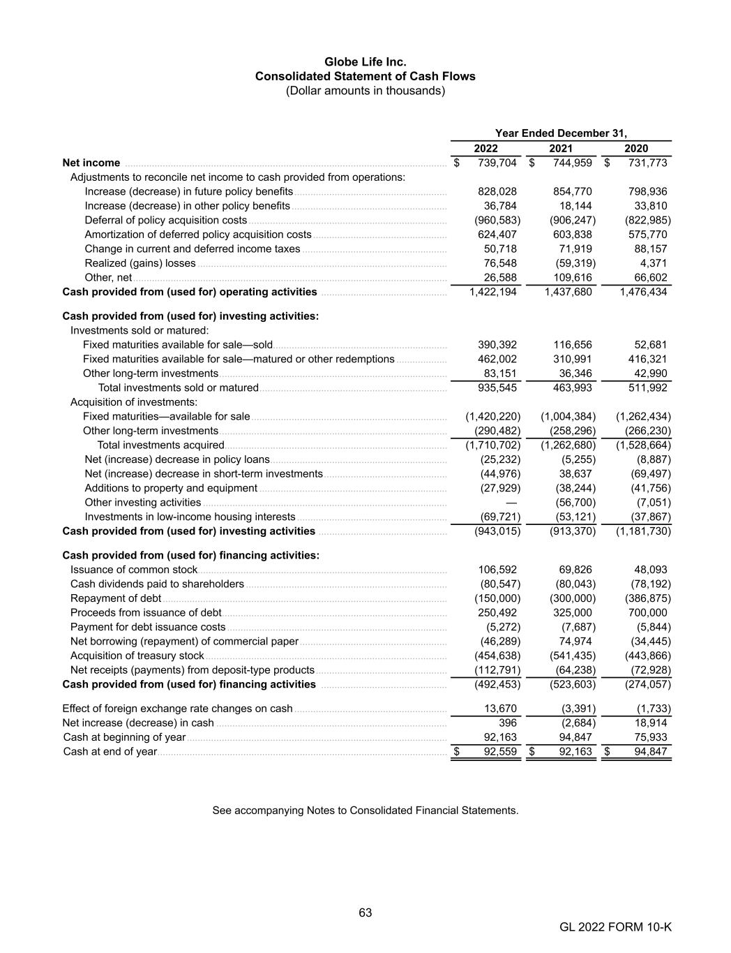 Globe Life Inc. Consolidated Statement of Cash Flows (Dollar amounts in thousands) Year Ended December 31, 2022 2021 2020 Net income ........................................................................................................................ $ 739,704 $ 744,959 $ 731,773 Adjustments to reconcile net income to cash provided from operations: Increase (decrease) in future policy benefits ......................................................... 828,028 854,770 798,936 Increase (decrease) in other policy benefits .......................................................... 36,784 18,144 33,810 Deferral of policy acquisition costs .......................................................................... (960,583) (906,247) (822,985) Amortization of deferred policy acquisition costs .................................................. 624,407 603,838 575,770 Change in current and deferred income taxes ...................................................... 50,718 71,919 88,157 Realized (gains) losses ............................................................................................. 76,548 (59,319) 4,371 Other, net ..................................................................................................................... 26,588 109,616 66,602 Cash provided from (used for) operating activities ............................................... 1,422,194 1,437,680 1,476,434 Cash provided from (used for) investing activities: Investments sold or matured: Fixed maturities available for sale—sold................................................................. 390,392 116,656 52,681 Fixed maturities available for sale—matured or other redemptions ................... 462,002 310,991 416,321 Other long-term investments..................................................................................... 83,151 36,346 42,990 Total investments sold or matured...................................................................... 935,545 463,993 511,992 Acquisition of investments: Fixed maturities—available for sale ......................................................................... (1,420,220) (1,004,384) (1,262,434) Other long-term investments..................................................................................... (290,482) (258,296) (266,230) Total investments acquired................................................................................... (1,710,702) (1,262,680) (1,528,664) Net (increase) decrease in policy loans.................................................................. (25,232) (5,255) (8,887) Net (increase) decrease in short-term investments.............................................. (44,976) 38,637 (69,497) Additions to property and equipment ...................................................................... (27,929) (38,244) (41,756) Other investing activities ........................................................................................... — (56,700) (7,051) Investments in low-income housing interests ........................................................ (69,721) (53,121) (37,867) Cash provided from (used for) investing activities ................................................ (943,015) (913,370) (1,181,730) Cash provided from (used for) financing activities: Issuance of common stock............................................................................................. 106,592 69,826 48,093 Cash dividends paid to shareholders ........................................................................... (80,547) (80,043) (78,192) Repayment of debt .......................................................................................................... (150,000) (300,000) (386,875) Proceeds from issuance of debt.................................................................................... 250,492 325,000 700,000 Payment for debt issuance costs .................................................................................. (5,272) (7,687) (5,844) Net borrowing (repayment) of commercial paper ....................................................... (46,289) 74,974 (34,445) Acquisition of treasury stock .......................................................................................... (454,638) (541,435) (443,866) Net receipts (payments) from deposit-type products ................................................. (112,791) (64,238) (72,928) Cash provided from (used for) financing activities ............................................... (492,453) (523,603) (274,057) Effect of foreign exchange rate changes on cash ......................................................... 13,670 (3,391) (1,733) Net increase (decrease) in cash ...................................................................................... 396 (2,684) 18,914 Cash at beginning of year ................................................................................................. 92,163 94,847 75,933 Cash at end of year............................................................................................................ $ 92,559 $ 92,163 $ 94,847 See accompanying Notes to Consolidated Financial Statements. 63 GL 2022 FORM 10-K