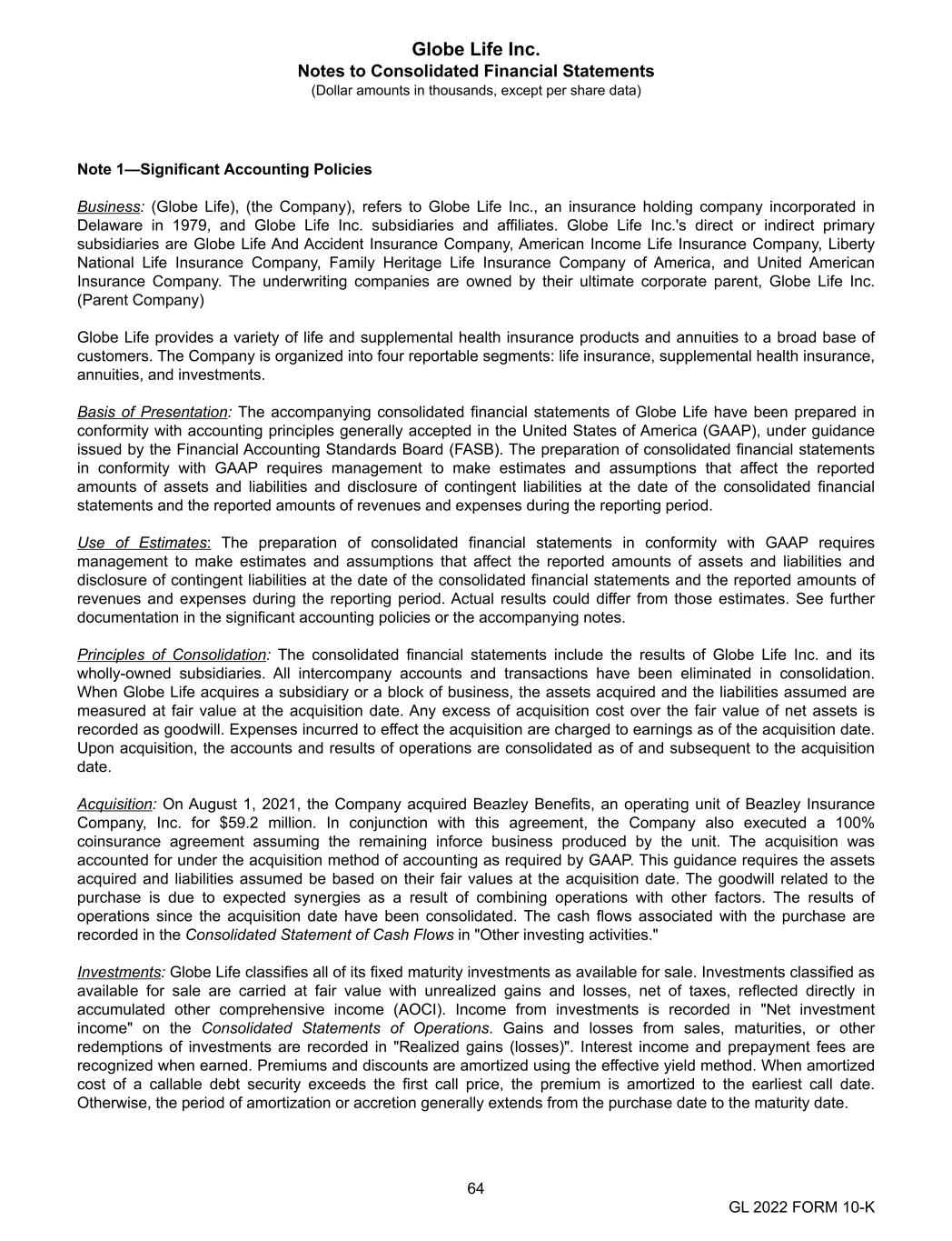 Note 1—Significant Accounting Policies Business: (Globe Life), (the Company), refers to Globe Life Inc., an insurance holding company incorporated in Delaware in 1979, and Globe Life Inc. subsidiaries and affiliates. Globe Life Inc.'s direct or indirect primary subsidiaries are Globe Life And Accident Insurance Company, American Income Life Insurance Company, Liberty National Life Insurance Company, Family Heritage Life Insurance Company of America, and United American Insurance Company. The underwriting companies are owned by their ultimate corporate parent, Globe Life Inc. (Parent Company) Globe Life provides a variety of life and supplemental health insurance products and annuities to a broad base of customers. The Company is organized into four reportable segments: life insurance, supplemental health insurance, annuities, and investments. Basis of Presentation: The accompanying consolidated financial statements of Globe Life have been prepared in conformity with accounting principles generally accepted in the United States of America (GAAP), under guidance issued by the Financial Accounting Standards Board (FASB). The preparation of consolidated financial statements in conformity with GAAP requires management to make estimates and assumptions that affect the reported amounts of assets and liabilities and disclosure of contingent liabilities at the date of the consolidated financial statements and the reported amounts of revenues and expenses during the reporting period. Use of Estimates: The preparation of consolidated financial statements in conformity with GAAP requires management to make estimates and assumptions that affect the reported amounts of assets and liabilities and disclosure of contingent liabilities at the date of the consolidated financial statements and the reported amounts of revenues and expenses during the reporting period. Actual results could differ from those estimates. See further documentation in the significant accounting policies or the accompanying notes. Principles of Consolidation: The consolidated financial statements include the results of Globe Life Inc. and its wholly-owned subsidiaries. All intercompany accounts and transactions have been eliminated in consolidation. When Globe Life acquires a subsidiary or a block of business, the assets acquired and the liabilities assumed are measured at fair value at the acquisition date. Any excess of acquisition cost over the fair value of net assets is recorded as goodwill. Expenses incurred to effect the acquisition are charged to earnings as of the acquisition date. Upon acquisition, the accounts and results of operations are consolidated as of and subsequent to the acquisition date. Acquisition: On August 1, 2021, the Company acquired Beazley Benefits, an operating unit of Beazley Insurance Company, Inc. for $59.2 million. In conjunction with this agreement, the Company also executed a 100% coinsurance agreement assuming the remaining inforce business produced by the unit. The acquisition was accounted for under the acquisition method of accounting as required by GAAP. This guidance requires the assets acquired and liabilities assumed be based on their fair values at the acquisition date. The goodwill related to the purchase is due to expected synergies as a result of combining operations with other factors. The results of operations since the acquisition date have been consolidated. The cash flows associated with the purchase are recorded in the Consolidated Statement of Cash Flows in "Other investing activities." Investments: Globe Life classifies all of its fixed maturity investments as available for sale. Investments classified as available for sale are carried at fair value with unrealized gains and losses, net of taxes, reflected directly in accumulated other comprehensive income (AOCI). Income from investments is recorded in "Net investment income" on the Consolidated Statements of Operations. Gains and losses from sales, maturities, or other redemptions of investments are recorded in "Realized gains (losses)". Interest income and prepayment fees are recognized when earned. Premiums and discounts are amortized using the effective yield method. When amortized cost of a callable debt security exceeds the first call price, the premium is amortized to the earliest call date. Otherwise, the period of amortization or accretion generally extends from the purchase date to the maturity date. Globe Life Inc. Notes to Consolidated Financial Statements (Dollar amounts in thousands, except per share data) 64 GL 2022 FORM 10-K
