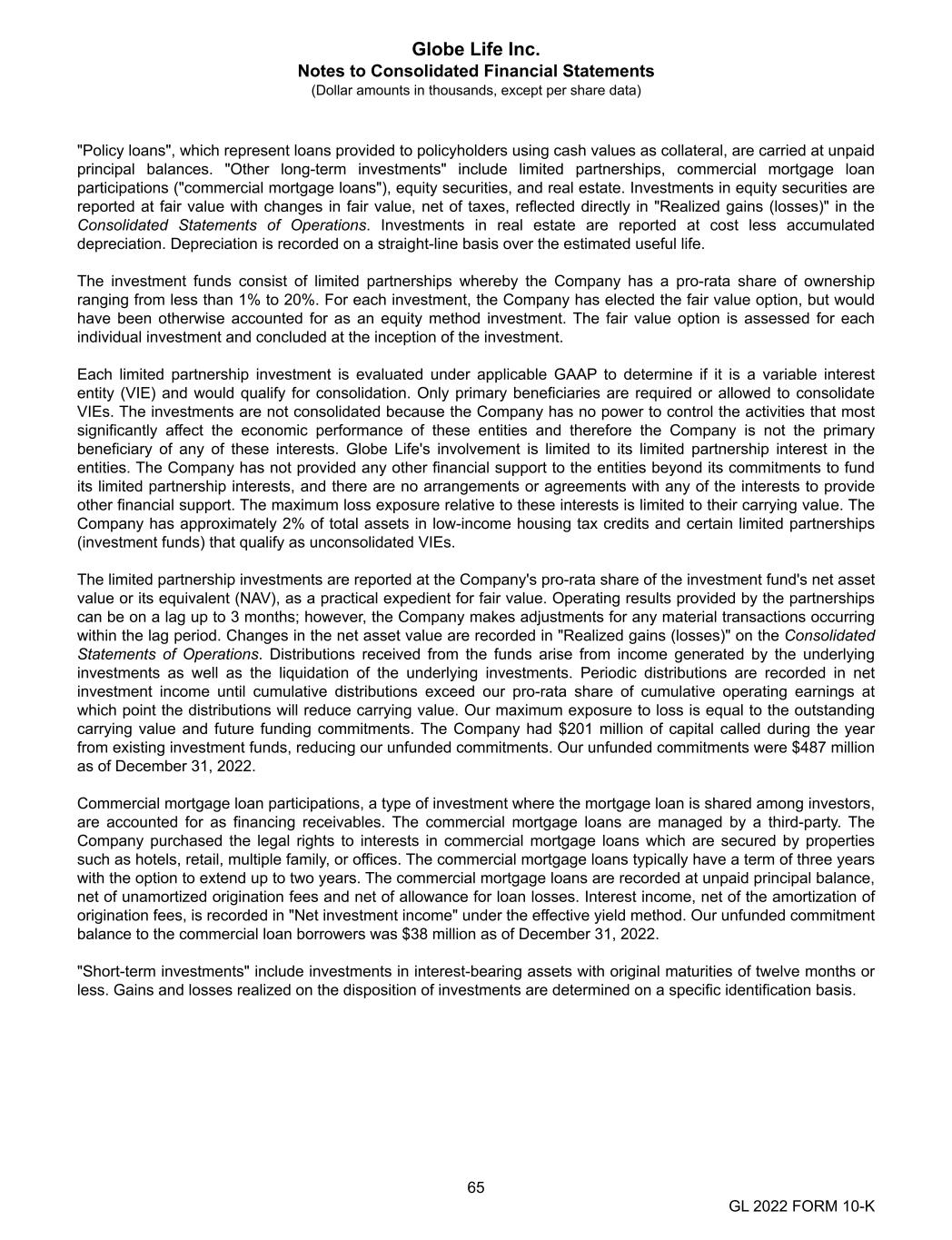 "Policy loans", which represent loans provided to policyholders using cash values as collateral, are carried at unpaid principal balances. "Other long-term investments" include limited partnerships, commercial mortgage loan participations ("commercial mortgage loans"), equity securities, and real estate. Investments in equity securities are reported at fair value with changes in fair value, net of taxes, reflected directly in "Realized gains (losses)" in the Consolidated Statements of Operations. Investments in real estate are reported at cost less accumulated depreciation. Depreciation is recorded on a straight-line basis over the estimated useful life. The investment funds consist of limited partnerships whereby the Company has a pro-rata share of ownership ranging from less than 1% to 20%. For each investment, the Company has elected the fair value option, but would have been otherwise accounted for as an equity method investment. The fair value option is assessed for each individual investment and concluded at the inception of the investment. Each limited partnership investment is evaluated under applicable GAAP to determine if it is a variable interest entity (VIE) and would qualify for consolidation. Only primary beneficiaries are required or allowed to consolidate VIEs. The investments are not consolidated because the Company has no power to control the activities that most significantly affect the economic performance of these entities and therefore the Company is not the primary beneficiary of any of these interests. Globe Life's involvement is limited to its limited partnership interest in the entities. The Company has not provided any other financial support to the entities beyond its commitments to fund its limited partnership interests, and there are no arrangements or agreements with any of the interests to provide other financial support. The maximum loss exposure relative to these interests is limited to their carrying value. The Company has approximately 2% of total assets in low-income housing tax credits and certain limited partnerships (investment funds) that qualify as unconsolidated VIEs. The limited partnership investments are reported at the Company's pro-rata share of the investment fund's net asset value or its equivalent (NAV), as a practical expedient for fair value. Operating results provided by the partnerships can be on a lag up to 3 months; however, the Company makes adjustments for any material transactions occurring within the lag period. Changes in the net asset value are recorded in "Realized gains (losses)" on the Consolidated Statements of Operations. Distributions received from the funds arise from income generated by the underlying investments as well as the liquidation of the underlying investments. Periodic distributions are recorded in net investment income until cumulative distributions exceed our pro-rata share of cumulative operating earnings at which point the distributions will reduce carrying value. Our maximum exposure to loss is equal to the outstanding carrying value and future funding commitments. The Company had $201 million of capital called during the year from existing investment funds, reducing our unfunded commitments. Our unfunded commitments were $487 million as of December 31, 2022. Commercial mortgage loan participations, a type of investment where the mortgage loan is shared among investors, are accounted for as financing receivables. The commercial mortgage loans are managed by a third-party. The Company purchased the legal rights to interests in commercial mortgage loans which are secured by properties such as hotels, retail, multiple family, or offices. The commercial mortgage loans typically have a term of three years with the option to extend up to two years. The commercial mortgage loans are recorded at unpaid principal balance, net of unamortized origination fees and net of allowance for loan losses. Interest income, net of the amortization of origination fees, is recorded in "Net investment income" under the effective yield method. Our unfunded commitment balance to the commercial loan borrowers was $38 million as of December 31, 2022. "Short-term investments" include investments in interest-bearing assets with original maturities of twelve months or less. Gains and losses realized on the disposition of investments are determined on a specific identification basis. Globe Life Inc. Notes to Consolidated Financial Statements (Dollar amounts in thousands, except per share data) 65 GL 2022 FORM 10-K