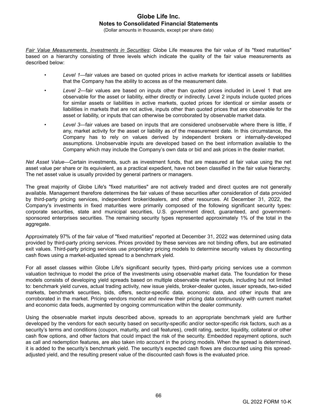 Fair Value Measurements, Investments in Securities: Globe Life measures the fair value of its "fixed maturities" based on a hierarchy consisting of three levels which indicate the quality of the fair value measurements as described below: • Level 1—fair values are based on quoted prices in active markets for identical assets or liabilities that the Company has the ability to access as of the measurement date. • Level 2—fair values are based on inputs other than quoted prices included in Level 1 that are observable for the asset or liability, either directly or indirectly. Level 2 inputs include quoted prices for similar assets or liabilities in active markets, quoted prices for identical or similar assets or liabilities in markets that are not active, inputs other than quoted prices that are observable for the asset or liability, or inputs that can otherwise be corroborated by observable market data. • Level 3—fair values are based on inputs that are considered unobservable where there is little, if any, market activity for the asset or liability as of the measurement date. In this circumstance, the Company has to rely on values derived by independent brokers or internally-developed assumptions. Unobservable inputs are developed based on the best information available to the Company which may include the Company’s own data or bid and ask prices in the dealer market. Net Asset Value—Certain investments, such as investment funds, that are measured at fair value using the net asset value per share or its equivalent, as a practical expedient, have not been classified in the fair value hierarchy. The net asset value is usually provided by general partners or managers. The great majority of Globe Life's "fixed maturities" are not actively traded and direct quotes are not generally available. Management therefore determines the fair values of these securities after consideration of data provided by third-party pricing services, independent broker/dealers, and other resources. At December 31, 2022, the Company's investments in fixed maturities were primarily composed of the following significant security types: corporate securities, state and municipal securities, U.S. government direct, guaranteed, and government- sponsored enterprises securities. The remaining security types represented approximately 1% of the total in the aggregate. Approximately 97% of the fair value of "fixed maturities" reported at December 31, 2022 was determined using data provided by third-party pricing services. Prices provided by these services are not binding offers, but are estimated exit values. Third-party pricing services use proprietary pricing models to determine security values by discounting cash flows using a market-adjusted spread to a benchmark yield. For all asset classes within Globe Life's significant security types, third-party pricing services use a common valuation technique to model the price of the investments using observable market data. The foundation for these models consists of developing yield spreads based on multiple observable market inputs, including but not limited to: benchmark yield curves, actual trading activity, new issue yields, broker-dealer quotes, issuer spreads, two-sided markets, benchmark securities, bids, offers, sector-specific data, economic data, and other inputs that are corroborated in the market. Pricing vendors monitor and review their pricing data continuously with current market and economic data feeds, augmented by ongoing communication within the dealer community. Using the observable market inputs described above, spreads to an appropriate benchmark yield are further developed by the vendors for each security based on security-specific and/or sector-specific risk factors, such as a security’s terms and conditions (coupon, maturity, and call features), credit rating, sector, liquidity, collateral or other cash flow options, and other factors that could impact the risk of the security. Embedded repayment options, such as call and redemption features, are also taken into account in the pricing models. When the spread is determined, it is added to the security’s benchmark yield. The security's expected cash flows are discounted using this spread- adjusted yield, and the resulting present value of the discounted cash flows is the evaluated price. Globe Life Inc. Notes to Consolidated Financial Statements (Dollar amounts in thousands, except per share data) 66 GL 2022 FORM 10-K
