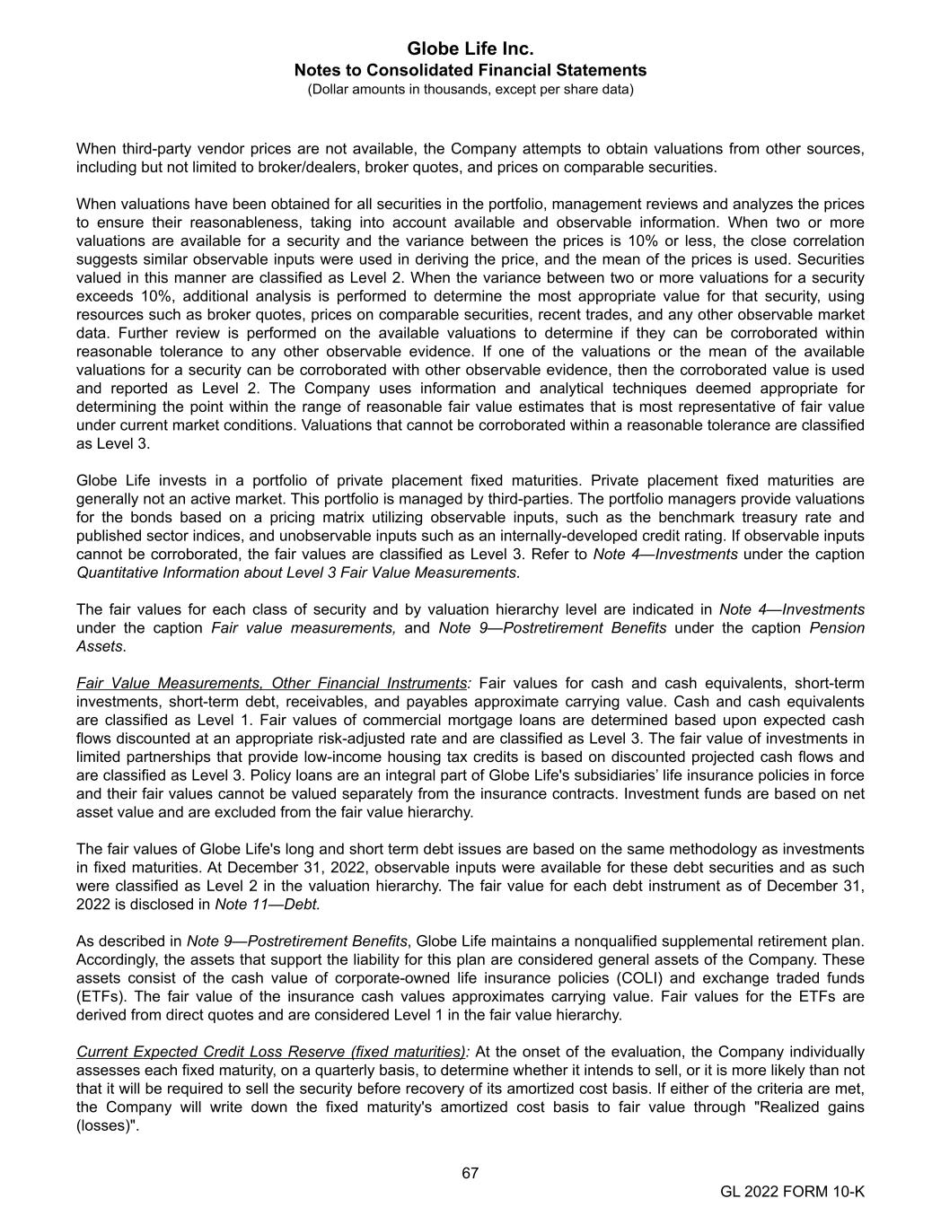 When third-party vendor prices are not available, the Company attempts to obtain valuations from other sources, including but not limited to broker/dealers, broker quotes, and prices on comparable securities. When valuations have been obtained for all securities in the portfolio, management reviews and analyzes the prices to ensure their reasonableness, taking into account available and observable information. When two or more valuations are available for a security and the variance between the prices is 10% or less, the close correlation suggests similar observable inputs were used in deriving the price, and the mean of the prices is used. Securities valued in this manner are classified as Level 2. When the variance between two or more valuations for a security exceeds 10%, additional analysis is performed to determine the most appropriate value for that security, using resources such as broker quotes, prices on comparable securities, recent trades, and any other observable market data. Further review is performed on the available valuations to determine if they can be corroborated within reasonable tolerance to any other observable evidence. If one of the valuations or the mean of the available valuations for a security can be corroborated with other observable evidence, then the corroborated value is used and reported as Level 2. The Company uses information and analytical techniques deemed appropriate for determining the point within the range of reasonable fair value estimates that is most representative of fair value under current market conditions. Valuations that cannot be corroborated within a reasonable tolerance are classified as Level 3. Globe Life invests in a portfolio of private placement fixed maturities. Private placement fixed maturities are generally not an active market. This portfolio is managed by third-parties. The portfolio managers provide valuations for the bonds based on a pricing matrix utilizing observable inputs, such as the benchmark treasury rate and published sector indices, and unobservable inputs such as an internally-developed credit rating. If observable inputs cannot be corroborated, the fair values are classified as Level 3. Refer to Note 4—Investments under the caption Quantitative Information about Level 3 Fair Value Measurements. The fair values for each class of security and by valuation hierarchy level are indicated in Note 4—Investments under the caption Fair value measurements, and Note 9—Postretirement Benefits under the caption Pension Assets. Fair Value Measurements, Other Financial Instruments: Fair values for cash and cash equivalents, short-term investments, short-term debt, receivables, and payables approximate carrying value. Cash and cash equivalents are classified as Level 1. Fair values of commercial mortgage loans are determined based upon expected cash flows discounted at an appropriate risk-adjusted rate and are classified as Level 3. The fair value of investments in limited partnerships that provide low-income housing tax credits is based on discounted projected cash flows and are classified as Level 3. Policy loans are an integral part of Globe Life's subsidiaries’ life insurance policies in force and their fair values cannot be valued separately from the insurance contracts. Investment funds are based on net asset value and are excluded from the fair value hierarchy. The fair values of Globe Life's long and short term debt issues are based on the same methodology as investments in fixed maturities. At December 31, 2022, observable inputs were available for these debt securities and as such were classified as Level 2 in the valuation hierarchy. The fair value for each debt instrument as of December 31, 2022 is disclosed in Note 11—Debt. As described in Note 9—Postretirement Benefits, Globe Life maintains a nonqualified supplemental retirement plan. Accordingly, the assets that support the liability for this plan are considered general assets of the Company. These assets consist of the cash value of corporate-owned life insurance policies (COLI) and exchange traded funds (ETFs). The fair value of the insurance cash values approximates carrying value. Fair values for the ETFs are derived from direct quotes and are considered Level 1 in the fair value hierarchy. Current Expected Credit Loss Reserve (fixed maturities): At the onset of the evaluation, the Company individually assesses each fixed maturity, on a quarterly basis, to determine whether it intends to sell, or it is more likely than not that it will be required to sell the security before recovery of its amortized cost basis. If either of the criteria are met, the Company will write down the fixed maturity's amortized cost basis to fair value through "Realized gains (losses)". Globe Life Inc. Notes to Consolidated Financial Statements (Dollar amounts in thousands, except per share data) 67 GL 2022 FORM 10-K