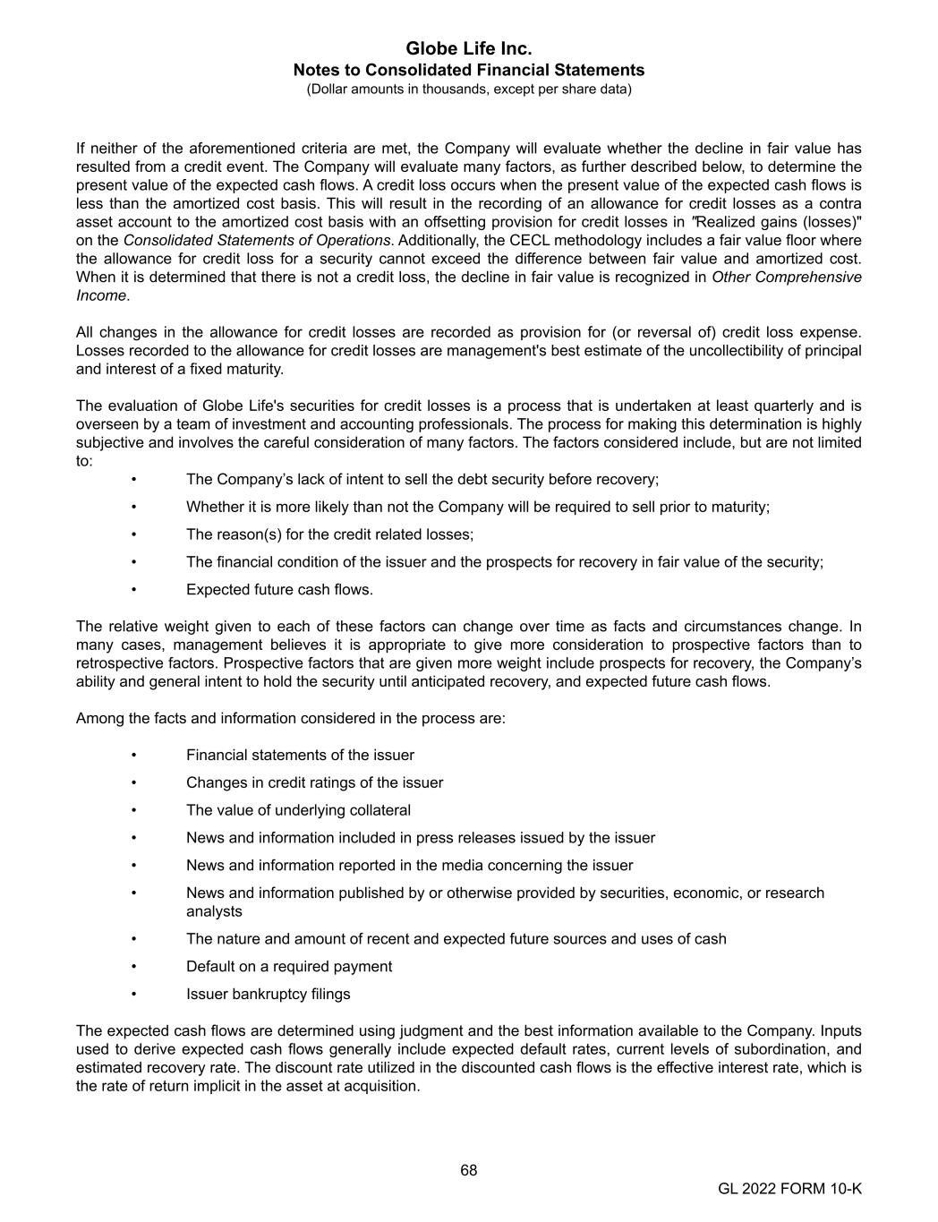 If neither of the aforementioned criteria are met, the Company will evaluate whether the decline in fair value has resulted from a credit event. The Company will evaluate many factors, as further described below, to determine the present value of the expected cash flows. A credit loss occurs when the present value of the expected cash flows is less than the amortized cost basis. This will result in the recording of an allowance for credit losses as a contra asset account to the amortized cost basis with an offsetting provision for credit losses in "Realized gains (losses)" on the Consolidated Statements of Operations. Additionally, the CECL methodology includes a fair value floor where the allowance for credit loss for a security cannot exceed the difference between fair value and amortized cost. When it is determined that there is not a credit loss, the decline in fair value is recognized in Other Comprehensive Income. All changes in the allowance for credit losses are recorded as provision for (or reversal of) credit loss expense. Losses recorded to the allowance for credit losses are management's best estimate of the uncollectibility of principal and interest of a fixed maturity. The evaluation of Globe Life's securities for credit losses is a process that is undertaken at least quarterly and is overseen by a team of investment and accounting professionals. The process for making this determination is highly subjective and involves the careful consideration of many factors. The factors considered include, but are not limited to: • The Company’s lack of intent to sell the debt security before recovery; • Whether it is more likely than not the Company will be required to sell prior to maturity; • The reason(s) for the credit related losses; • The financial condition of the issuer and the prospects for recovery in fair value of the security; • Expected future cash flows. The relative weight given to each of these factors can change over time as facts and circumstances change. In many cases, management believes it is appropriate to give more consideration to prospective factors than to retrospective factors. Prospective factors that are given more weight include prospects for recovery, the Company’s ability and general intent to hold the security until anticipated recovery, and expected future cash flows. Among the facts and information considered in the process are: • Financial statements of the issuer • Changes in credit ratings of the issuer • The value of underlying collateral • News and information included in press releases issued by the issuer • News and information reported in the media concerning the issuer • News and information published by or otherwise provided by securities, economic, or research analysts • The nature and amount of recent and expected future sources and uses of cash • Default on a required payment • Issuer bankruptcy filings The expected cash flows are determined using judgment and the best information available to the Company. Inputs used to derive expected cash flows generally include expected default rates, current levels of subordination, and estimated recovery rate. The discount rate utilized in the discounted cash flows is the effective interest rate, which is the rate of return implicit in the asset at acquisition. Globe Life Inc. Notes to Consolidated Financial Statements (Dollar amounts in thousands, except per share data) 68 GL 2022 FORM 10-K