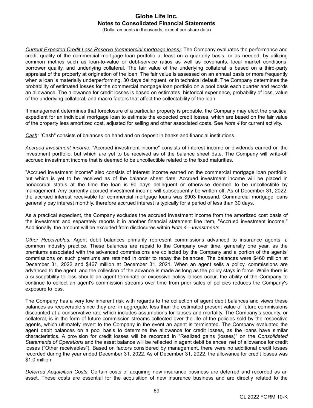 Current Expected Credit Loss Reserve (commercial mortgage loans): The Company evaluates the performance and credit quality of the commercial mortgage loan portfolio at least on a quarterly basis, or as needed, by utilizing common metrics such as loan-to-value or debt-service ratios as well as covenants, local market conditions, borrower quality, and underlying collateral. The fair value of the underlying collateral is based on a third-party appraisal of the property at origination of the loan. The fair value is assessed on an annual basis or more frequently when a loan is materially underperforming, 30 days delinquent, or in technical default. The Company determines the probability of estimated losses for the commercial mortgage loan portfolio on a pool basis each quarter and records an allowance. The allowance for credit losses is based on estimates, historical experience, probability of loss, value of the underlying collateral, and macro factors that affect the collectability of the loan. If management determines that foreclosure of a particular property is probable, the Company may elect the practical expedient for an individual mortgage loan to estimate the expected credit losses, which are based on the fair value of the property less amortized cost, adjusted for selling and other associated costs. See Note 4 for current activity. Cash: "Cash" consists of balances on hand and on deposit in banks and financial institutions. Accrued investment income: "Accrued investment income" consists of interest income or dividends earned on the investment portfolio, but which are yet to be received as of the balance sheet date. The Company will write-off accrued investment income that is deemed to be uncollectible related to the fixed maturities. "Accrued investment income" also consists of interest income earned on the commercial mortgage loan portfolio, but which is yet to be received as of the balance sheet date. Accrued investment income will be placed in nonaccrual status at the time the loan is 90 days delinquent or otherwise deemed to be uncollectible by management. Any currently accrued investment income will subsequently be written off. As of December 31, 2022, the accrued interest receivable for commercial mortgage loans was $903 thousand. Commercial mortgage loans generally pay interest monthly, therefore accrued interest is typically for a period of less than 30 days. As a practical expedient, the Company excludes the accrued investment income from the amortized cost basis of the investment and separately reports it in another financial statement line item, "Accrued investment income." Additionally, the amount will be excluded from disclosures within Note 4—Investments. Other Receivables: Agent debit balances primarily represent commissions advanced to insurance agents, a common industry practice. These balances are repaid to the Company over time, generally one year, as the premiums associated with the advanced commissions are collected by the Company and a portion of the agents' commissions on such premiums are retained in order to repay the balances. The balances were $460 million at December 31, 2022 and $467 million at December 31, 2021. When an agent sells a policy, commissions are advanced to the agent, and the collection of the advance is made as long as the policy stays in force. While there is a susceptibility to loss should an agent terminate or excessive policy lapses occur, the ability of the Company to continue to collect an agent's commission streams over time from prior sales of policies reduces the Company's exposure to loss. The Company has a very low inherent risk with regards to the collection of agent debit balances and views these balances as recoverable since they are, in aggregate, less than the estimated present value of future commissions discounted at a conservative rate which includes assumptions for lapses and mortality. The Company’s security, or collateral, is in the form of future commission streams collected over the life of the policies sold by the respective agents, which ultimately revert to the Company in the event an agent is terminated. The Company evaluated the agent debit balances on a pool basis to determine the allowance for credit losses, as the loans have similar characteristics. A provision for credit losses will be recorded in "Realized gains (losses)" on the Consolidated Statements of Operations and the asset balance will be reflected in agent debit balances, net of allowance for credit losses ("Other receivables"). Based on factors considered by management, there were no additional credit losses recorded during the year ended December 31, 2022. As of December 31, 2022, the allowance for credit losses was $1.0 million. Deferred Acquisition Costs: Certain costs of acquiring new insurance business are deferred and recorded as an asset. These costs are essential for the acquisition of new insurance business and are directly related to the Globe Life Inc. Notes to Consolidated Financial Statements (Dollar amounts in thousands, except per share data) 69 GL 2022 FORM 10-K