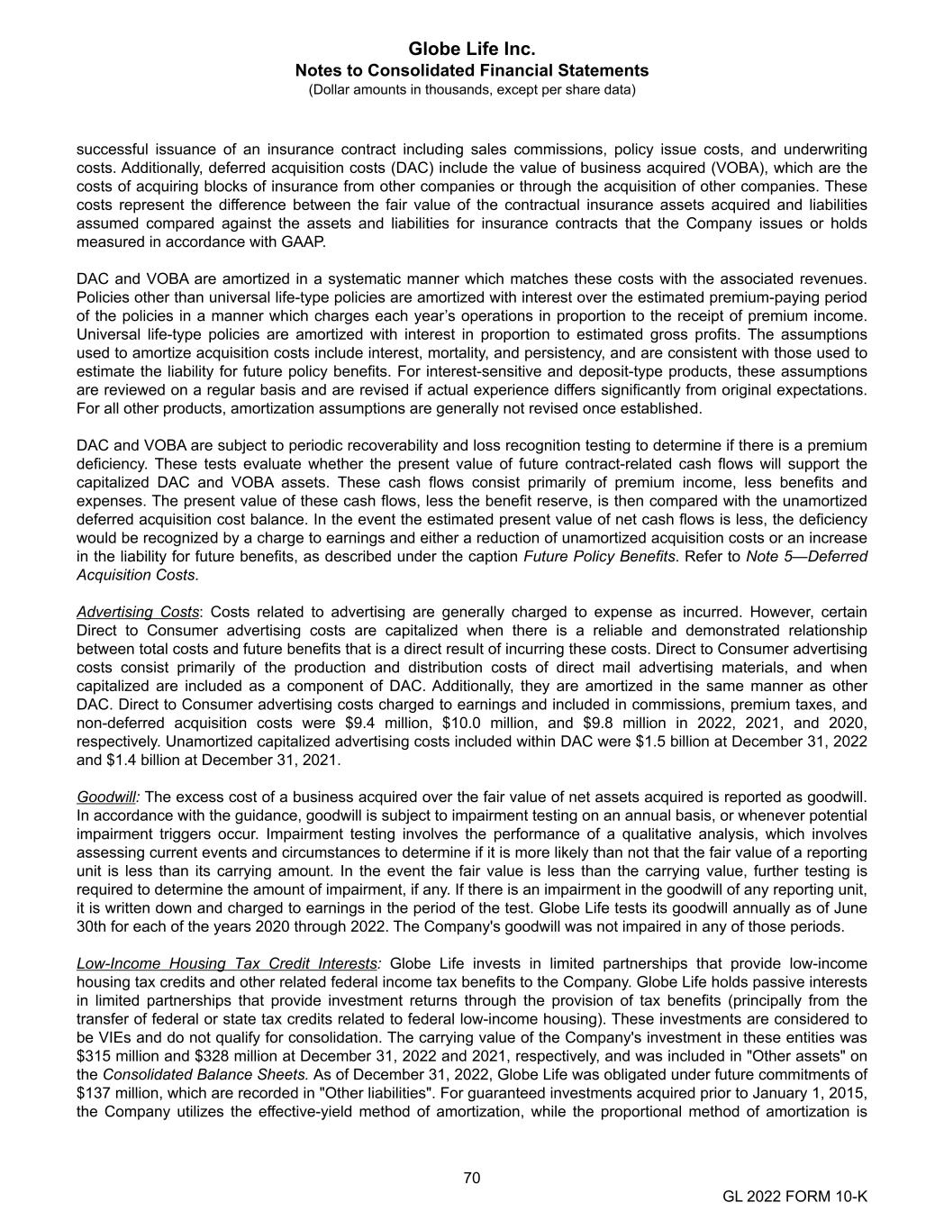 successful issuance of an insurance contract including sales commissions, policy issue costs, and underwriting costs. Additionally, deferred acquisition costs (DAC) include the value of business acquired (VOBA), which are the costs of acquiring blocks of insurance from other companies or through the acquisition of other companies. These costs represent the difference between the fair value of the contractual insurance assets acquired and liabilities assumed compared against the assets and liabilities for insurance contracts that the Company issues or holds measured in accordance with GAAP. DAC and VOBA are amortized in a systematic manner which matches these costs with the associated revenues. Policies other than universal life-type policies are amortized with interest over the estimated premium-paying period of the policies in a manner which charges each year’s operations in proportion to the receipt of premium income. Universal life-type policies are amortized with interest in proportion to estimated gross profits. The assumptions used to amortize acquisition costs include interest, mortality, and persistency, and are consistent with those used to estimate the liability for future policy benefits. For interest-sensitive and deposit-type products, these assumptions are reviewed on a regular basis and are revised if actual experience differs significantly from original expectations. For all other products, amortization assumptions are generally not revised once established. DAC and VOBA are subject to periodic recoverability and loss recognition testing to determine if there is a premium deficiency. These tests evaluate whether the present value of future contract-related cash flows will support the capitalized DAC and VOBA assets. These cash flows consist primarily of premium income, less benefits and expenses. The present value of these cash flows, less the benefit reserve, is then compared with the unamortized deferred acquisition cost balance. In the event the estimated present value of net cash flows is less, the deficiency would be recognized by a charge to earnings and either a reduction of unamortized acquisition costs or an increase in the liability for future benefits, as described under the caption Future Policy Benefits. Refer to Note 5—Deferred Acquisition Costs. Advertising Costs: Costs related to advertising are generally charged to expense as incurred. However, certain Direct to Consumer advertising costs are capitalized when there is a reliable and demonstrated relationship between total costs and future benefits that is a direct result of incurring these costs. Direct to Consumer advertising costs consist primarily of the production and distribution costs of direct mail advertising materials, and when capitalized are included as a component of DAC. Additionally, they are amortized in the same manner as other DAC. Direct to Consumer advertising costs charged to earnings and included in commissions, premium taxes, and non-deferred acquisition costs were $9.4 million, $10.0 million, and $9.8 million in 2022, 2021, and 2020, respectively. Unamortized capitalized advertising costs included within DAC were $1.5 billion at December 31, 2022 and $1.4 billion at December 31, 2021. Goodwill: The excess cost of a business acquired over the fair value of net assets acquired is reported as goodwill. In accordance with the guidance, goodwill is subject to impairment testing on an annual basis, or whenever potential impairment triggers occur. Impairment testing involves the performance of a qualitative analysis, which involves assessing current events and circumstances to determine if it is more likely than not that the fair value of a reporting unit is less than its carrying amount. In the event the fair value is less than the carrying value, further testing is required to determine the amount of impairment, if any. If there is an impairment in the goodwill of any reporting unit, it is written down and charged to earnings in the period of the test. Globe Life tests its goodwill annually as of June 30th for each of the years 2020 through 2022. The Company's goodwill was not impaired in any of those periods. Low-Income Housing Tax Credit Interests: Globe Life invests in limited partnerships that provide low-income housing tax credits and other related federal income tax benefits to the Company. Globe Life holds passive interests in limited partnerships that provide investment returns through the provision of tax benefits (principally from the transfer of federal or state tax credits related to federal low-income housing). These investments are considered to be VIEs and do not qualify for consolidation. The carrying value of the Company's investment in these entities was $315 million and $328 million at December 31, 2022 and 2021, respectively, and was included in "Other assets" on the Consolidated Balance Sheets. As of December 31, 2022, Globe Life was obligated under future commitments of $137 million, which are recorded in "Other liabilities". For guaranteed investments acquired prior to January 1, 2015, the Company utilizes the effective-yield method of amortization, while the proportional method of amortization is Globe Life Inc. Notes to Consolidated Financial Statements (Dollar amounts in thousands, except per share data) 70 GL 2022 FORM 10-K