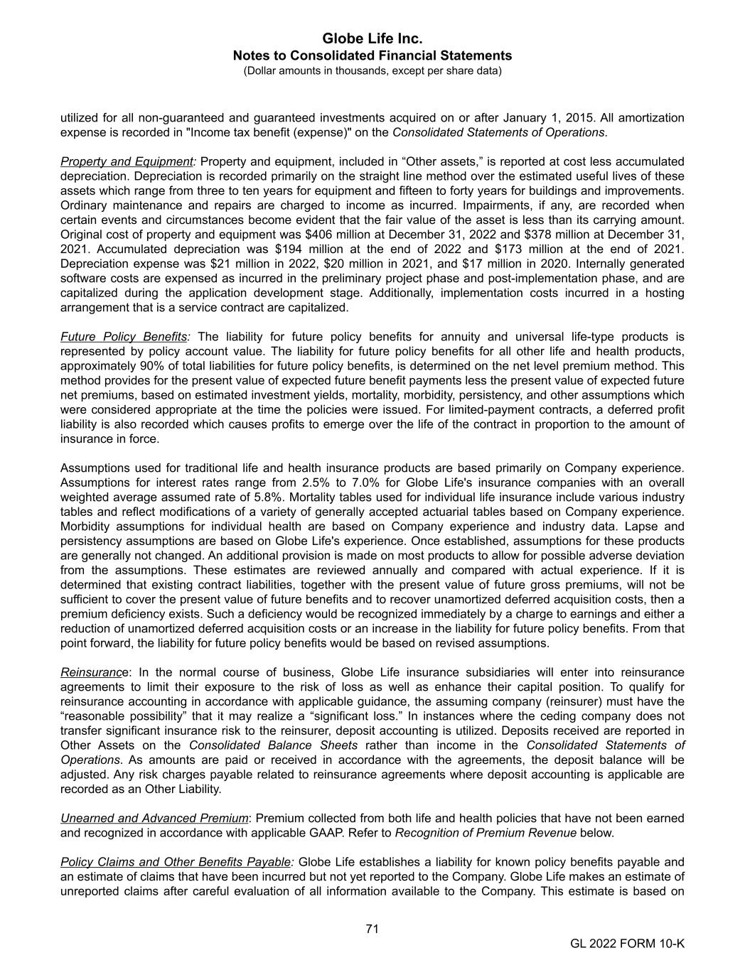utilized for all non-guaranteed and guaranteed investments acquired on or after January 1, 2015. All amortization expense is recorded in "Income tax benefit (expense)" on the Consolidated Statements of Operations. Property and Equipment: Property and equipment, included in “Other assets,” is reported at cost less accumulated depreciation. Depreciation is recorded primarily on the straight line method over the estimated useful lives of these assets which range from three to ten years for equipment and fifteen to forty years for buildings and improvements. Ordinary maintenance and repairs are charged to income as incurred. Impairments, if any, are recorded when certain events and circumstances become evident that the fair value of the asset is less than its carrying amount. Original cost of property and equipment was $406 million at December 31, 2022 and $378 million at December 31, 2021. Accumulated depreciation was $194 million at the end of 2022 and $173 million at the end of 2021. Depreciation expense was $21 million in 2022, $20 million in 2021, and $17 million in 2020. Internally generated software costs are expensed as incurred in the preliminary project phase and post-implementation phase, and are capitalized during the application development stage. Additionally, implementation costs incurred in a hosting arrangement that is a service contract are capitalized. Future Policy Benefits: The liability for future policy benefits for annuity and universal life-type products is represented by policy account value. The liability for future policy benefits for all other life and health products, approximately 90% of total liabilities for future policy benefits, is determined on the net level premium method. This method provides for the present value of expected future benefit payments less the present value of expected future net premiums, based on estimated investment yields, mortality, morbidity, persistency, and other assumptions which were considered appropriate at the time the policies were issued. For limited-payment contracts, a deferred profit liability is also recorded which causes profits to emerge over the life of the contract in proportion to the amount of insurance in force. Assumptions used for traditional life and health insurance products are based primarily on Company experience. Assumptions for interest rates range from 2.5% to 7.0% for Globe Life's insurance companies with an overall weighted average assumed rate of 5.8%. Mortality tables used for individual life insurance include various industry tables and reflect modifications of a variety of generally accepted actuarial tables based on Company experience. Morbidity assumptions for individual health are based on Company experience and industry data. Lapse and persistency assumptions are based on Globe Life's experience. Once established, assumptions for these products are generally not changed. An additional provision is made on most products to allow for possible adverse deviation from the assumptions. These estimates are reviewed annually and compared with actual experience. If it is determined that existing contract liabilities, together with the present value of future gross premiums, will not be sufficient to cover the present value of future benefits and to recover unamortized deferred acquisition costs, then a premium deficiency exists. Such a deficiency would be recognized immediately by a charge to earnings and either a reduction of unamortized deferred acquisition costs or an increase in the liability for future policy benefits. From that point forward, the liability for future policy benefits would be based on revised assumptions. Reinsurance: In the normal course of business, Globe Life insurance subsidiaries will enter into reinsurance agreements to limit their exposure to the risk of loss as well as enhance their capital position. To qualify for reinsurance accounting in accordance with applicable guidance, the assuming company (reinsurer) must have the “reasonable possibility” that it may realize a “significant loss.” In instances where the ceding company does not transfer significant insurance risk to the reinsurer, deposit accounting is utilized. Deposits received are reported in Other Assets on the Consolidated Balance Sheets rather than income in the Consolidated Statements of Operations. As amounts are paid or received in accordance with the agreements, the deposit balance will be adjusted. Any risk charges payable related to reinsurance agreements where deposit accounting is applicable are recorded as an Other Liability. Unearned and Advanced Premium: Premium collected from both life and health policies that have not been earned and recognized in accordance with applicable GAAP. Refer to Recognition of Premium Revenue below. Policy Claims and Other Benefits Payable: Globe Life establishes a liability for known policy benefits payable and an estimate of claims that have been incurred but not yet reported to the Company. Globe Life makes an estimate of unreported claims after careful evaluation of all information available to the Company. This estimate is based on Globe Life Inc. Notes to Consolidated Financial Statements (Dollar amounts in thousands, except per share data) 71 GL 2022 FORM 10-K