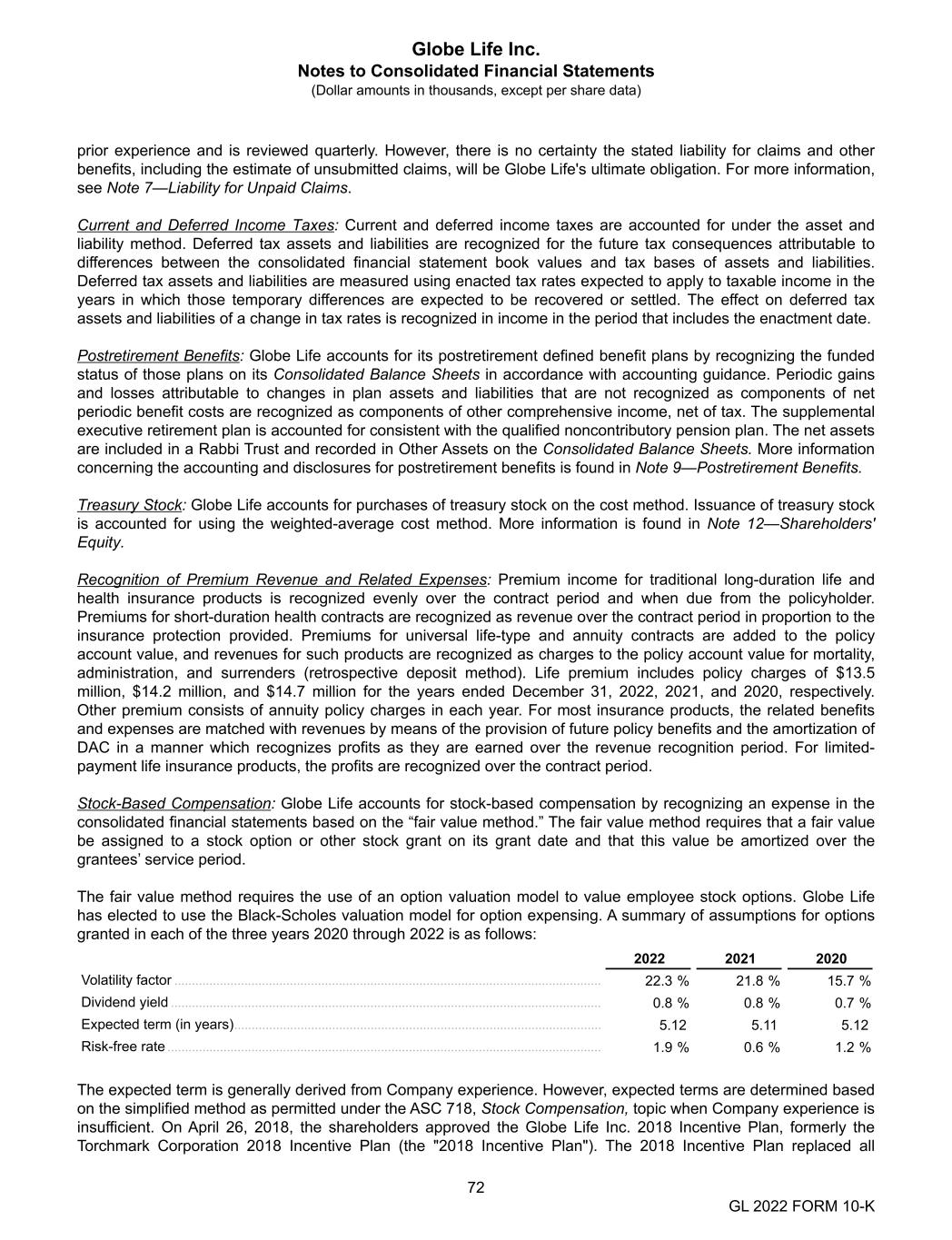 prior experience and is reviewed quarterly. However, there is no certainty the stated liability for claims and other benefits, including the estimate of unsubmitted claims, will be Globe Life's ultimate obligation. For more information, see Note 7—Liability for Unpaid Claims. Current and Deferred Income Taxes: Current and deferred income taxes are accounted for under the asset and liability method. Deferred tax assets and liabilities are recognized for the future tax consequences attributable to differences between the consolidated financial statement book values and tax bases of assets and liabilities. Deferred tax assets and liabilities are measured using enacted tax rates expected to apply to taxable income in the years in which those temporary differences are expected to be recovered or settled. The effect on deferred tax assets and liabilities of a change in tax rates is recognized in income in the period that includes the enactment date. Postretirement Benefits: Globe Life accounts for its postretirement defined benefit plans by recognizing the funded status of those plans on its Consolidated Balance Sheets in accordance with accounting guidance. Periodic gains and losses attributable to changes in plan assets and liabilities that are not recognized as components of net periodic benefit costs are recognized as components of other comprehensive income, net of tax. The supplemental executive retirement plan is accounted for consistent with the qualified noncontributory pension plan. The net assets are included in a Rabbi Trust and recorded in Other Assets on the Consolidated Balance Sheets. More information concerning the accounting and disclosures for postretirement benefits is found in Note 9—Postretirement Benefits. Treasury Stock: Globe Life accounts for purchases of treasury stock on the cost method. Issuance of treasury stock is accounted for using the weighted-average cost method. More information is found in Note 12—Shareholders' Equity. Recognition of Premium Revenue and Related Expenses: Premium income for traditional long-duration life and health insurance products is recognized evenly over the contract period and when due from the policyholder. Premiums for short-duration health contracts are recognized as revenue over the contract period in proportion to the insurance protection provided. Premiums for universal life-type and annuity contracts are added to the policy account value, and revenues for such products are recognized as charges to the policy account value for mortality, administration, and surrenders (retrospective deposit method). Life premium includes policy charges of $13.5 million, $14.2 million, and $14.7 million for the years ended December 31, 2022, 2021, and 2020, respectively. Other premium consists of annuity policy charges in each year. For most insurance products, the related benefits and expenses are matched with revenues by means of the provision of future policy benefits and the amortization of DAC in a manner which recognizes profits as they are earned over the revenue recognition period. For limited- payment life insurance products, the profits are recognized over the contract period. Stock-Based Compensation: Globe Life accounts for stock-based compensation by recognizing an expense in the consolidated financial statements based on the “fair value method.” The fair value method requires that a fair value be assigned to a stock option or other stock grant on its grant date and that this value be amortized over the grantees’ service period. The fair value method requires the use of an option valuation model to value employee stock options. Globe Life has elected to use the Black-Scholes valuation model for option expensing. A summary of assumptions for options granted in each of the three years 2020 through 2022 is as follows: 2022 2021 2020 Volatility factor .......................................................................................................................... 22.3 % 21.8 % 15.7 % Dividend yield ........................................................................................................................... 0.8 % 0.8 % 0.7 % Expected term (in years)......................................................................................................... 5.12 5.11 5.12 Risk-free rate ............................................................................................................................ 1.9 % 0.6 % 1.2 % The expected term is generally derived from Company experience. However, expected terms are determined based on the simplified method as permitted under the ASC 718, Stock Compensation, topic when Company experience is insufficient. On April 26, 2018, the shareholders approved the Globe Life Inc. 2018 Incentive Plan, formerly the Torchmark Corporation 2018 Incentive Plan (the "2018 Incentive Plan"). The 2018 Incentive Plan replaced all Globe Life Inc. Notes to Consolidated Financial Statements (Dollar amounts in thousands, except per share data) 72 GL 2022 FORM 10-K