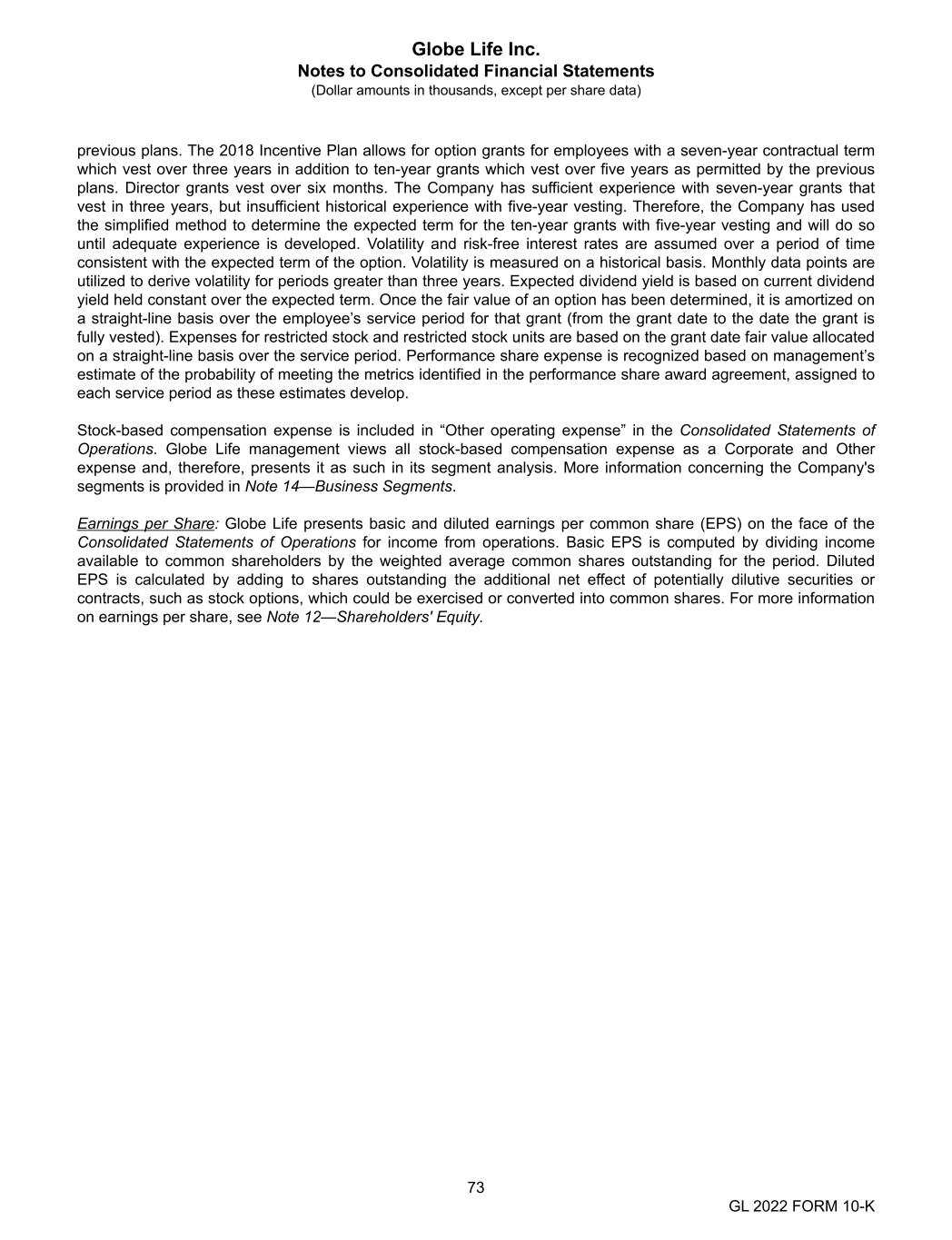 previous plans. The 2018 Incentive Plan allows for option grants for employees with a seven-year contractual term which vest over three years in addition to ten-year grants which vest over five years as permitted by the previous plans. Director grants vest over six months. The Company has sufficient experience with seven-year grants that vest in three years, but insufficient historical experience with five-year vesting. Therefore, the Company has used the simplified method to determine the expected term for the ten-year grants with five-year vesting and will do so until adequate experience is developed. Volatility and risk-free interest rates are assumed over a period of time consistent with the expected term of the option. Volatility is measured on a historical basis. Monthly data points are utilized to derive volatility for periods greater than three years. Expected dividend yield is based on current dividend yield held constant over the expected term. Once the fair value of an option has been determined, it is amortized on a straight-line basis over the employee’s service period for that grant (from the grant date to the date the grant is fully vested). Expenses for restricted stock and restricted stock units are based on the grant date fair value allocated on a straight-line basis over the service period. Performance share expense is recognized based on management’s estimate of the probability of meeting the metrics identified in the performance share award agreement, assigned to each service period as these estimates develop. Stock-based compensation expense is included in “Other operating expense” in the Consolidated Statements of Operations. Globe Life management views all stock-based compensation expense as a Corporate and Other expense and, therefore, presents it as such in its segment analysis. More information concerning the Company's segments is provided in Note 14—Business Segments. Earnings per Share: Globe Life presents basic and diluted earnings per common share (EPS) on the face of the Consolidated Statements of Operations for income from operations. Basic EPS is computed by dividing income available to common shareholders by the weighted average common shares outstanding for the period. Diluted EPS is calculated by adding to shares outstanding the additional net effect of potentially dilutive securities or contracts, such as stock options, which could be exercised or converted into common shares. For more information on earnings per share, see Note 12—Shareholders' Equity. Globe Life Inc. Notes to Consolidated Financial Statements (Dollar amounts in thousands, except per share data) 73 GL 2022 FORM 10-K