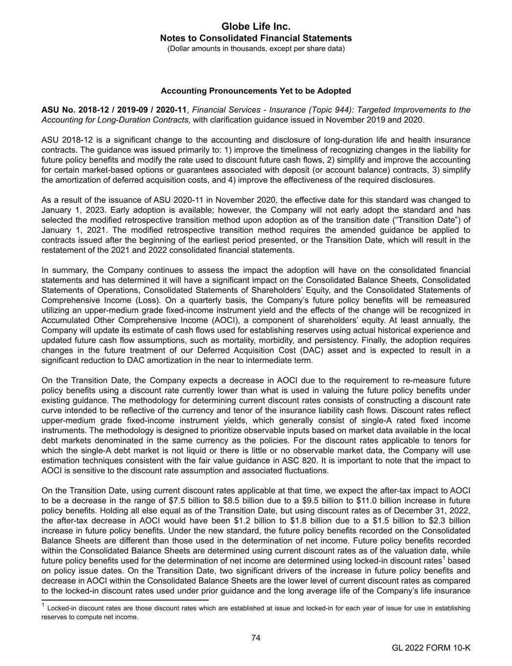 Accounting Pronouncements Yet to be Adopted ASU No. 2018-12 / 2019-09 / 2020-11, Financial Services - Insurance (Topic 944): Targeted Improvements to the Accounting for Long-Duration Contracts, with clarification guidance issued in November 2019 and 2020. ASU 2018-12 is a significant change to the accounting and disclosure of long-duration life and health insurance contracts. The guidance was issued primarily to: 1) improve the timeliness of recognizing changes in the liability for future policy benefits and modify the rate used to discount future cash flows, 2) simplify and improve the accounting for certain market-based options or guarantees associated with deposit (or account balance) contracts, 3) simplify the amortization of deferred acquisition costs, and 4) improve the effectiveness of the required disclosures. As a result of the issuance of ASU 2020-11 in November 2020, the effective date for this standard was changed to January 1, 2023. Early adoption is available; however, the Company will not early adopt the standard and has selected the modified retrospective transition method upon adoption as of the transition date (“Transition Date”) of January 1, 2021. The modified retrospective transition method requires the amended guidance be applied to contracts issued after the beginning of the earliest period presented, or the Transition Date, which will result in the restatement of the 2021 and 2022 consolidated financial statements. In summary, the Company continues to assess the impact the adoption will have on the consolidated financial statements and has determined it will have a significant impact on the Consolidated Balance Sheets, Consolidated Statements of Operations, Consolidated Statements of Shareholders’ Equity, and the Consolidated Statements of Comprehensive Income (Loss). On a quarterly basis, the Company’s future policy benefits will be remeasured utilizing an upper-medium grade fixed-income instrument yield and the effects of the change will be recognized in Accumulated Other Comprehensive Income (AOCI), a component of shareholders’ equity. At least annually, the Company will update its estimate of cash flows used for establishing reserves using actual historical experience and updated future cash flow assumptions, such as mortality, morbidity, and persistency. Finally, the adoption requires changes in the future treatment of our Deferred Acquisition Cost (DAC) asset and is expected to result in a significant reduction to DAC amortization in the near to intermediate term. On the Transition Date, the Company expects a decrease in AOCI due to the requirement to re-measure future policy benefits using a discount rate currently lower than what is used in valuing the future policy benefits under existing guidance. The methodology for determining current discount rates consists of constructing a discount rate curve intended to be reflective of the currency and tenor of the insurance liability cash flows. Discount rates reflect upper-medium grade fixed-income instrument yields, which generally consist of single-A rated fixed income instruments. The methodology is designed to prioritize observable inputs based on market data available in the local debt markets denominated in the same currency as the policies. For the discount rates applicable to tenors for which the single-A debt market is not liquid or there is little or no observable market data, the Company will use estimation techniques consistent with the fair value guidance in ASC 820. It is important to note that the impact to AOCI is sensitive to the discount rate assumption and associated fluctuations. On the Transition Date, using current discount rates applicable at that time, we expect the after-tax impact to AOCI to be a decrease in the range of $7.5 billion to $8.5 billion due to a $9.5 billion to $11.0 billion increase in future policy benefits. Holding all else equal as of the Transition Date, but using discount rates as of December 31, 2022, the after-tax decrease in AOCI would have been $1.2 billion to $1.8 billion due to a $1.5 billion to $2.3 billion increase in future policy benefits. Under the new standard, the future policy benefits recorded on the Consolidated Balance Sheets are different than those used in the determination of net income. Future policy benefits recorded within the Consolidated Balance Sheets are determined using current discount rates as of the valuation date, while future policy benefits used for the determination of net income are determined using locked-in discount rates1 based on policy issue dates. On the Transition Date, two significant drivers of the increase in future policy benefits and decrease in AOCI within the Consolidated Balance Sheets are the lower level of current discount rates as compared to the locked-in discount rates used under prior guidance and the long average life of the Company’s life insurance Globe Life Inc. Notes to Consolidated Financial Statements (Dollar amounts in thousands, except per share data) 74 GL 2022 FORM 10-K 1 Locked-in discount rates are those discount rates which are established at issue and locked-in for each year of issue for use in establishing reserves to compute net income.
