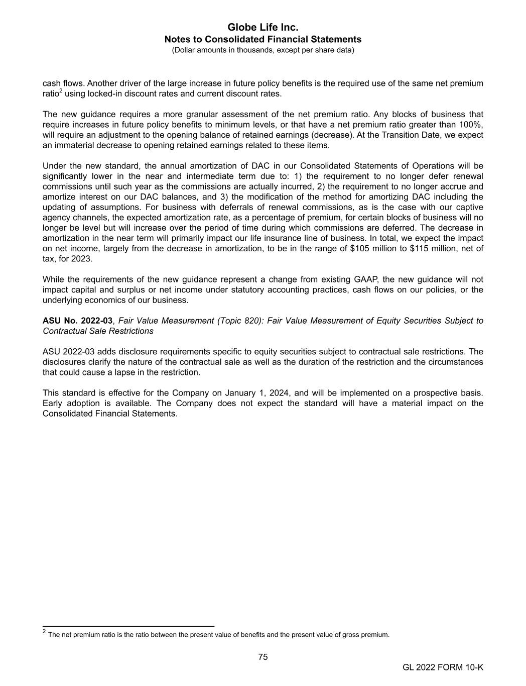 cash flows. Another driver of the large increase in future policy benefits is the required use of the same net premium ratio2 using locked-in discount rates and current discount rates. The new guidance requires a more granular assessment of the net premium ratio. Any blocks of business that require increases in future policy benefits to minimum levels, or that have a net premium ratio greater than 100%, will require an adjustment to the opening balance of retained earnings (decrease). At the Transition Date, we expect an immaterial decrease to opening retained earnings related to these items. Under the new standard, the annual amortization of DAC in our Consolidated Statements of Operations will be significantly lower in the near and intermediate term due to: 1) the requirement to no longer defer renewal commissions until such year as the commissions are actually incurred, 2) the requirement to no longer accrue and amortize interest on our DAC balances, and 3) the modification of the method for amortizing DAC including the updating of assumptions. For business with deferrals of renewal commissions, as is the case with our captive agency channels, the expected amortization rate, as a percentage of premium, for certain blocks of business will no longer be level but will increase over the period of time during which commissions are deferred. The decrease in amortization in the near term will primarily impact our life insurance line of business. In total, we expect the impact on net income, largely from the decrease in amortization, to be in the range of $105 million to $115 million, net of tax, for 2023. While the requirements of the new guidance represent a change from existing GAAP, the new guidance will not impact capital and surplus or net income under statutory accounting practices, cash flows on our policies, or the underlying economics of our business. ASU No. 2022-03, Fair Value Measurement (Topic 820): Fair Value Measurement of Equity Securities Subject to Contractual Sale Restrictions ASU 2022-03 adds disclosure requirements specific to equity securities subject to contractual sale restrictions. The disclosures clarify the nature of the contractual sale as well as the duration of the restriction and the circumstances that could cause a lapse in the restriction. This standard is effective for the Company on January 1, 2024, and will be implemented on a prospective basis. Early adoption is available. The Company does not expect the standard will have a material impact on the Consolidated Financial Statements. Globe Life Inc. Notes to Consolidated Financial Statements (Dollar amounts in thousands, except per share data) 75 GL 2022 FORM 10-K 2 The net premium ratio is the ratio between the present value of benefits and the present value of gross premium.