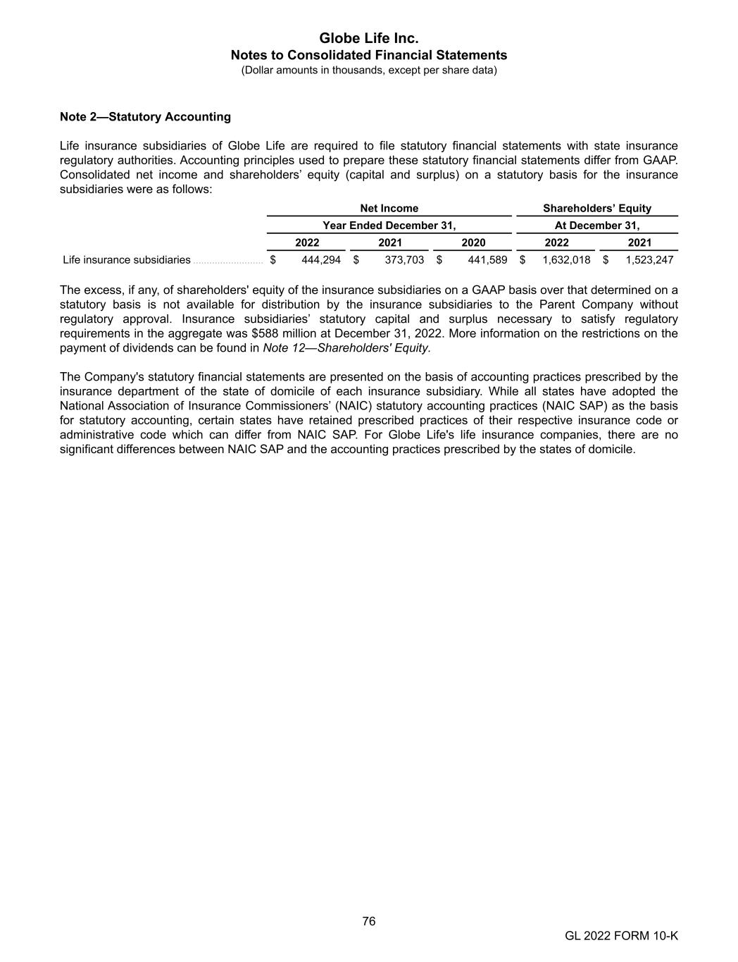 Note 2—Statutory Accounting Life insurance subsidiaries of Globe Life are required to file statutory financial statements with state insurance regulatory authorities. Accounting principles used to prepare these statutory financial statements differ from GAAP. Consolidated net income and shareholders’ equity (capital and surplus) on a statutory basis for the insurance subsidiaries were as follows: Net Income Shareholders’ Equity Year Ended December 31, At December 31, 2022 2021 2020 2022 2021 Life insurance subsidiaries .......................... $ 444,294 $ 373,703 $ 441,589 $ 1,632,018 $ 1,523,247 The excess, if any, of shareholders' equity of the insurance subsidiaries on a GAAP basis over that determined on a statutory basis is not available for distribution by the insurance subsidiaries to the Parent Company without regulatory approval. Insurance subsidiaries’ statutory capital and surplus necessary to satisfy regulatory requirements in the aggregate was $588 million at December 31, 2022. More information on the restrictions on the payment of dividends can be found in Note 12—Shareholders' Equity. The Company's statutory financial statements are presented on the basis of accounting practices prescribed by the insurance department of the state of domicile of each insurance subsidiary. While all states have adopted the National Association of Insurance Commissioners’ (NAIC) statutory accounting practices (NAIC SAP) as the basis for statutory accounting, certain states have retained prescribed practices of their respective insurance code or administrative code which can differ from NAIC SAP. For Globe Life's life insurance companies, there are no significant differences between NAIC SAP and the accounting practices prescribed by the states of domicile. Globe Life Inc. Notes to Consolidated Financial Statements (Dollar amounts in thousands, except per share data) 76 GL 2022 FORM 10-K