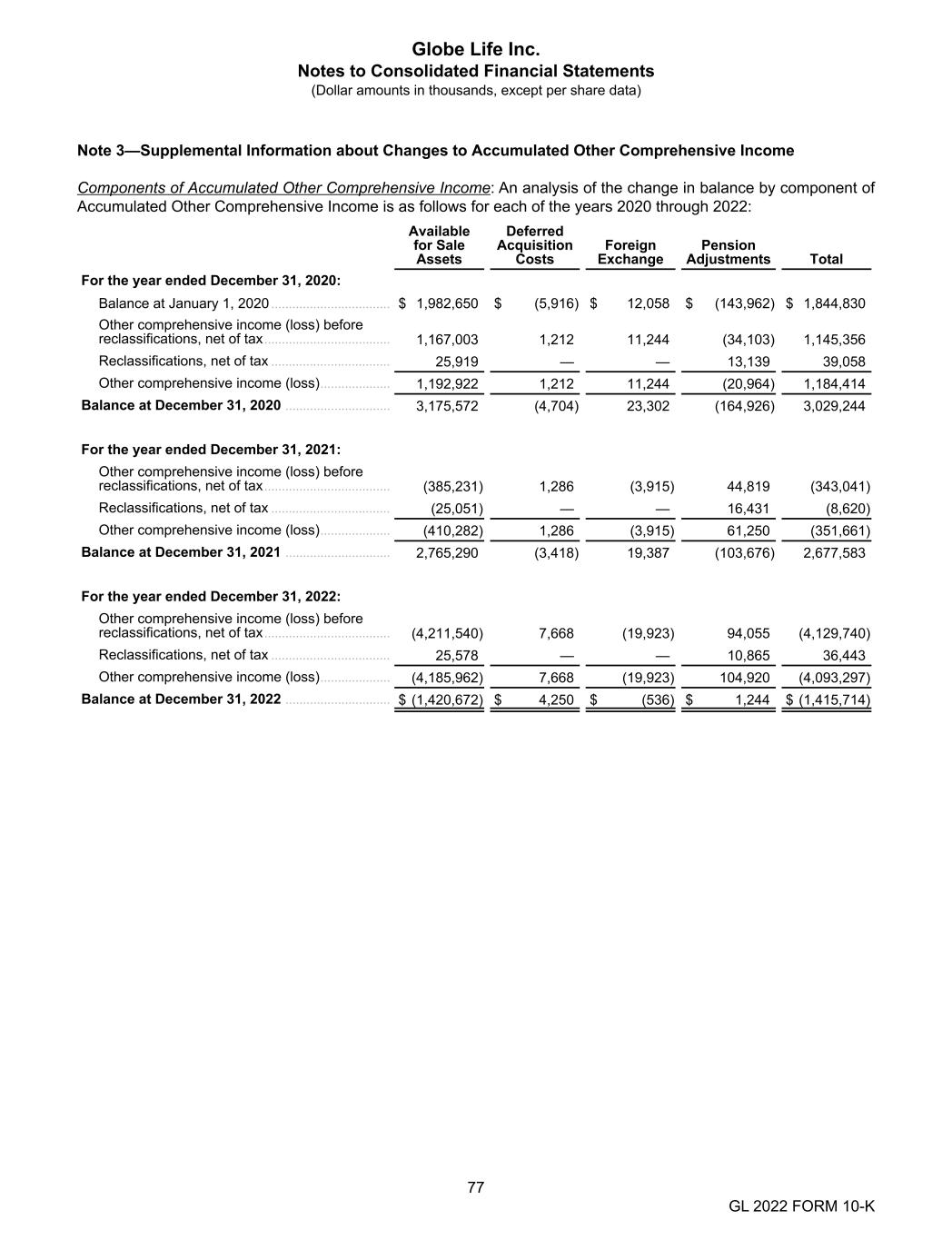 Note 3—Supplemental Information about Changes to Accumulated Other Comprehensive Income Components of Accumulated Other Comprehensive Income: An analysis of the change in balance by component of Accumulated Other Comprehensive Income is as follows for each of the years 2020 through 2022: Available for Sale Assets Deferred Acquisition Costs Foreign Exchange Pension Adjustments Total For the year ended December 31, 2020: Balance at January 1, 2020 .................................. $ 1,982,650 $ (5,916) $ 12,058 $ (143,962) $ 1,844,830 Other comprehensive income (loss) before reclassifications, net of tax .................................... 1,167,003 1,212 11,244 (34,103) 1,145,356 Reclassifications, net of tax .................................. 25,919 — — 13,139 39,058 Other comprehensive income (loss).................... 1,192,922 1,212 11,244 (20,964) 1,184,414 Balance at December 31, 2020 .............................. 3,175,572 (4,704) 23,302 (164,926) 3,029,244 For the year ended December 31, 2021: Other comprehensive income (loss) before reclassifications, net of tax .................................... (385,231) 1,286 (3,915) 44,819 (343,041) Reclassifications, net of tax .................................. (25,051) — — 16,431 (8,620) Other comprehensive income (loss).................... (410,282) 1,286 (3,915) 61,250 (351,661) Balance at December 31, 2021 .............................. 2,765,290 (3,418) 19,387 (103,676) 2,677,583 For the year ended December 31, 2022: Other comprehensive income (loss) before reclassifications, net of tax .................................... (4,211,540) 7,668 (19,923) 94,055 (4,129,740) Reclassifications, net of tax .................................. 25,578 — — 10,865 36,443 Other comprehensive income (loss).................... (4,185,962) 7,668 (19,923) 104,920 (4,093,297) Balance at December 31, 2022 .............................. $ (1,420,672) $ 4,250 $ (536) $ 1,244 $ (1,415,714) Globe Life Inc. Notes to Consolidated Financial Statements (Dollar amounts in thousands, except per share data) 77 GL 2022 FORM 10-K