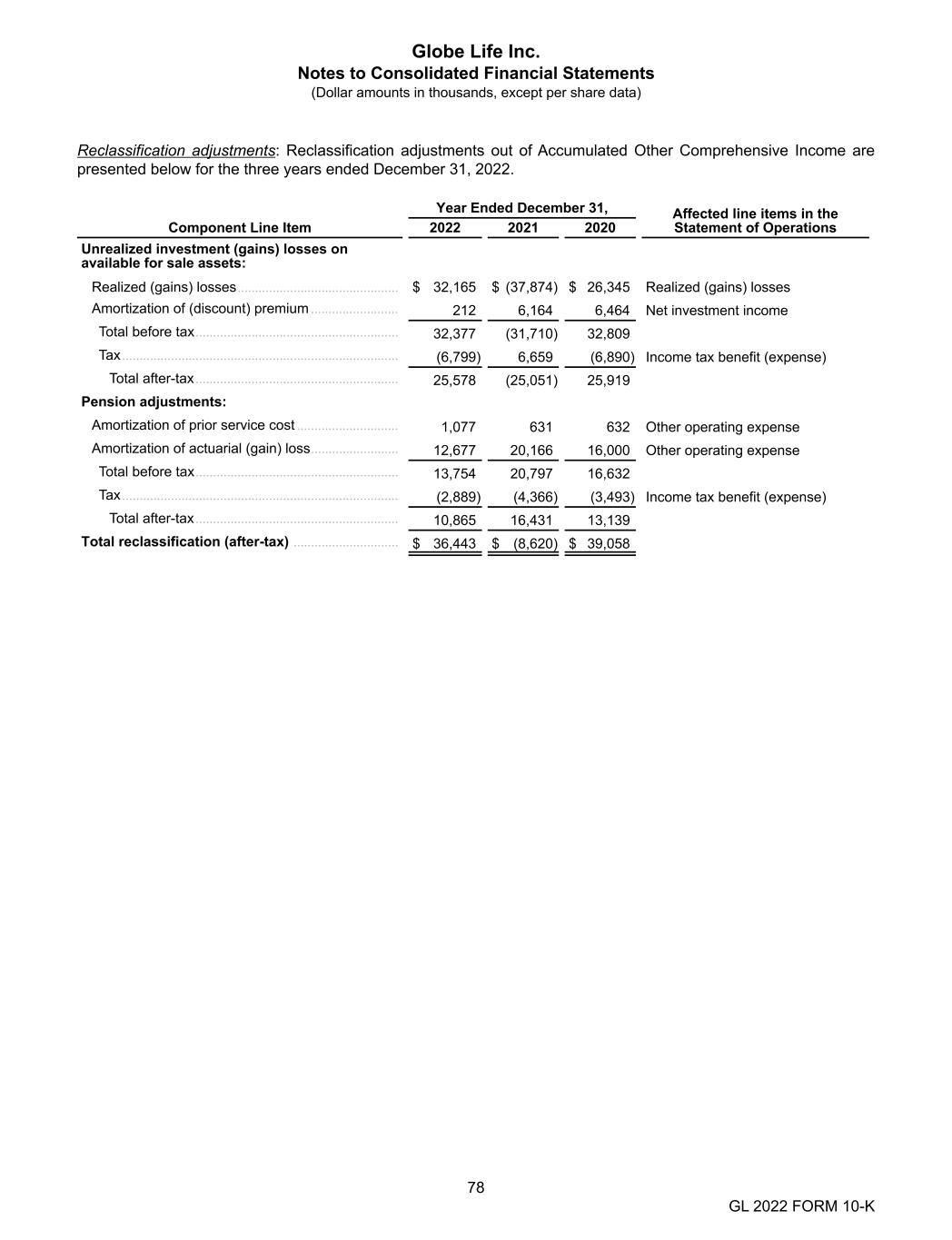 Reclassification adjustments: Reclassification adjustments out of Accumulated Other Comprehensive Income are presented below for the three years ended December 31, 2022. Year Ended December 31, Affected line items in the Statement of OperationsComponent Line Item 2022 2021 2020 Unrealized investment (gains) losses on available for sale assets: Realized (gains) losses.............................................. $ 32,165 $ (37,874) $ 26,345 Realized (gains) losses Amortization of (discount) premium ......................... 212 6,164 6,464 Net investment income Total before tax.......................................................... 32,377 (31,710) 32,809 Tax ............................................................................... (6,799) 6,659 (6,890) Income tax benefit (expense) Total after-tax .......................................................... 25,578 (25,051) 25,919 Pension adjustments: Amortization of prior service cost ............................. 1,077 631 632 Other operating expense Amortization of actuarial (gain) loss......................... 12,677 20,166 16,000 Other operating expense Total before tax.......................................................... 13,754 20,797 16,632 Tax ............................................................................... (2,889) (4,366) (3,493) Income tax benefit (expense) Total after-tax .......................................................... 10,865 16,431 13,139 Total reclassification (after-tax) .............................. $ 36,443 $ (8,620) $ 39,058 Globe Life Inc. Notes to Consolidated Financial Statements (Dollar amounts in thousands, except per share data) 78 GL 2022 FORM 10-K